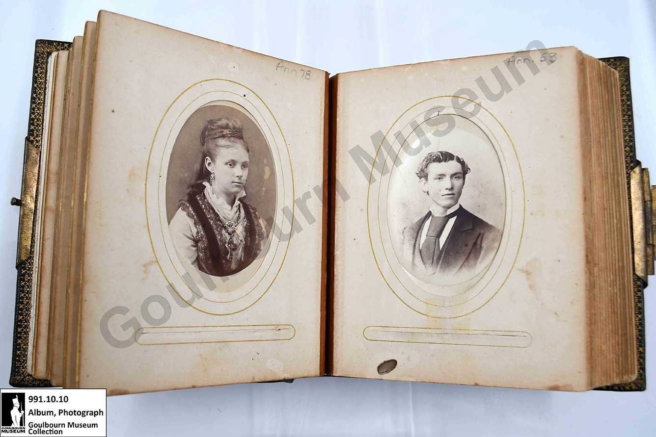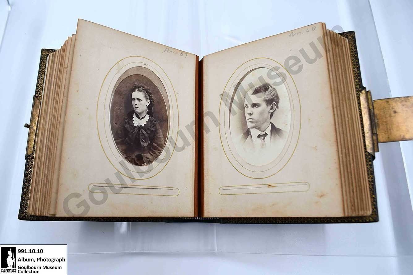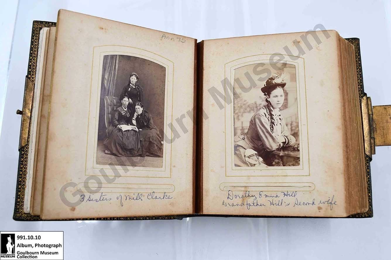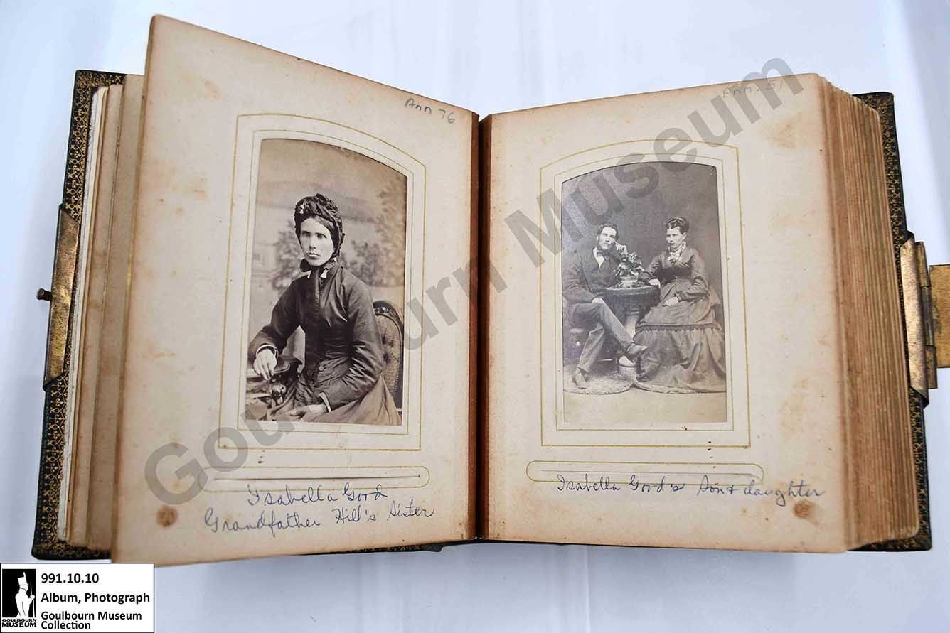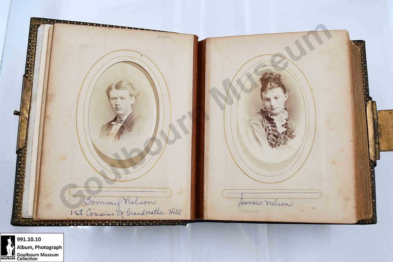 Presumed to have been created by Anna Maria Hill and inscribed by one of her grandchildren. At the beginning of the album is a photo of Francis Abbott. He and his wife Jane Dagg were born in Ireland and first settled in Nepean Township around 1822. Their daughter Sarah Ann married William Henry Butler and the family lived in Hazeldean. By the time of the 1871 Census Sarah and William's family made Richmond, Ontario their home. Sarah and William's daughter Anna Maria married James Rowland Hill in Richmond on June 10th 1874. This album, which was inscribed by one of their grandchildren, identifies the cousins, siblings, spouses, and acquaintances of the Butlers and Hills. The photos preserved inside the pages are albumen prints and tintypes that date from approximately the 1860s to 1880s. Anna Maria died June 20, 1882 at the age of 28 and is laid to rest in Richmond.Collection