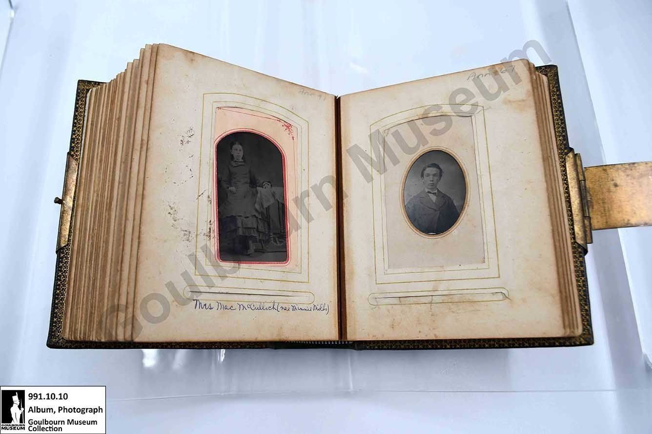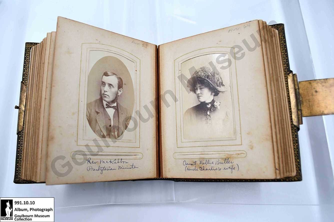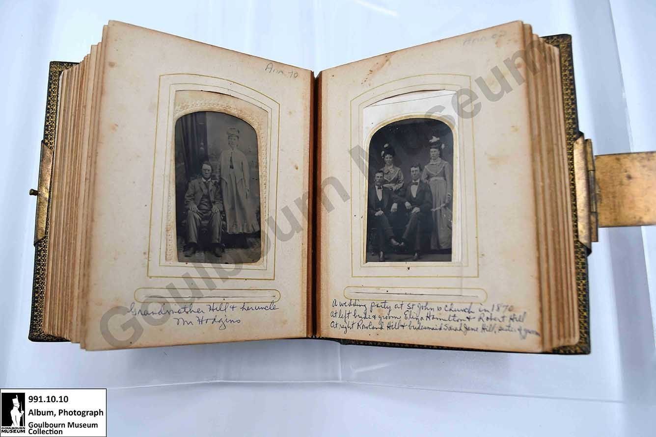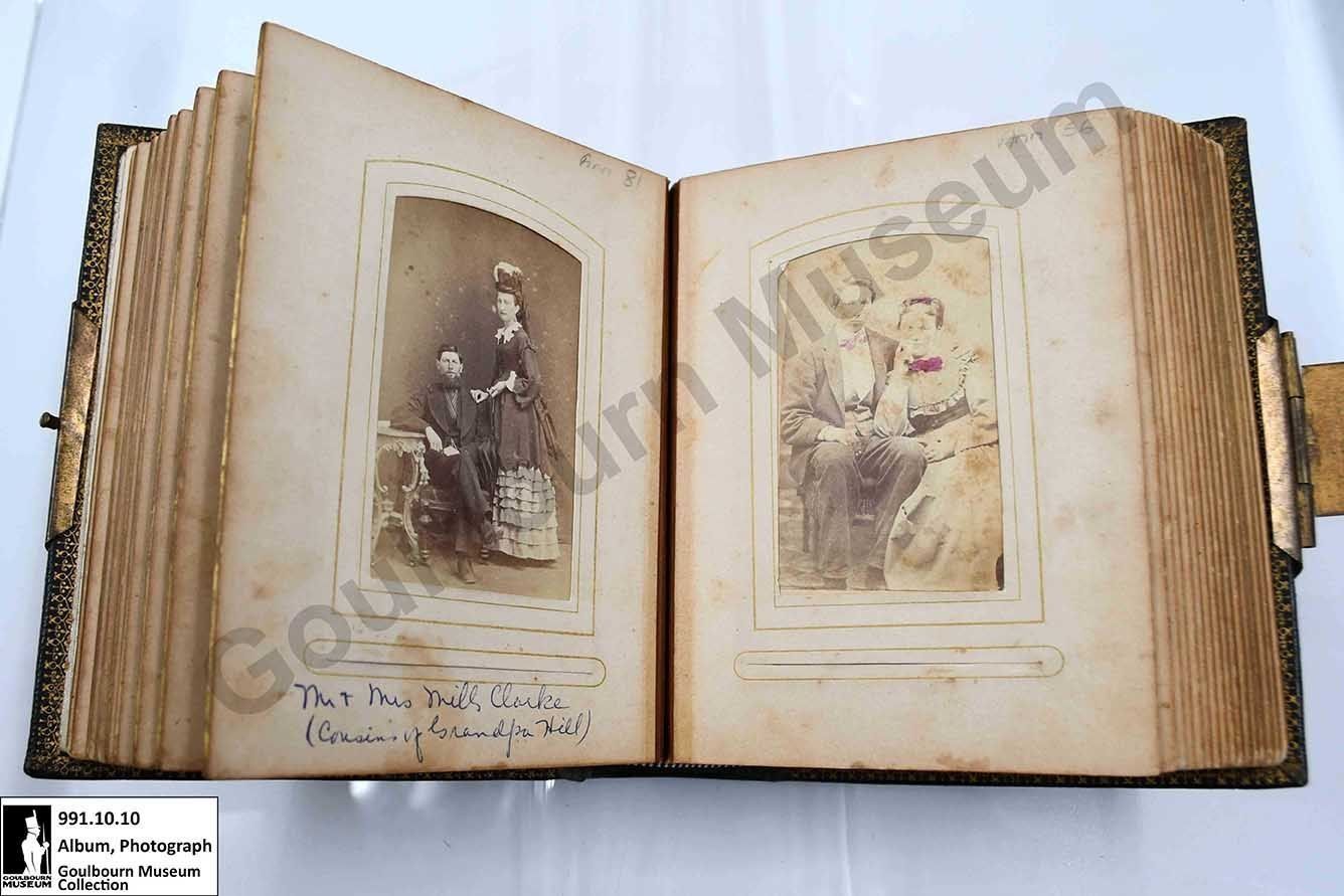 Presumed to have been created by Anna Maria Hill and inscribed by one of her grandchildren. At the beginning of the album is a photo of Francis Abbott. He and his wife Jane Dagg were born in Ireland and first settled in Nepean Township around 1822. Their daughter Sarah Ann married William Henry Butler and the family lived in Hazeldean. By the time of the 1871 Census Sarah and William's family made Richmond, Ontario their home. Sarah and William's daughter Anna Maria married James Rowland Hill in Richmond on June 10th 1874. This album, which was inscribed by one of their grandchildren, identifies the cousins, siblings, spouses, and acquaintances of the Butlers and Hills. The photos preserved inside the pages are albumen prints and tintypes that date from approximately the 1860s to 1880s. Anna Maria died June 20, 1882 at the age of 28 and is laid to rest in Richmond.Collection