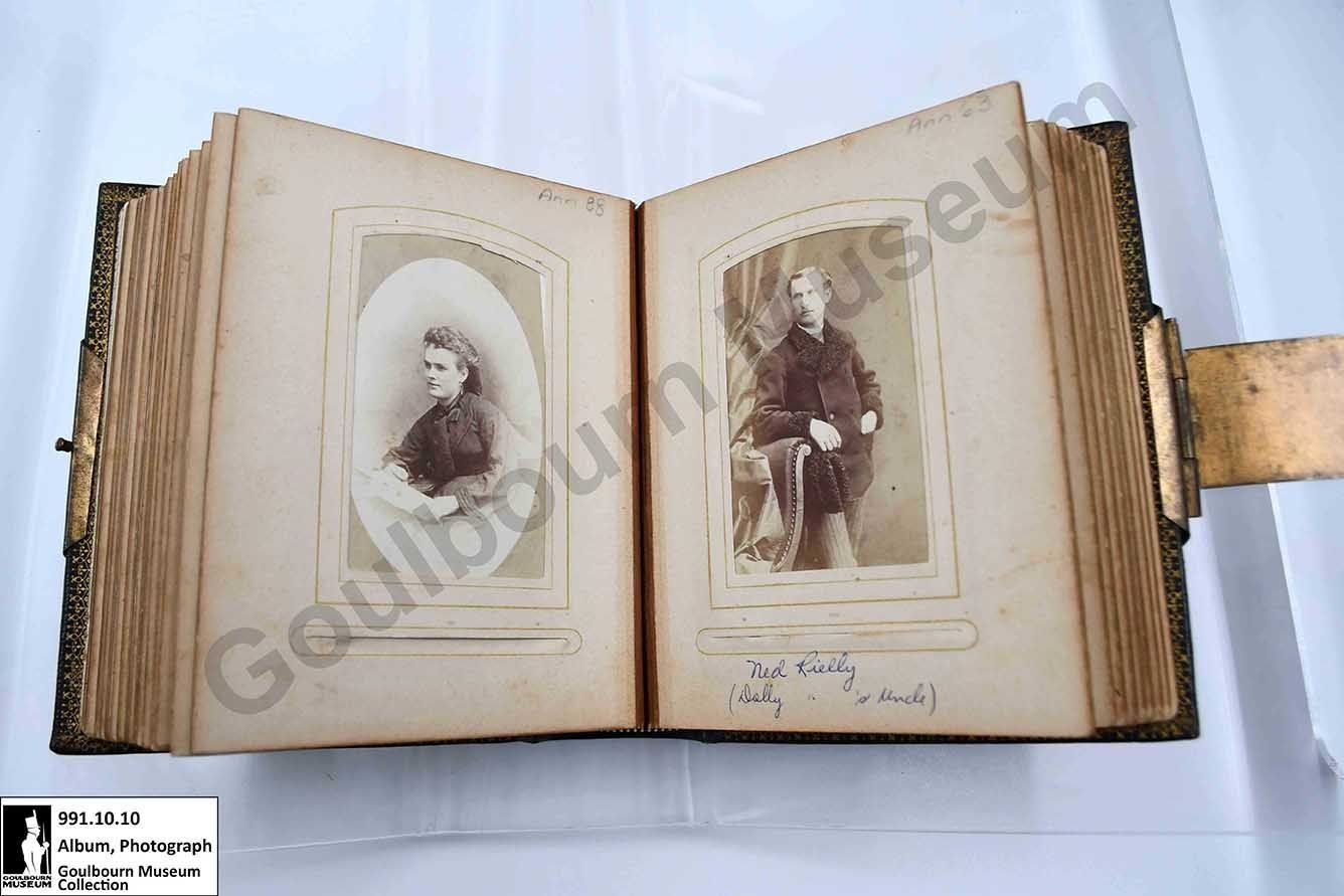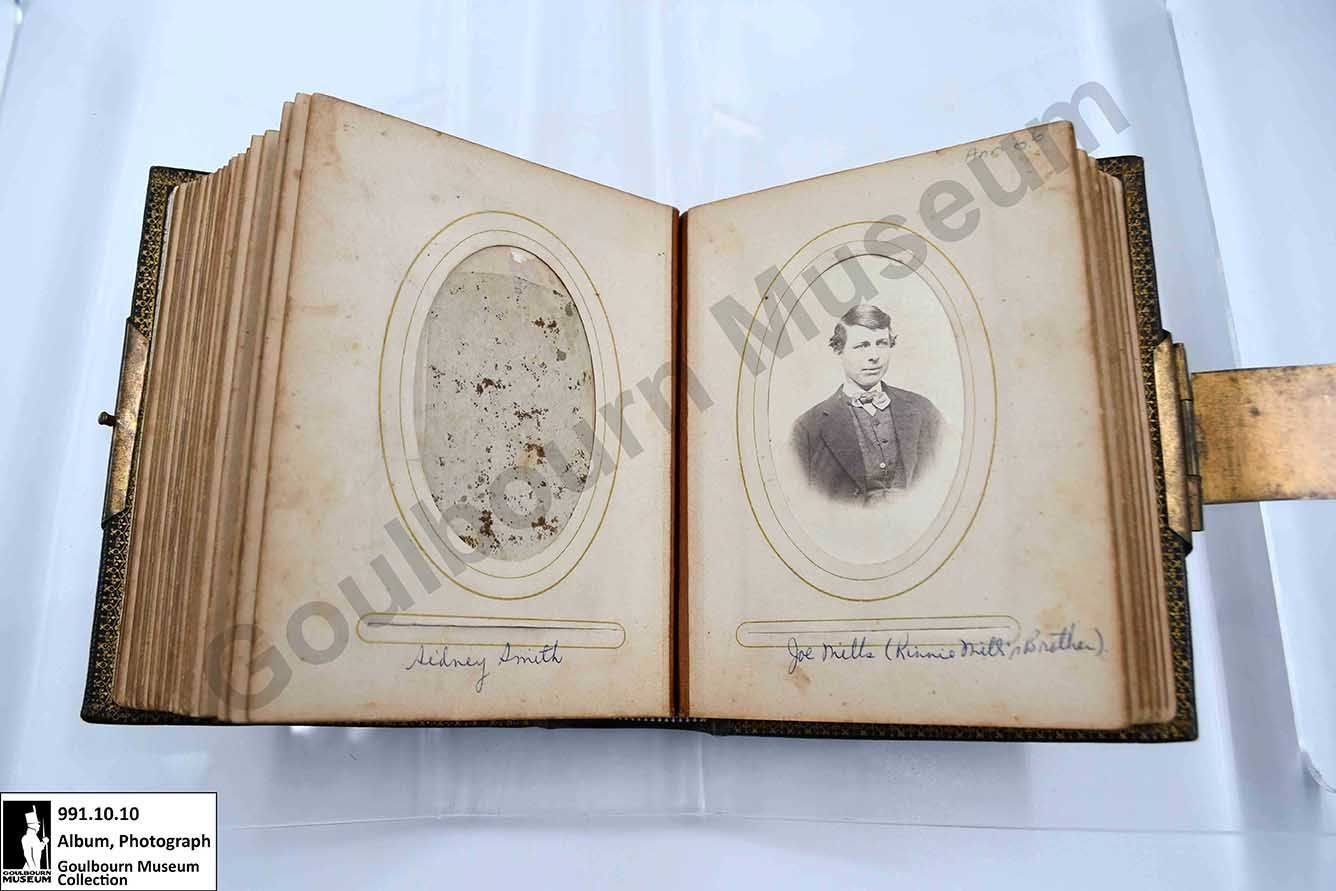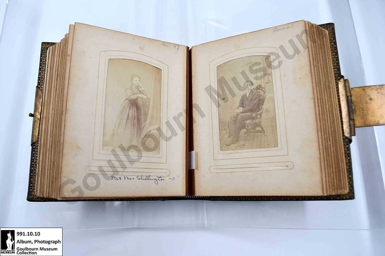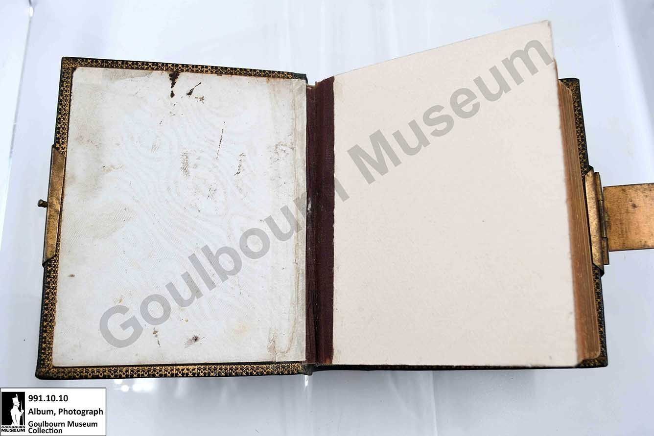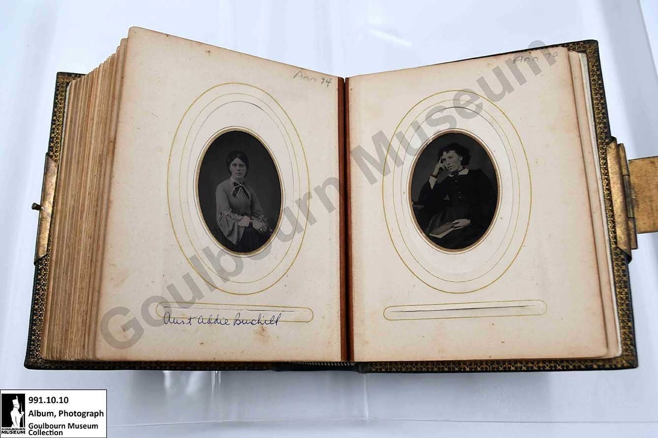 Presumed to have been created by Anna Maria Hill and inscribed by one of her grandchildren. At the beginning of the album is a photo of Francis Abbott. He and his wife Jane Dagg were born in Ireland and first settled in Nepean Township around 1822. Their daughter Sarah Ann married William Henry Butler and the family lived in Hazeldean. By the time of the 1871 Census Sarah and William's family made Richmond, Ontario their home. Sarah and William's daughter Anna Maria married James Rowland Hill in Richmond on June 10th 1874. This album, which was inscribed by one of their grandchildren, identifies the cousins, siblings, spouses, and acquaintances of the Butlers and Hills. The photos preserved inside the pages are albumen prints and tintypes that date from approximately the 1860s to 1880s. Anna Maria died June 20, 1882 at the age of 28 and is laid to rest in Richmond.Collection