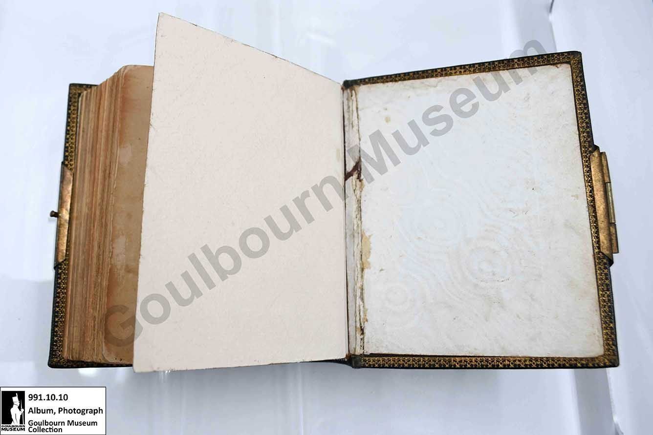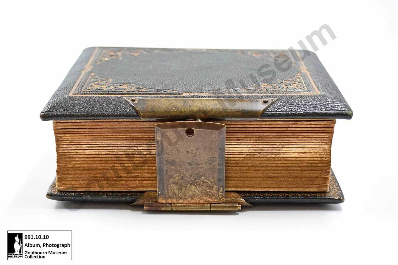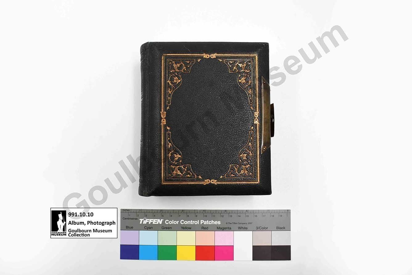 Dark coloured leather bound photograph album with gold coloured frame and floral decoration on front cover. The book has a hinge and clasp closure made of a brass coloured metal. Page edges have been coloured gold. Interior pages are made of a card material with framed openings on the front and back. Photographs are placed inside each of the framed. Those identified in the photographs include Francis Abbott, William Henry Butler, Sarah Ann Abbott Butler, Tommy Nelson, Emma Nelson, sisters of Mill Clarke, Dorothy Emma Hill, Isabella Good, Isabella Good's children, John Nelson, Esther Abbott Nelson, Harry Graham, Mrs. Dorothy Smith, Carrie Sweet, Mr & Mrs Mill Clarke, George McGuire, Wesley Hill, Rowland Hill, Brownlee Brothers, Emma Simpson, David and Ethel Ann Good, Benny Shillington, Abraham Pratt, Margaret Hill Pratt, Frank Butler, Mr and Mrs Shillington, Ned Rielly, Rev McKibbon, Nellie Butler, Eliza Hamilton, Robert Hill, Sarah Jane Hill, Joe Mills, Minnie Mills McCulloch, Harry MacDougall, Edward Mills, Isabel Hill Mills, Addie Buchill, Charlie Butler, Anna Maria Butler Hill.Context