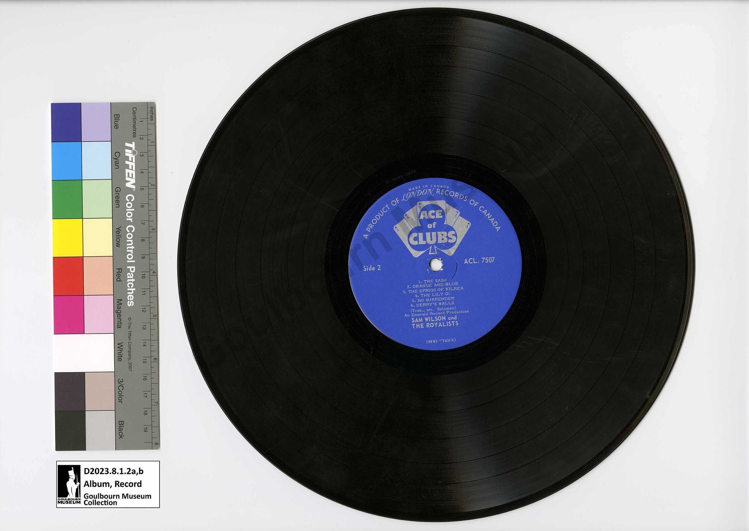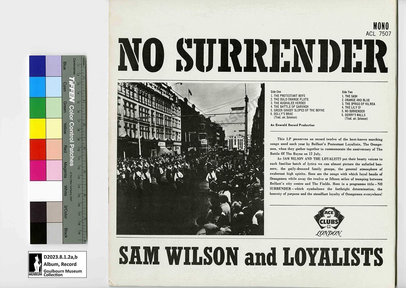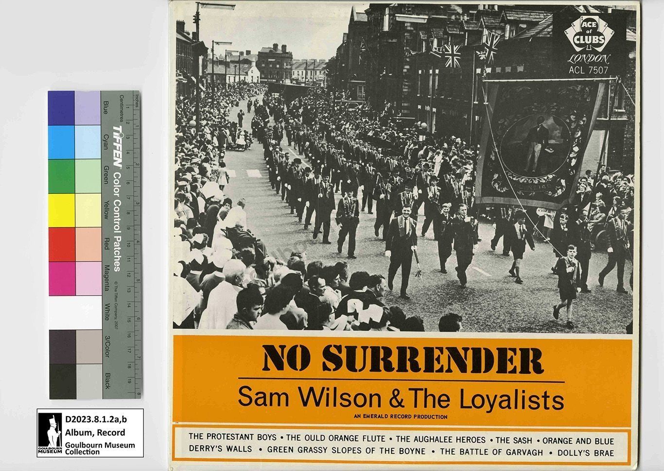 Cardboard record album cover has a black and white image of a Loyal Orange Lodge parade taking place on an urban streetscape on the front side with an orange rectangle filling the bottom quarter of the cover. Inside the orange rectangle is the text "No Surrender" "Sam Wilson & The Loyalists" "An Emerald Record Production" which is followed by a list of song titles Protestant Boys, The Ould Orange Flute, The Aughalee Heroes, The Sash, Orange and Blue, Derry's Walls, Green Grassy Slopes of the Boyne, The Battle of Garvagh, Dolly's Brae. The reverse side of the album cover has a white background with a black and white photograph of a Orange Order parade in the bottom left corner. The top right corner has block text that reads "MONO" " ACL 7507." In large text across the width of the album cover is "NO SURRENDER." Below the title is a list of songs on side a and side b of the record, Side One: 1.The Protestant Boys, 2. The Ould Orange Flute, 3. The Aughalee Heroes, 4. The Battle of Garvagh, 5. Green Grassy Slopes of the Boyne, 6. Dolly's Brae (Trad. arr. Solomon). Side 2: 1. The Sash, 2. Orange and Blue, 3. The Sprigs of Kilrea, 4. The Lily O!, 5. No Surrender, 6. Derry's Walls (Trad. arr. Solomon). Following the song titles is a text block which reads, "This LP preserves on record twelve of the best-known marching songs used each year by Belfast's Protestant Loyalists, The Orangemen, when they gather together to commemorate the anniversary of The Battle of the Boyne on 12 July. As SAM WILSON AND THE LOYALISTS put their hearty voices to each familiar batch of lyrics we can almost picture the unfurled banners, the gaily-dressed family groups, the general atmosphere of exuberant high spirits. Here are the songs with which loyal bands of Orangemen while away the twelve or fifteen miles of tramping between Belfast's city centre and The Fields. Here is a programme title - NO SURRENDER - which symbolises the forthright determination, the honesty of purpose and the steadfast loyalty of Orangemen everywhere!" Following the text block and centered underneath is a corporate logo for "Ace of Clubs London" the logo is in black and white, consists of five playing cards spread out, each of the five cards has a face value of the ace, in the centre card a club symbol covers the width of the cards, inside the club logo is the Ace of Clubs font, below in sytlized script is LONDON. The final aspect of the back cover is large black block text which records the artist name, "SAM WILSON and LOYALISTS."Context