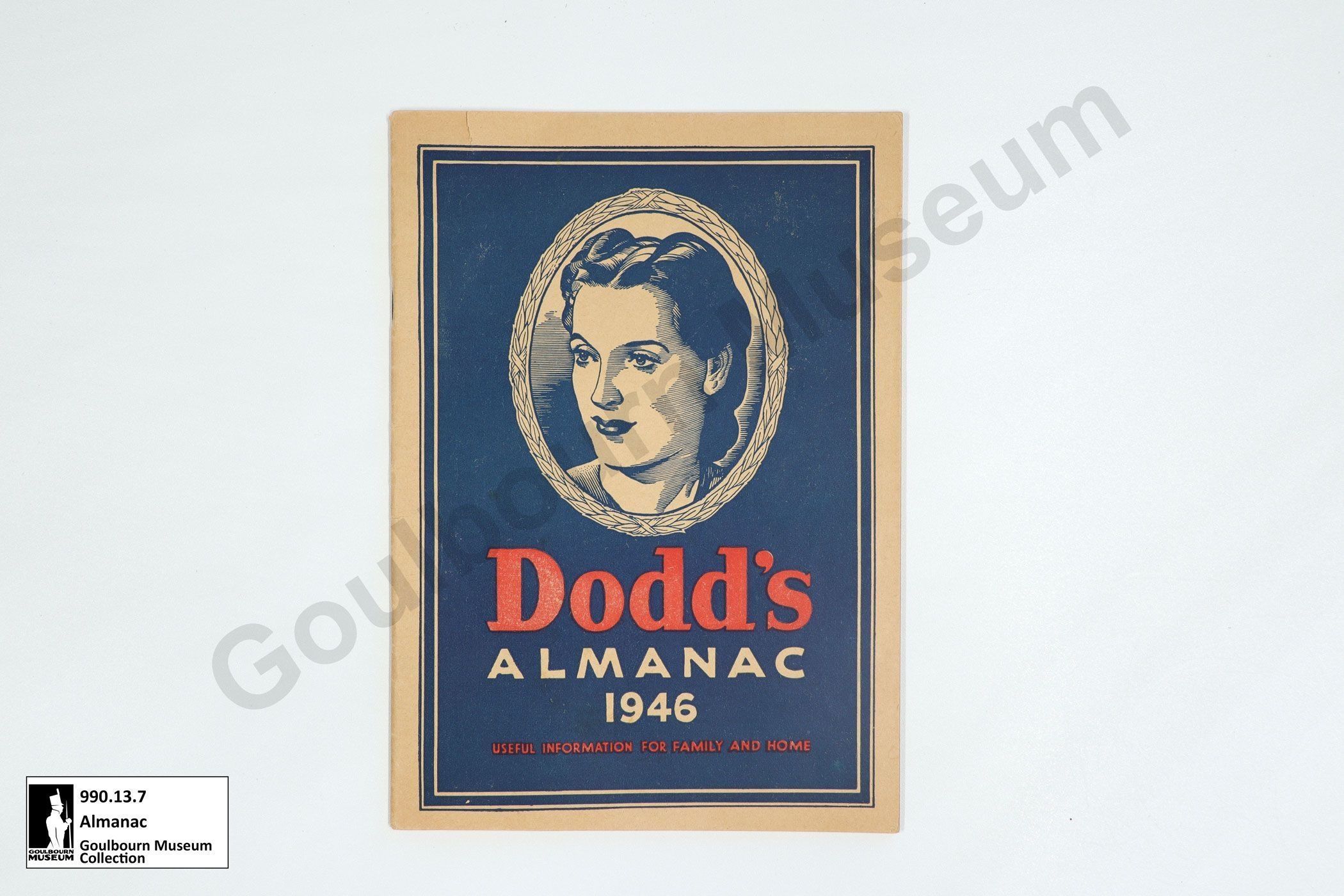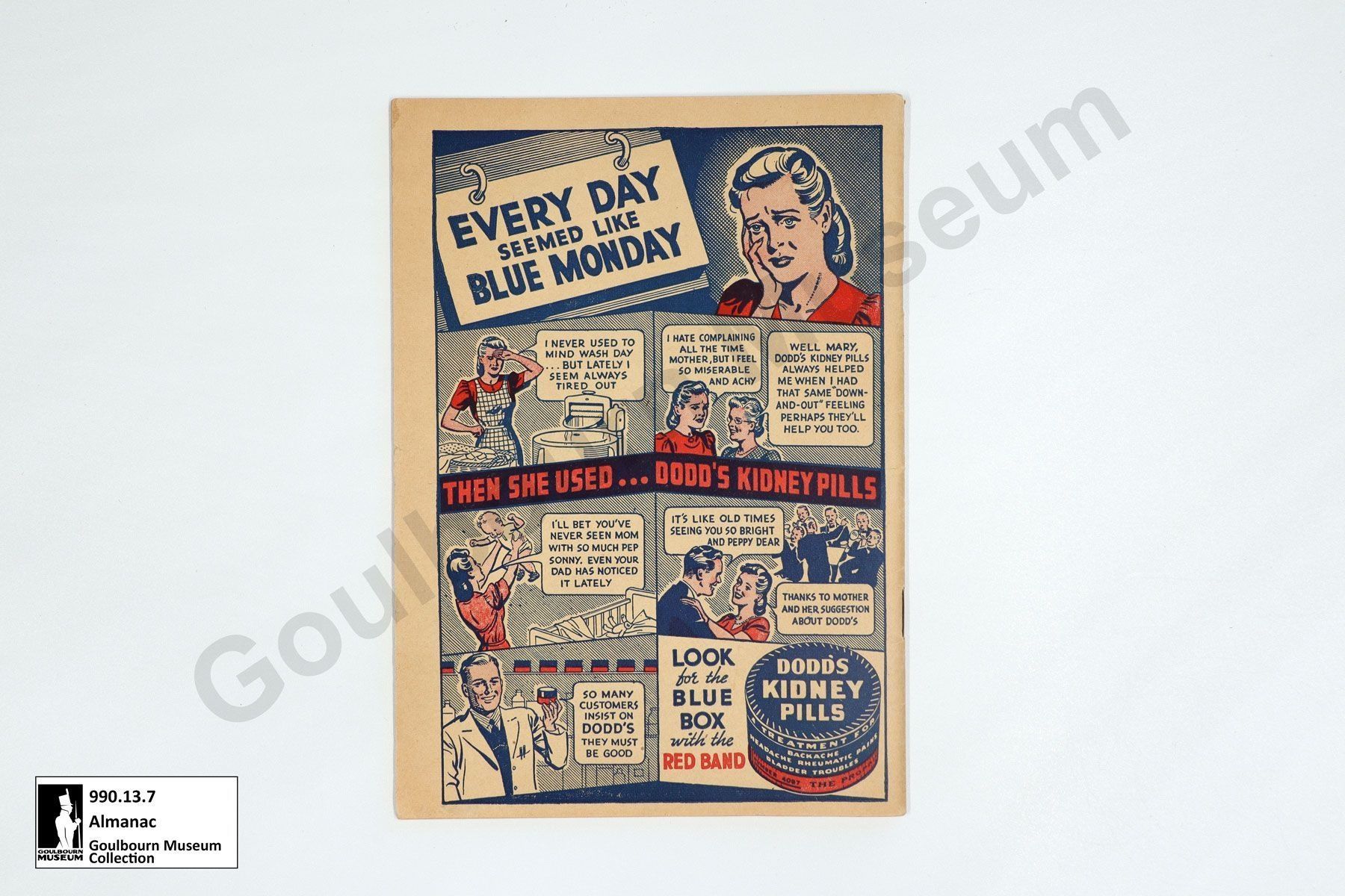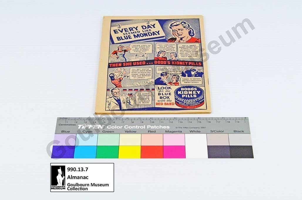 This object is "Dodd's Almanac" for 1946. It is a softcover book made of paper. The spine is executed via saddle stitch. The cover features a blue rectangle with a decorative border which occupies the majority of the space. The upper center of the cover displays a woman's face in an oblique view, oriented to the proper right; the face is surrounded by a wreath. The face and wreathe are rendered in blue ink using negative space to create white elements. Below the face is the word "Dodd's" in red ink centered on the page. Below this is the word "ALMANAC" in all capital white letters. Below almanac is the numeral "1946" rendered in white negative space. Below 1946 the phrase "USEFUL INFORMATION FOR FAMILY AND HOME" is rendered in a smaller font, in red ink, in all capital letters. The back cover features an 8 paneled comic-style advertisement for "Dodd's Kidney Pills". The comic is titled "EVERY DAY SEEMED LIKE BLUE MONDAY" at the top of the page. The comic is rendered in red, black, and blue inks. The comic depicts a woman afflicted with tiredness. She is recommended the pills by her mother after which she makes a full recovery. The final panels at the bottom feature a doctor praising the pills at bottom left and an advertisement in the bottom right.Lexicon