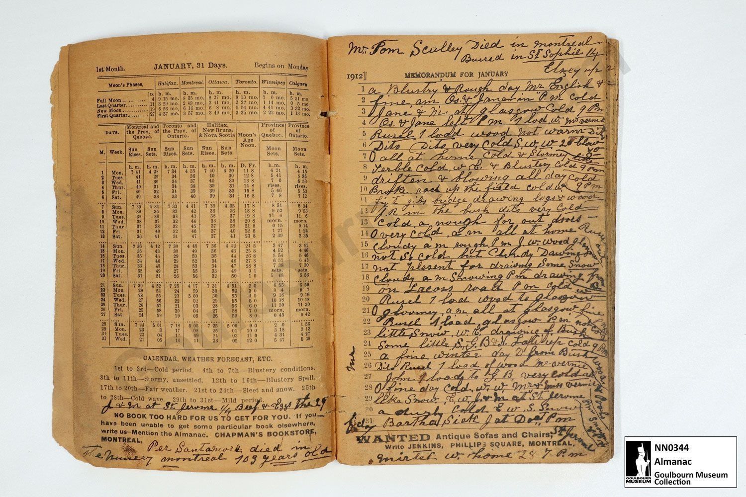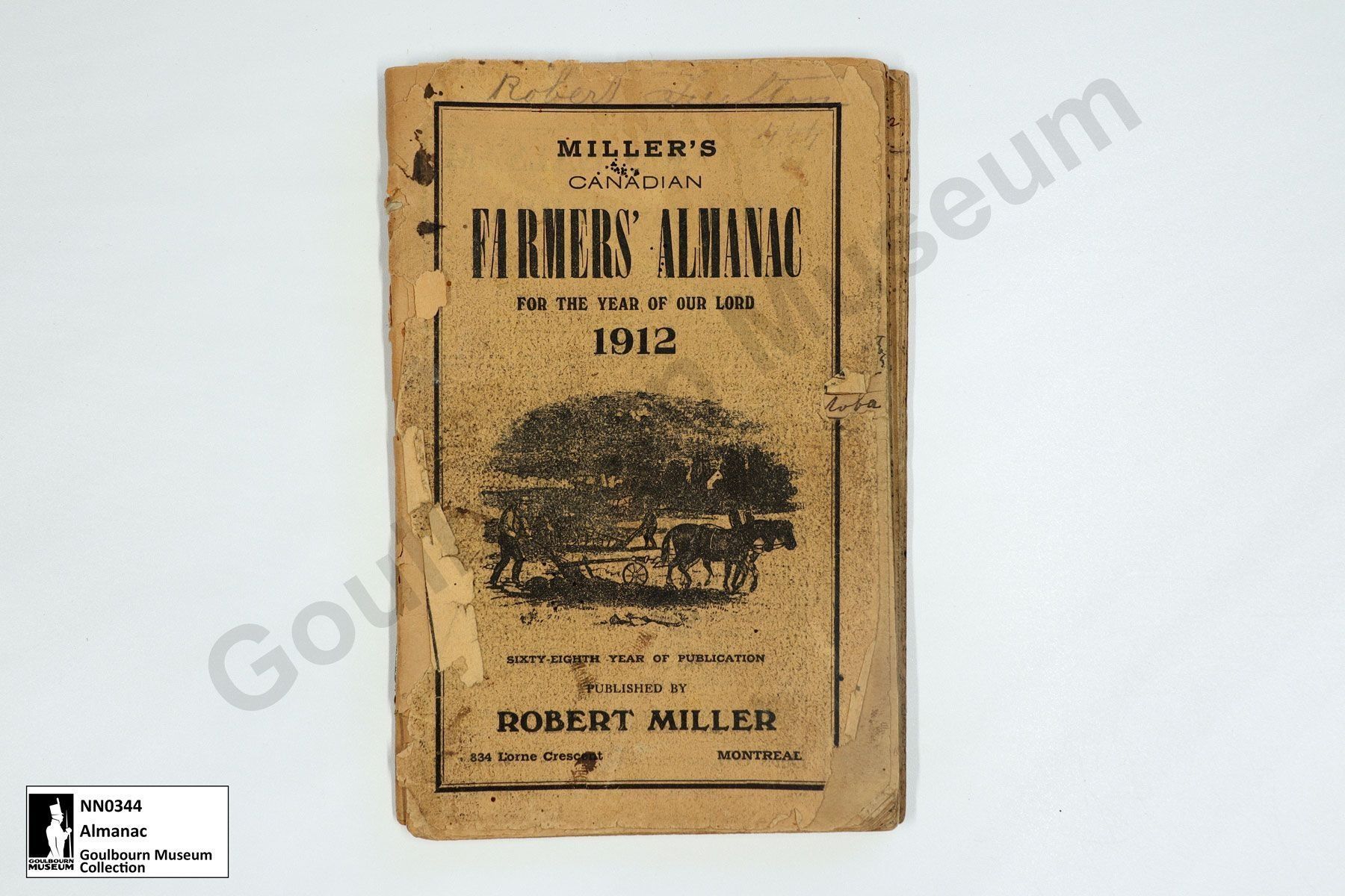 A small booklet with yellowed pages and black in. The front cover reads "Miller's Canadian Farmers' Almanac for the year of Our Lord 1912" "Sixty-Eighth Year of Publication/Published by Robert Miller" with an illustration of farmers ploughing a field. Inside the book has ads for farming tools, tips for animal raising and crop yielding, and a place to make notes about the yields during the farming season.