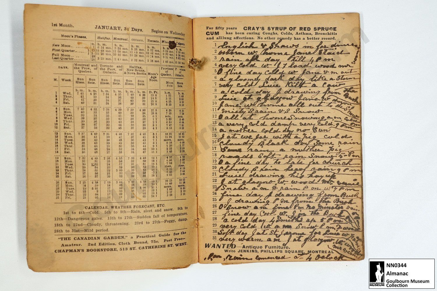 This almanac has daily notes regarding the weather and special occasions written in ink by the owner.