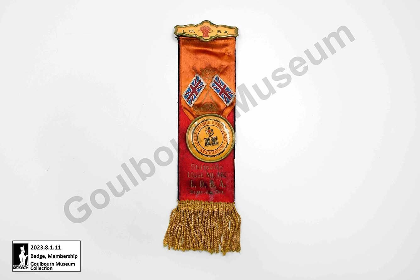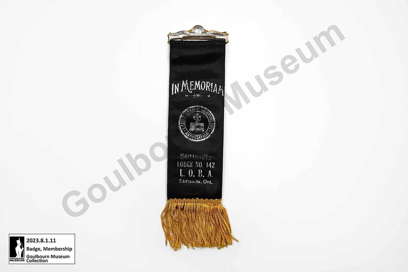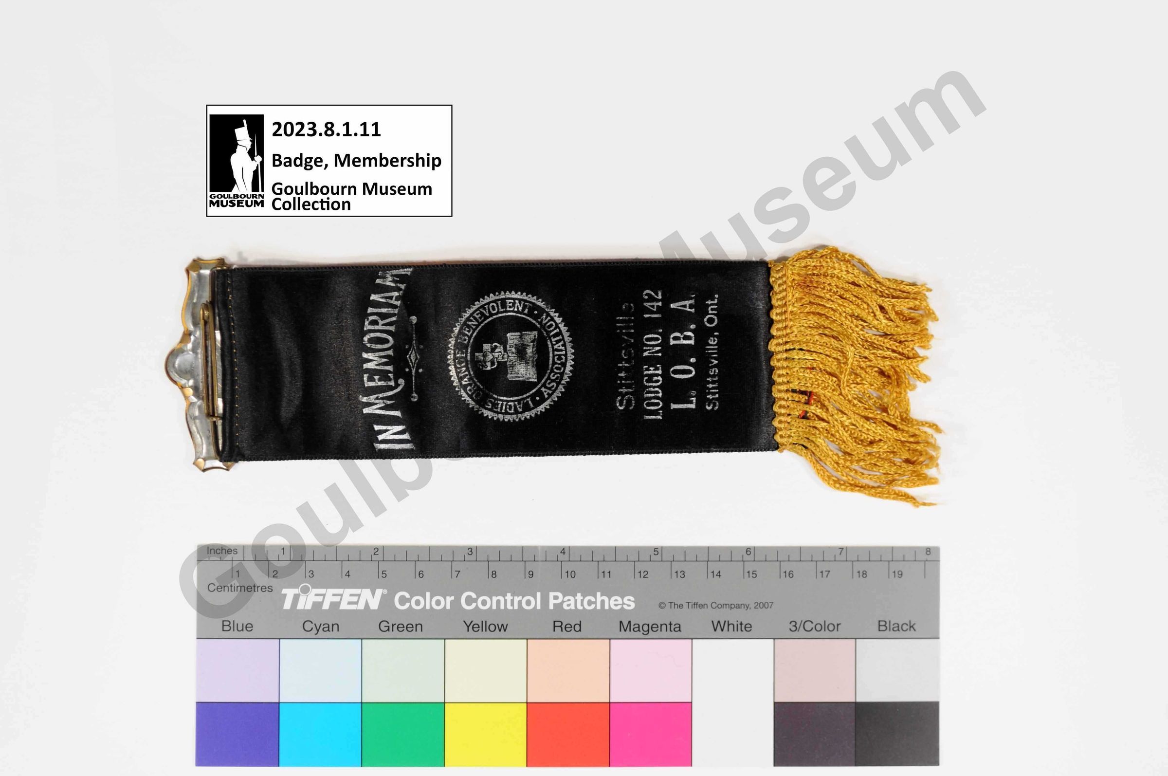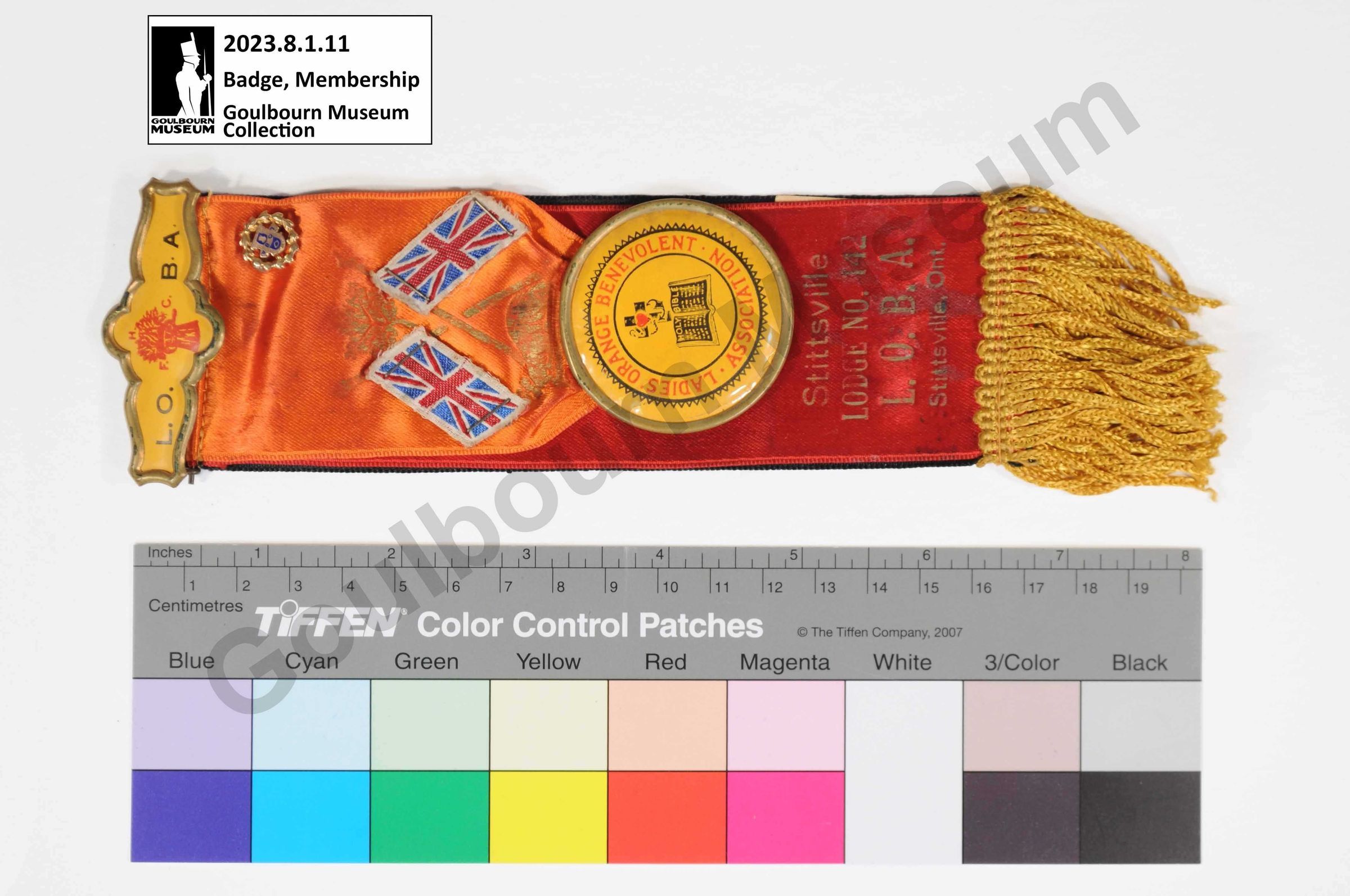 Membership badge worn to identify a member of the Ladies Orange Benevolent Association (LOBA) in Stittsville. The Stittsville LOBA was identified as Stittsville Lodge number 142. The badge has a metal bar with a pin on the reverse located along the top edge, it has a decorative shape with L.O. printed on the left side, a central image of a bundle of grain with the letters F. H. C., and the letters B.A. printed on the right side. The badge extends vertically with a vibrant red fabric ribbon as the base, the top of the badge has an orange ribbon sewn on top of the red ribbon and extending to the half way point in the badge. At the middle of the badge the orange ribbon is gathered to form a triangle shape and is attached to the reverse of a circular button. The orange ribbon is decorated with a crossed flags motif, two fabric Union Flag appliques are attached on either side of a gold metallic printed crossed flag pole design. The Union Flags are attached to the orange ribbon material with four metal staples. The central button has an outer yellow coloured metal base with an inner yellow badge made up of a central image of a bible opened with the pages displayed, and a cross image that has a red heart image on top along with what appears to be a ship's anchor behind the cross. Around the central motif is a black circular line, around the line are red coloured block text which reads, "Ladies' Orange Benevolent Association ." A black line decorated with a repeating triangle pattern forms the outer border of the button. The bottom of the red ribbon has a printed design which reads, "Stittsville LODGE NO. 142 L.O.B.A Stittsville, Ont." The final design element is a yellow coloured fabric tassel border made of braided yellow thread. On the reverse of the badge the top bar has a visible pin attached, the ribbon on this side of the badge is black coloured fabric and contains less decoration. The ribbon has a printed design which includes the words, "IN MEMORIAM" at the top, a decorative line border is placed horizontally under the text, the centre contains a printed version of the button located on the front of the badge, this version has the open bible, cross, heart, and anchor motif in the middle, a line border around the design, the words "LADIES ORANGE BENEVOLENT . ASSOCIATION." around the circumference of the design, and a repeating line with triangle pattern as the outside of the design. The bottom of the badge has text which reads, "Stittsville LODGE NO. 142 L.O.B.A. Stittsville, Ont." The bottom of the badge is decorated with a tassel edge made up of braided yellow fabric thread.Context