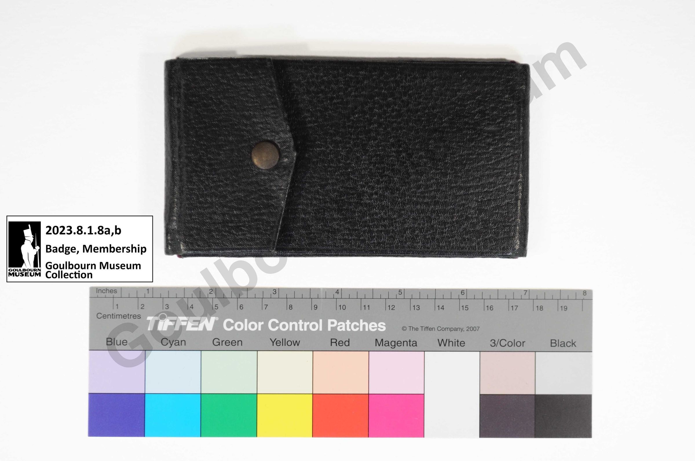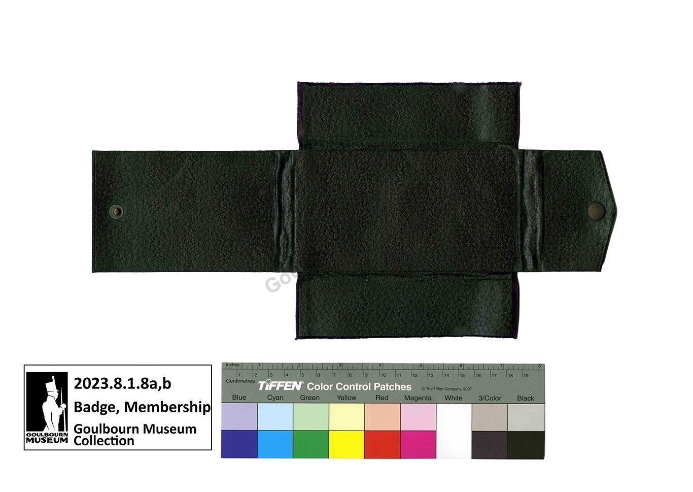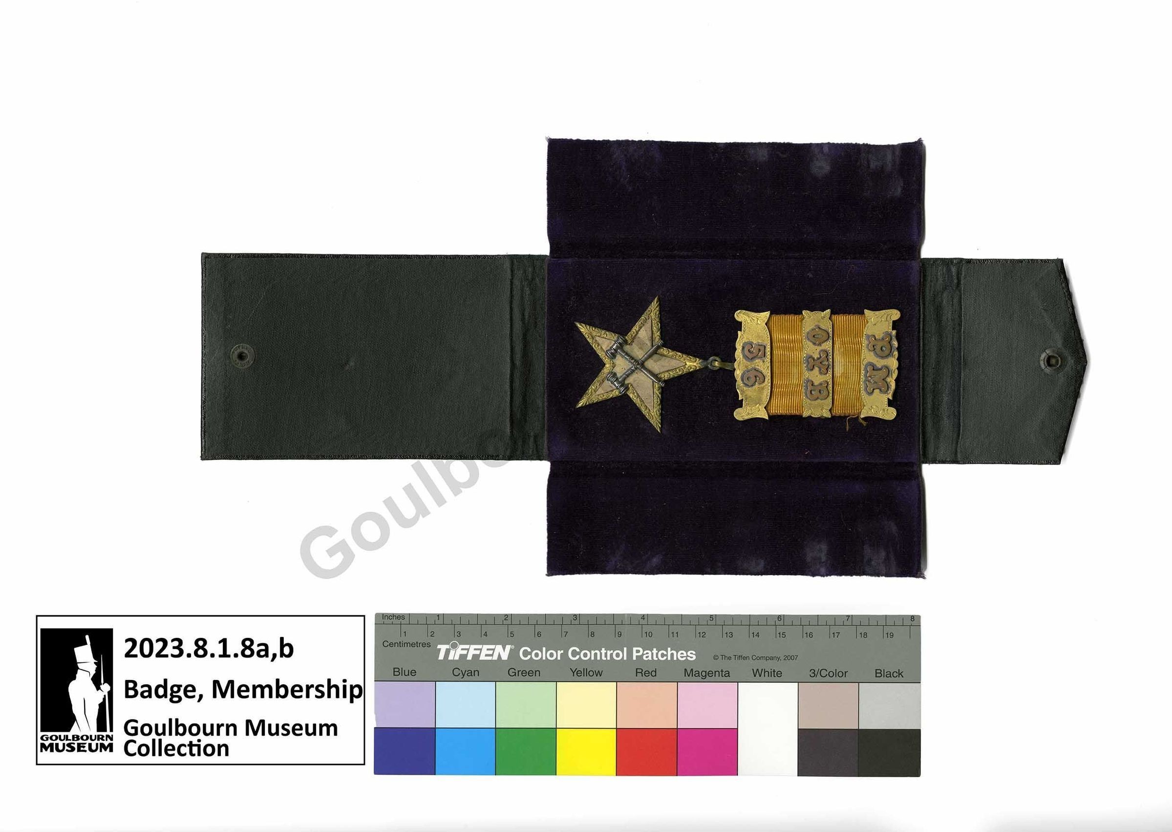 The artefact is two pieces, a. case and b. badge. The case is made of a black leather covered card with deep purple coloured velvet in the interior. A central rectangle the dimensions of the badge has four flaps, one arranged at each side of the rectangle. The left and right flaps are lined with velvet and are placed on top of the badge, then the bottom folds over top and the top is folded last. The bottom and top flaps have one metal snap which secures the case when closed. The exterior of the case has a slight texture or pattern, with no distinguishing markings or inscriptions.