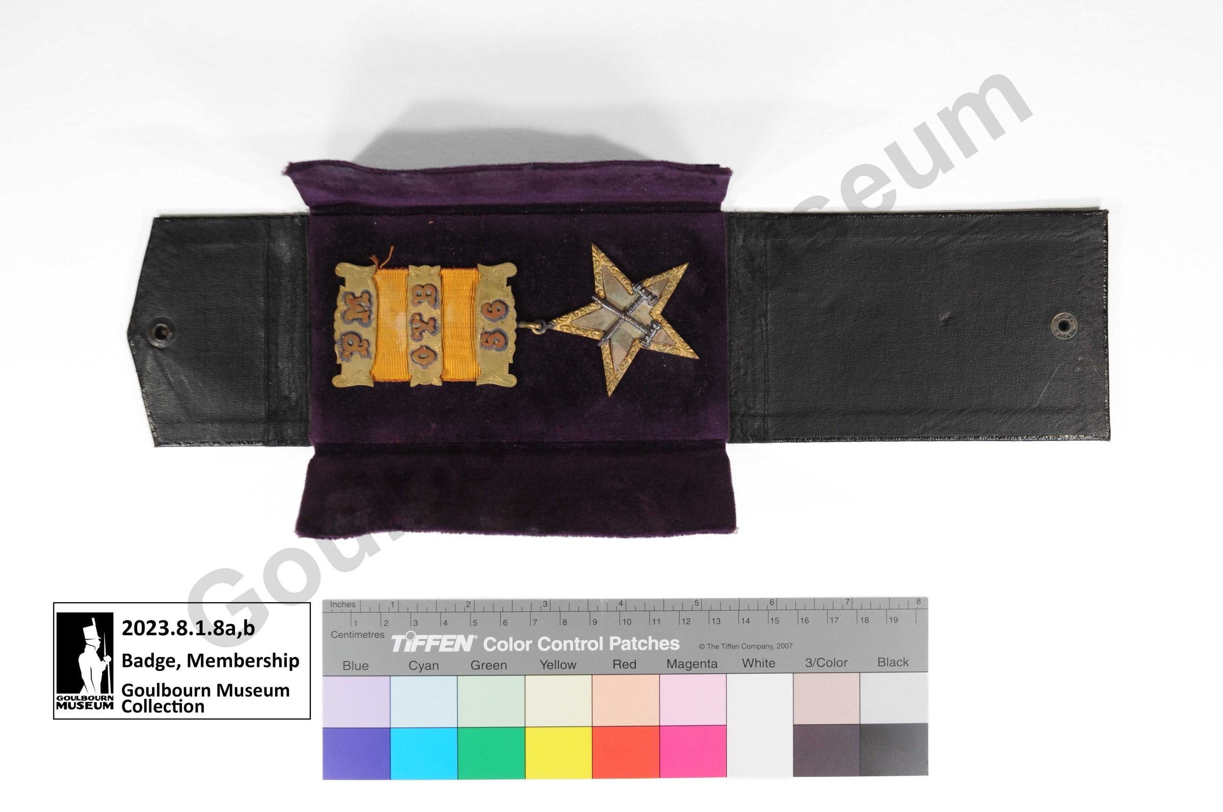 b. The badge is pinned inside of the case. The top of the badge is made of orange coloured ribbon with three evenly spaced metal bars, creating a bar, ribbon, bar, ribbon, bar pattern. The top bar has "PM" in a decorative block script, the middle "OYB", and the bottom bar has "56." The characters have been adhered to the surface of the badge and are slightly raised. The bottom of the badge is shaped as a five-point star which is connected to the badge with two attached eye hooks. The star has a decorative motif in yellow coloured metal around the edges with a interior star defined in a contrasting brown-grey coloured metal. Two gavels crossed in an "x" at their midpoints, with the gavel heads facing down, are adhered to the centre of the star.Context