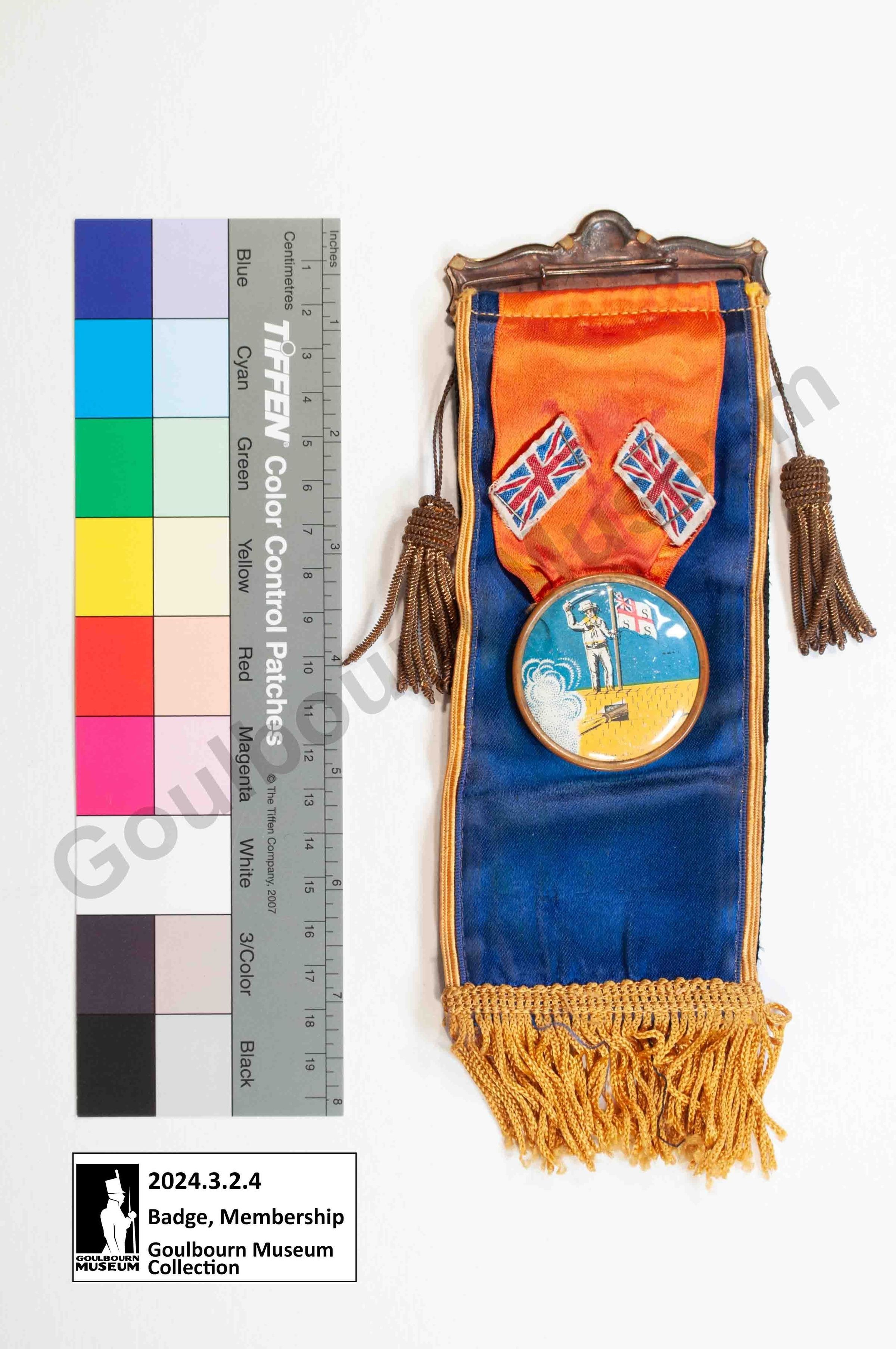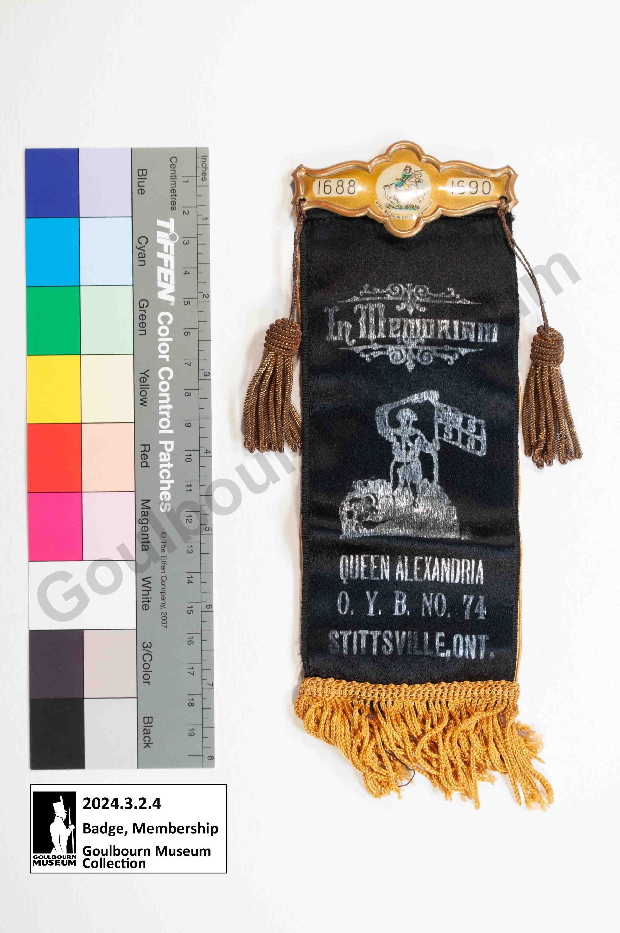 Metal top bar with pin to attach to wearer. Front of badge is a blue coloured fabric, two metal tassels, an orange coloured fabric top ending at centre with two applique Union Flags, a central circular badge, and space at the bottom which is missing the original printed texts. On the reverse it says "In Memoriam" "Queen Alexandria O.Y.B. No 74 Stittsville, ONT." Belonged to Gilmour "Gil" Graham.Collection