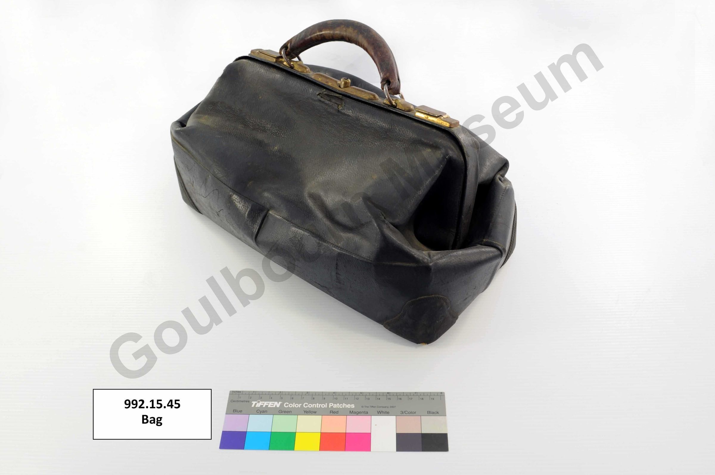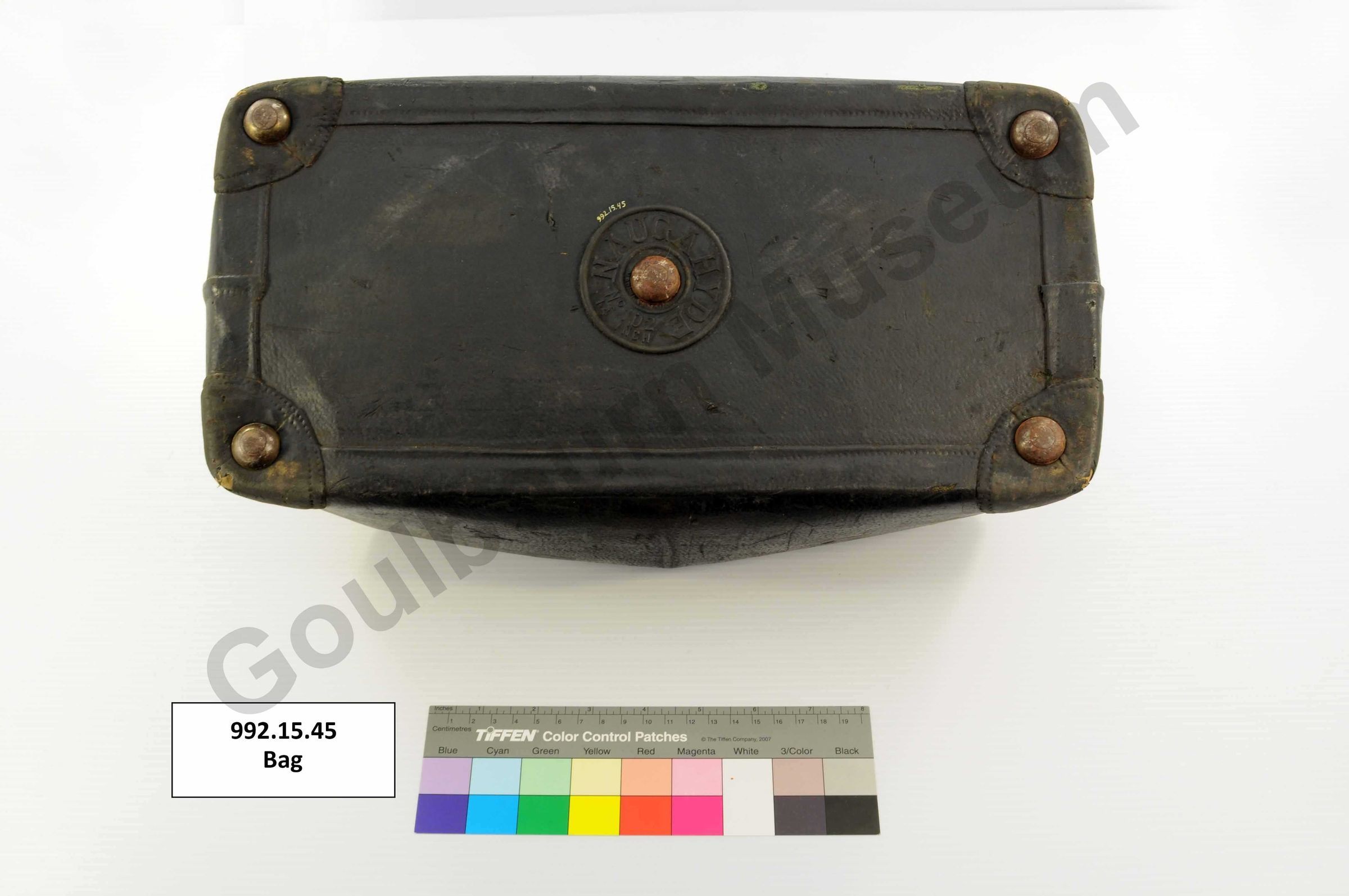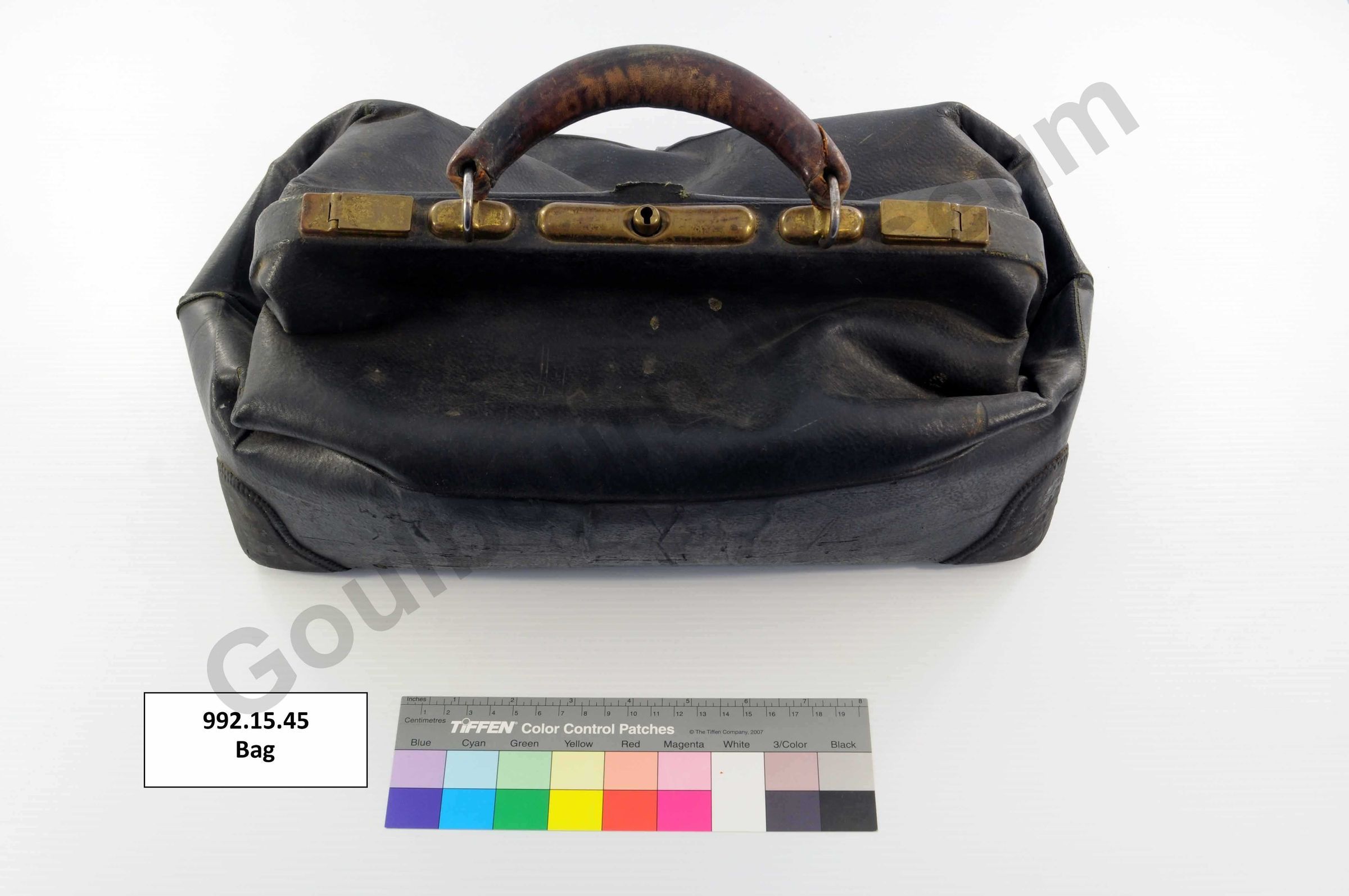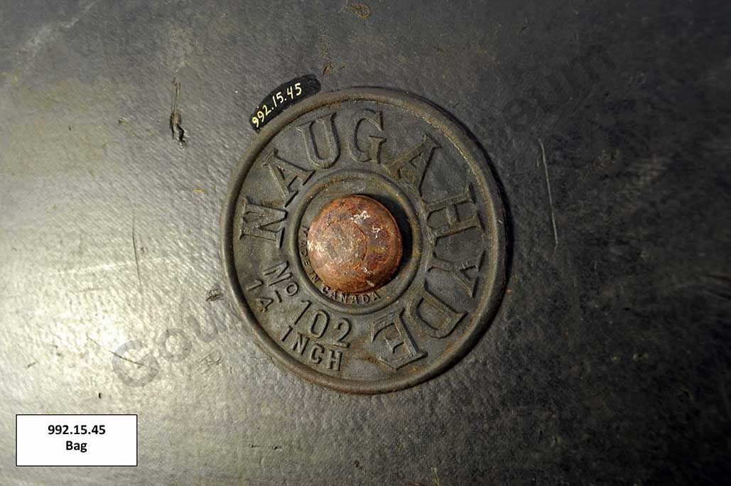 One black coloured leather bag, with brown leather and metal handle and metal lock and closure. The metal hinges open wide and the bag is lined with a brown coloured fabric inside. The base has 5 metal feet and is embossed with "Naughahyde No 102, 14 inch, Made in Canada."Collection