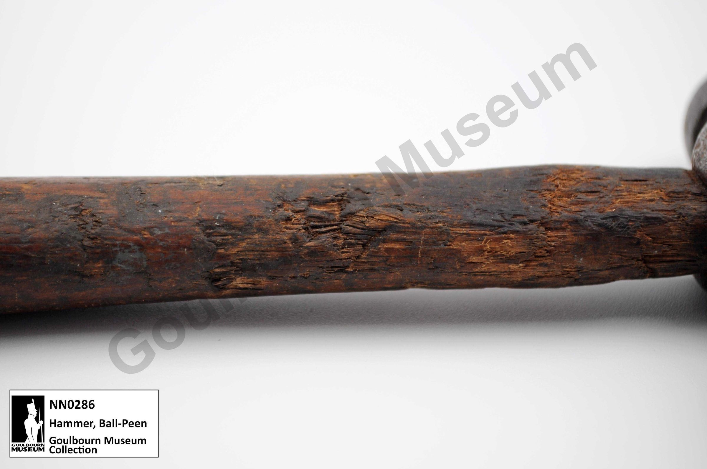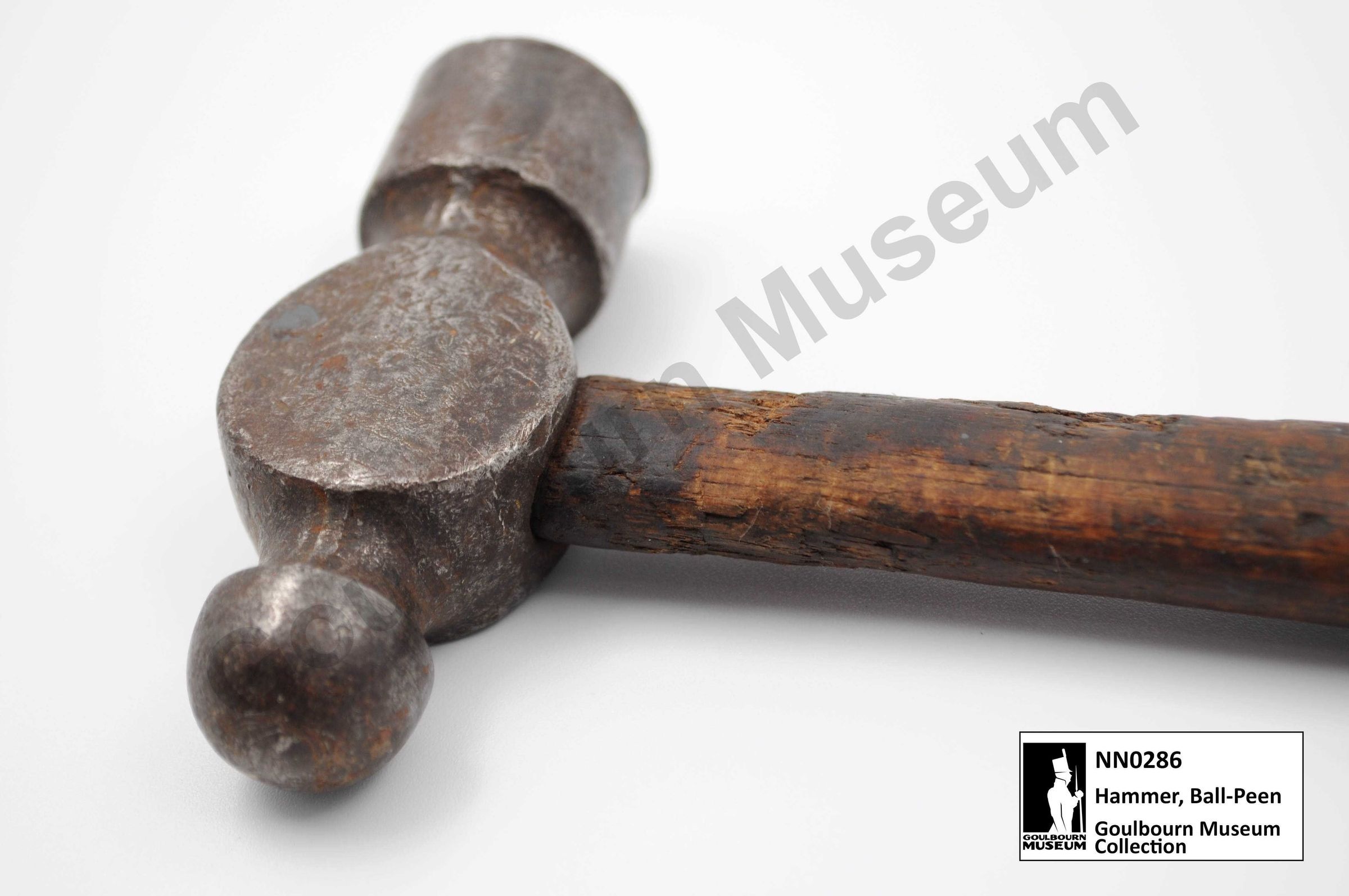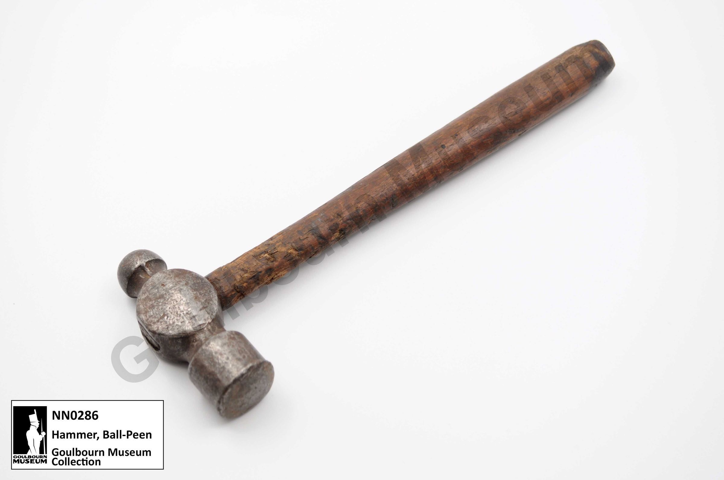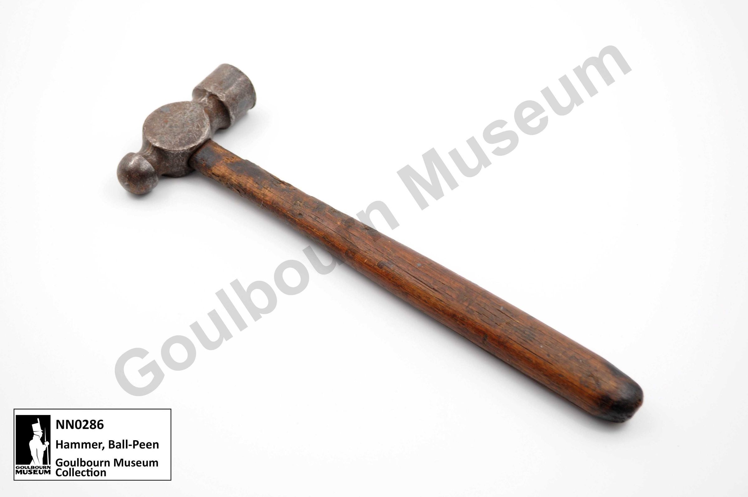 Ball peen style metal working hammer with a handle that tapers towards the neck nearest to the hammer head. The wooden handle is a dark brown colour. The hammer has two working surfaces on its head. One side is cylindrical in shape with a flat end. The opposite side of the head is spherical . The metal used for the hammer head is dark gray in colour.Context
