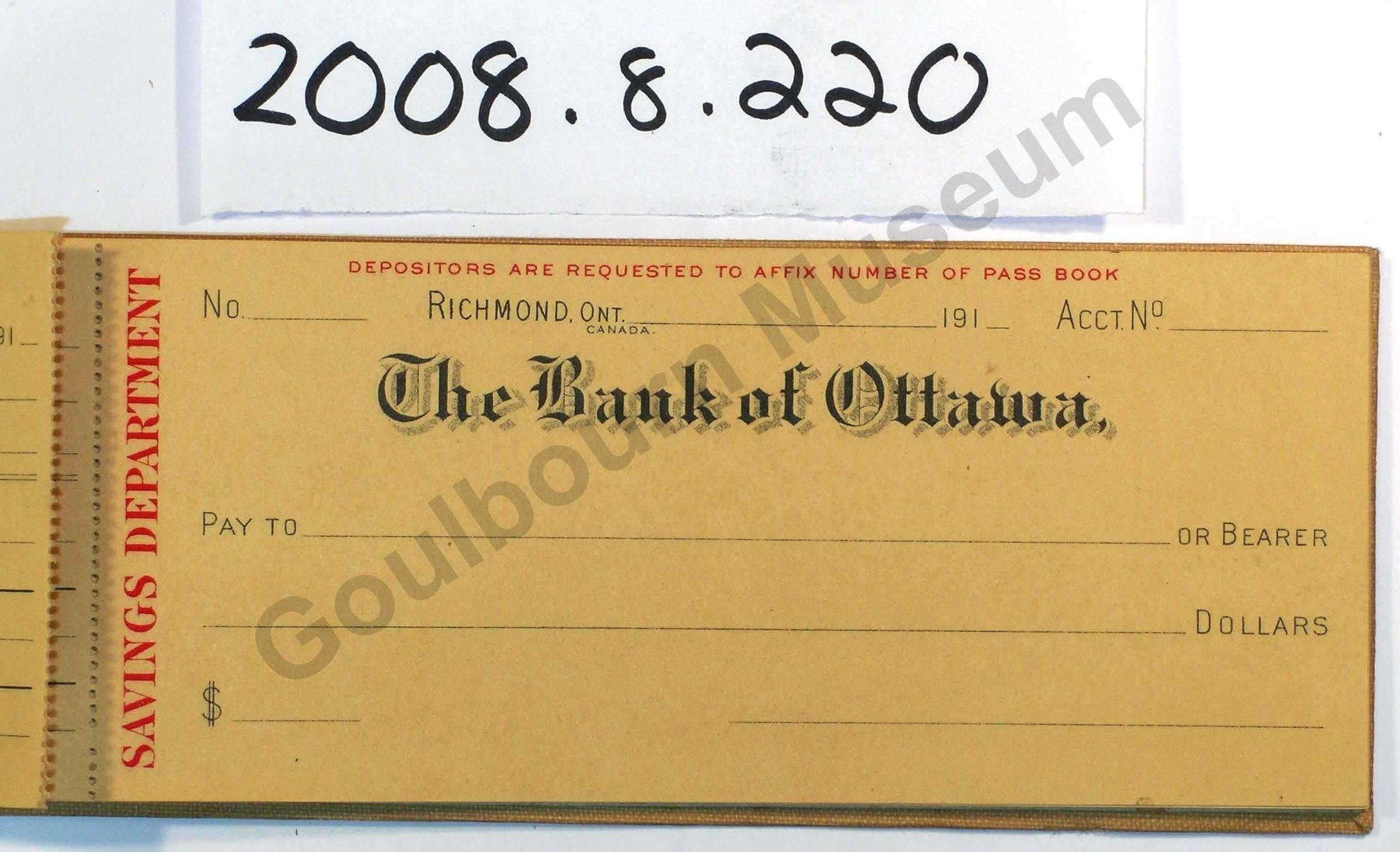 One cheque book from with a beige to orange cover. The cheque pages are printed with the main heading The Bank of Ottawa. Cheques are held in a beige cover. Stubs along the margin. The text in red reads "SAVINGS DEPARTMENT. Depositors are Requested to Affix Number of Pass Book" while black text reads "The Bank of Ottawa." No handwritten annotations present.