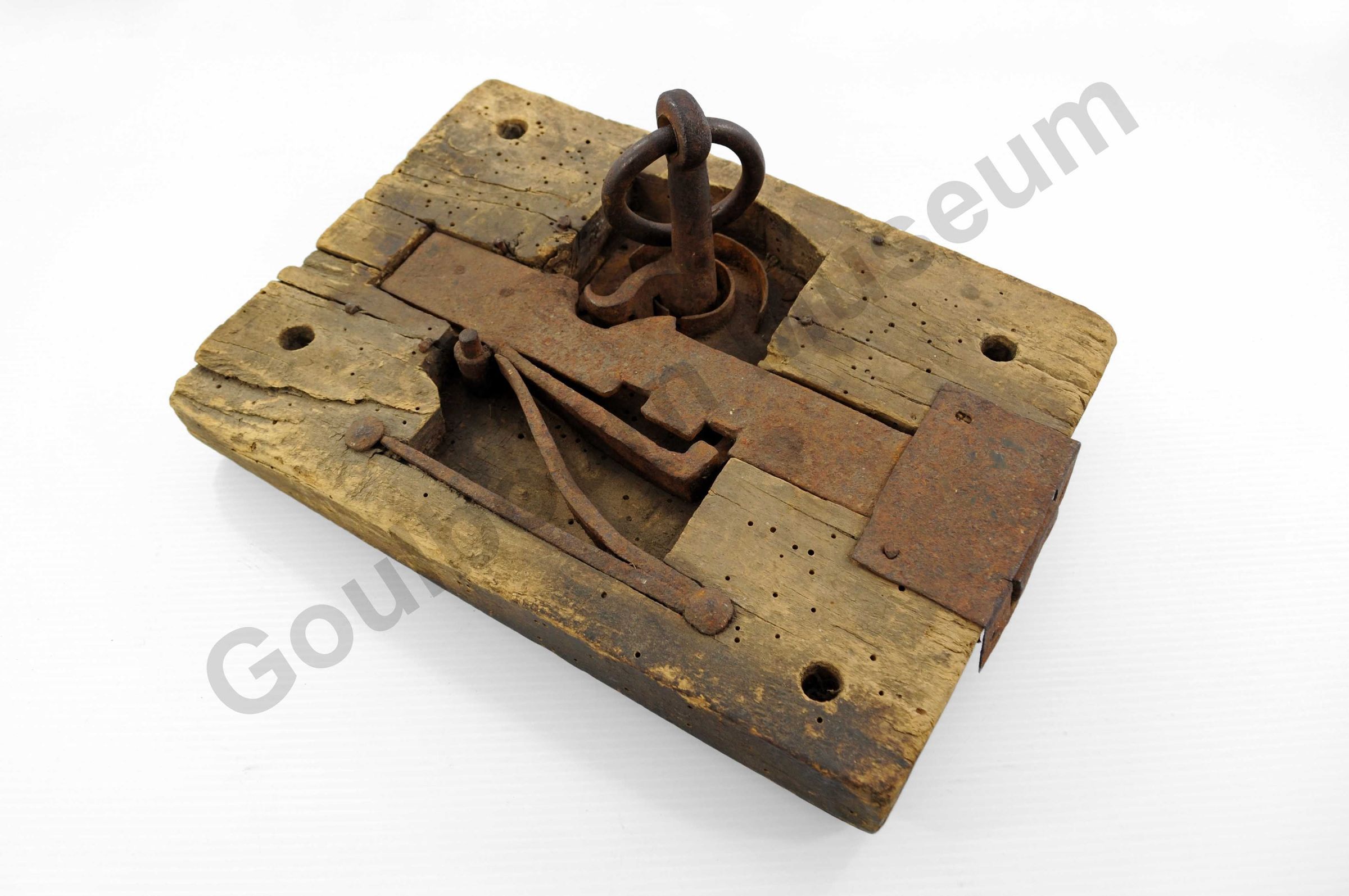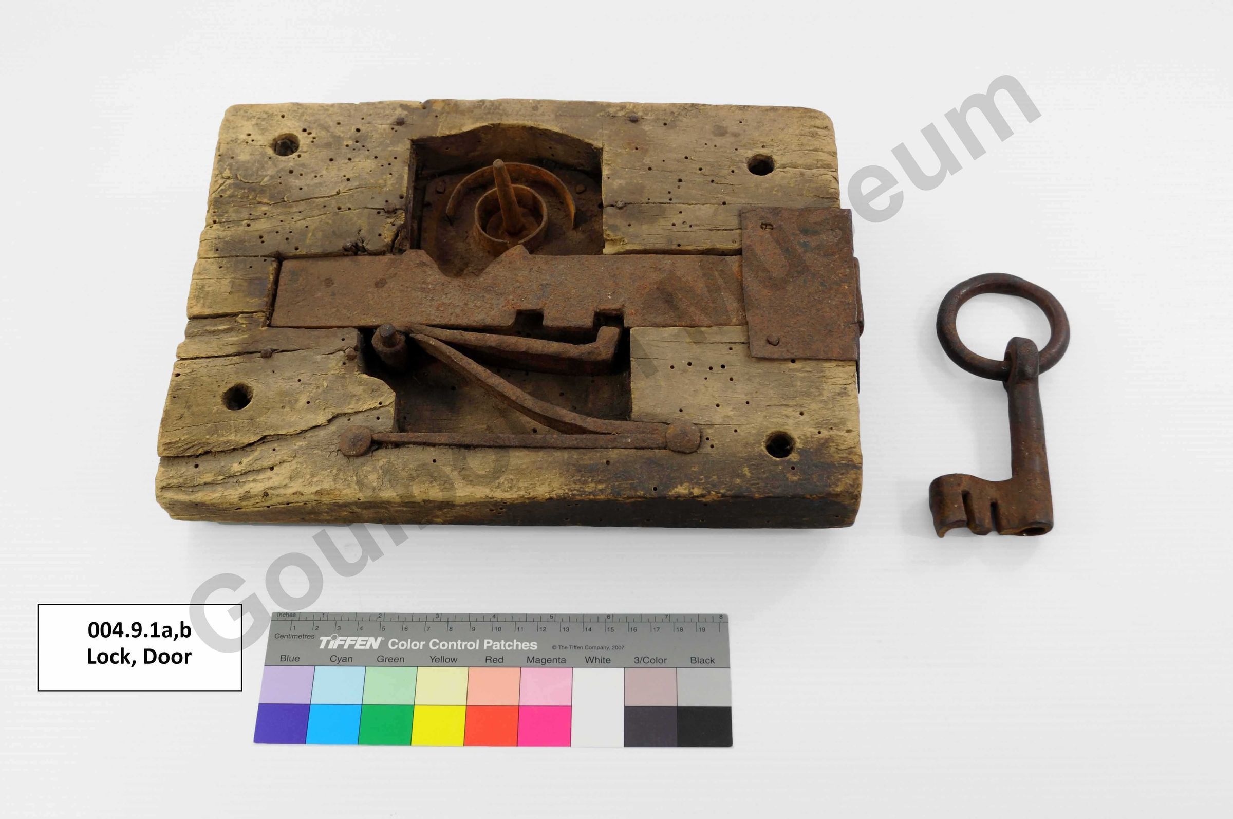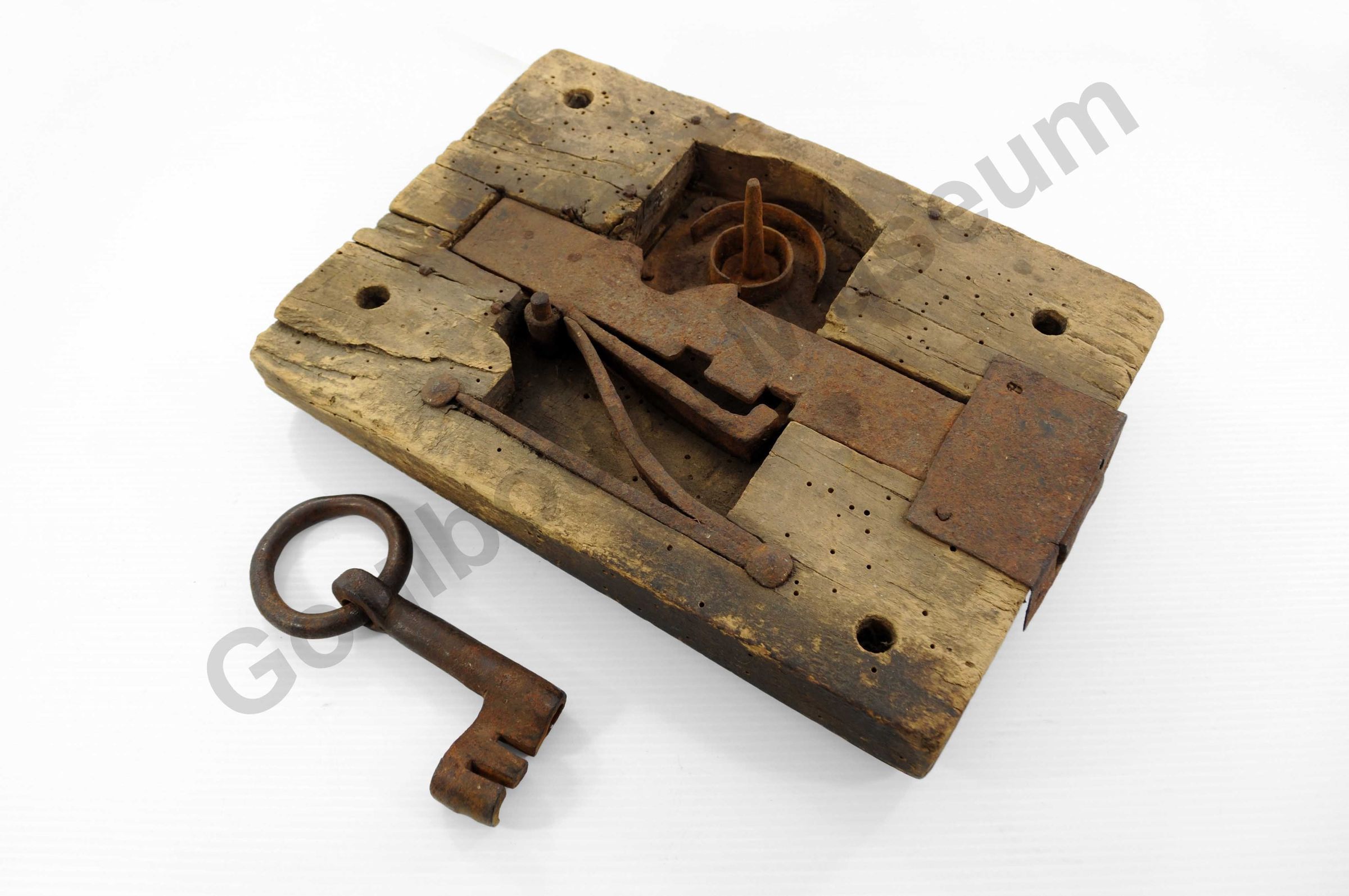 b) Large iron key with two cut outs at the end that slip into the mechanism and what looks like a hook for turning the locking mechanism. The handle is attached to a ring that is looped through a large hole in the iron.Context