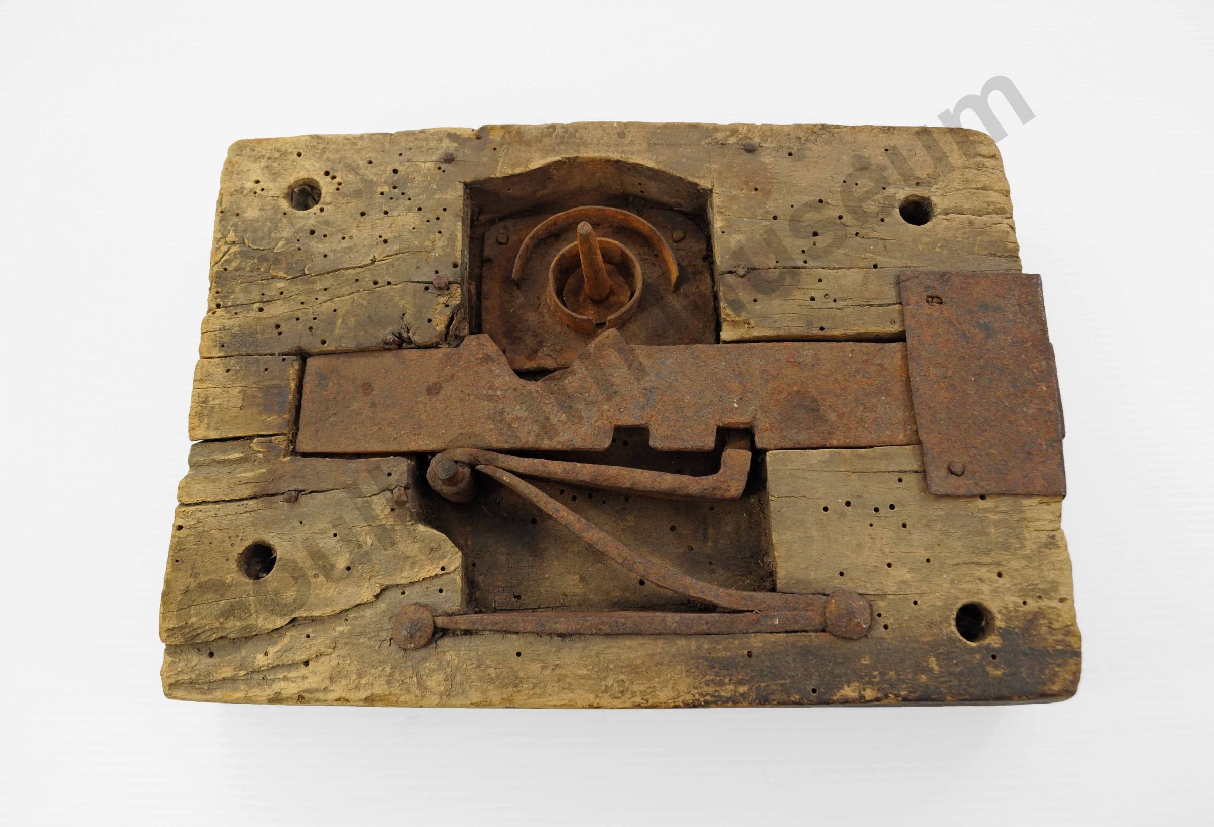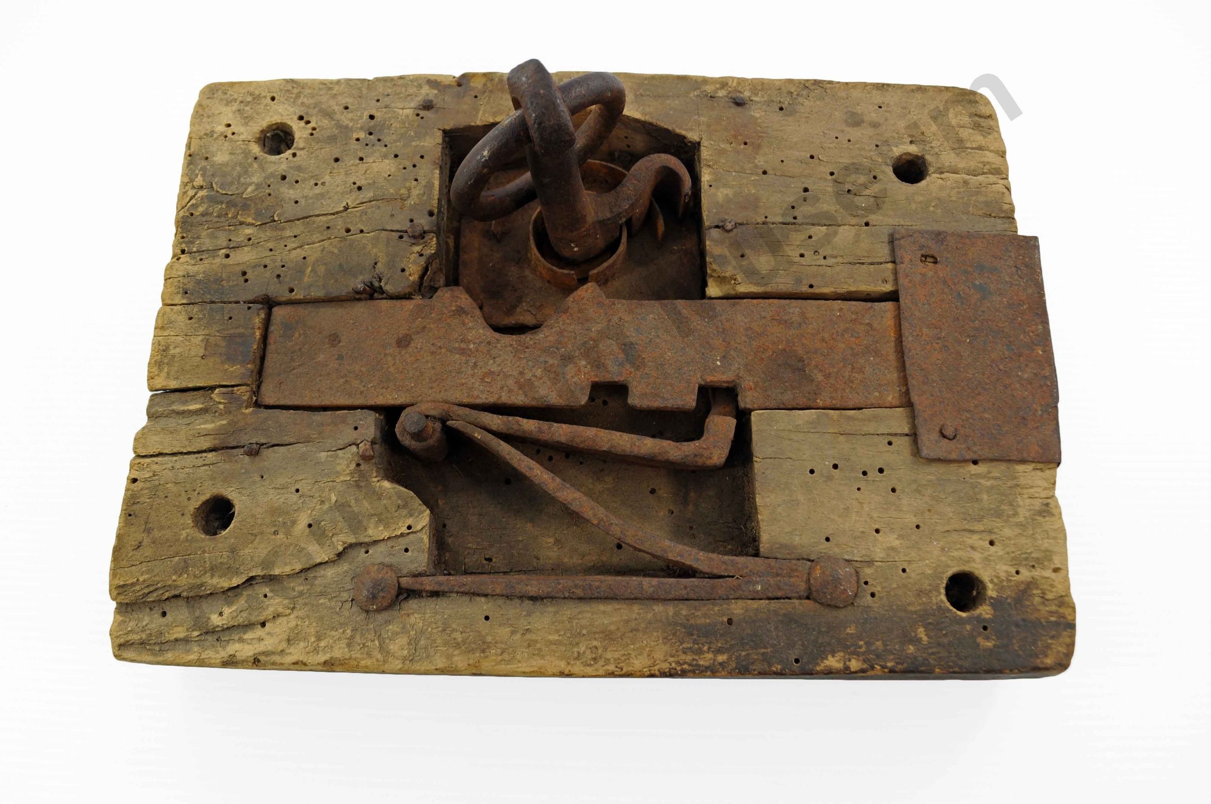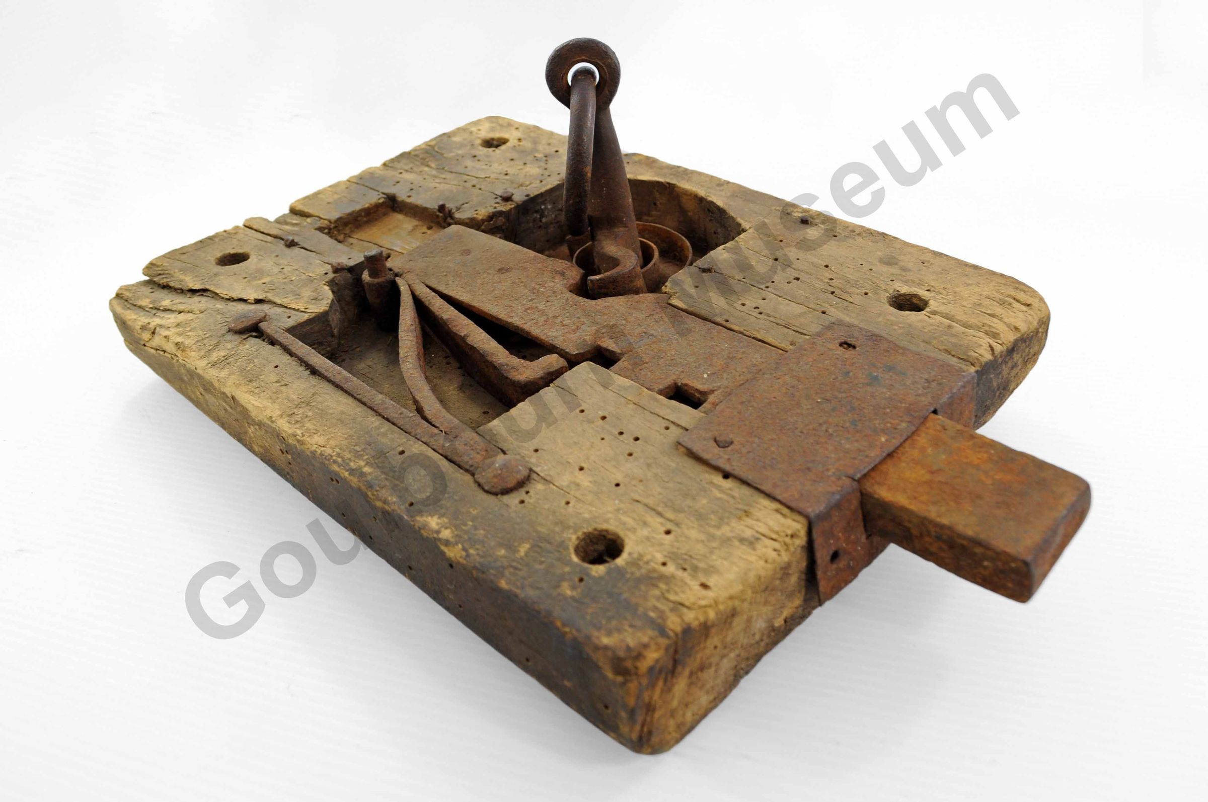 b) Large iron key with two cut outs at the end that slip into the mechanism and what looks like a hook for turning the locking mechanism. The handle is attached to a ring that is looped through a large hole in the iron.Context