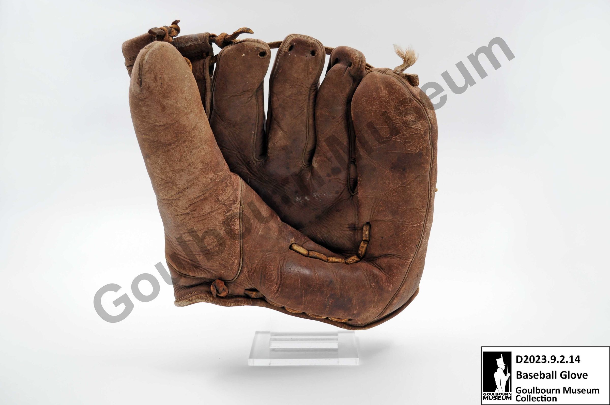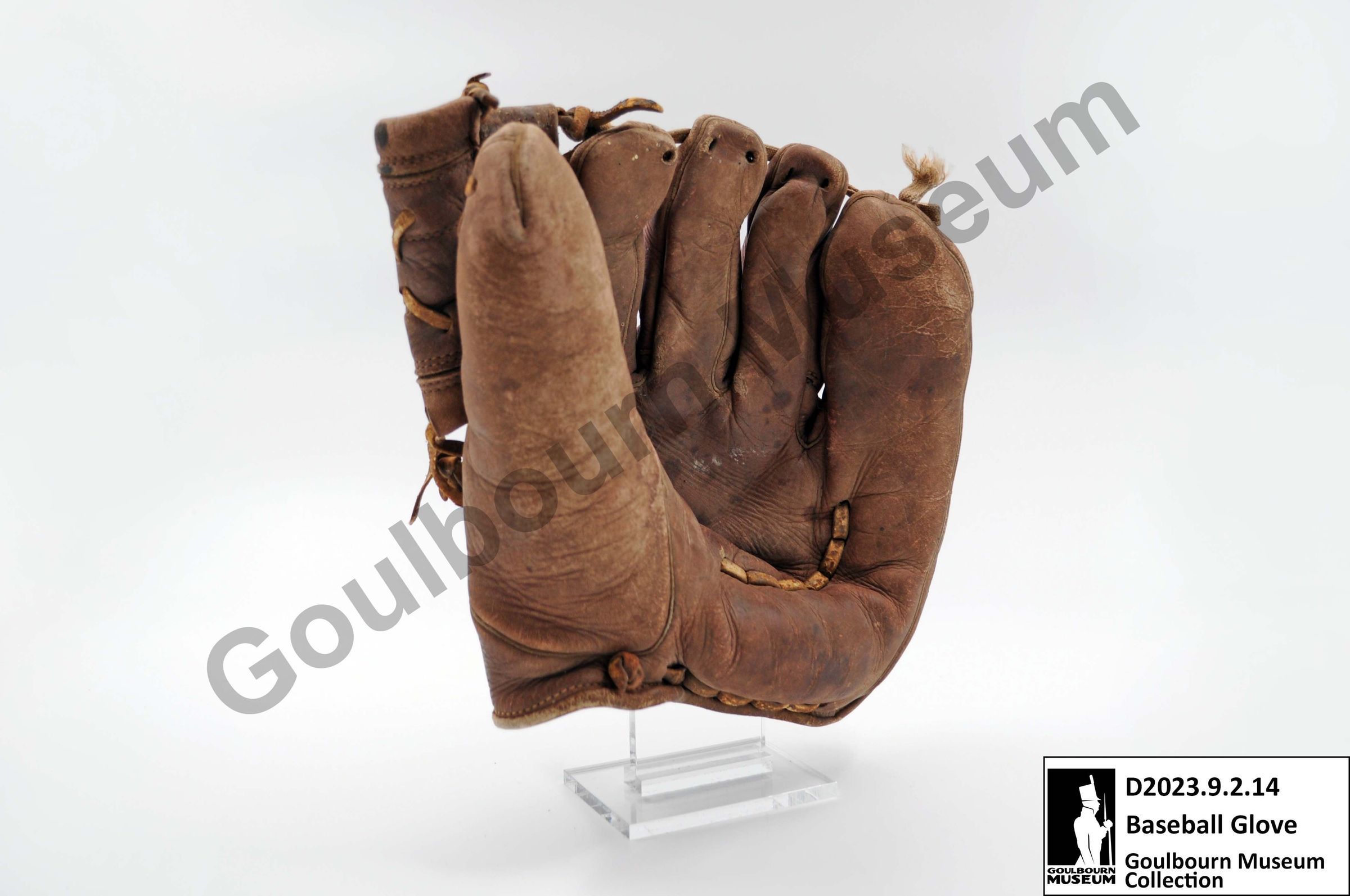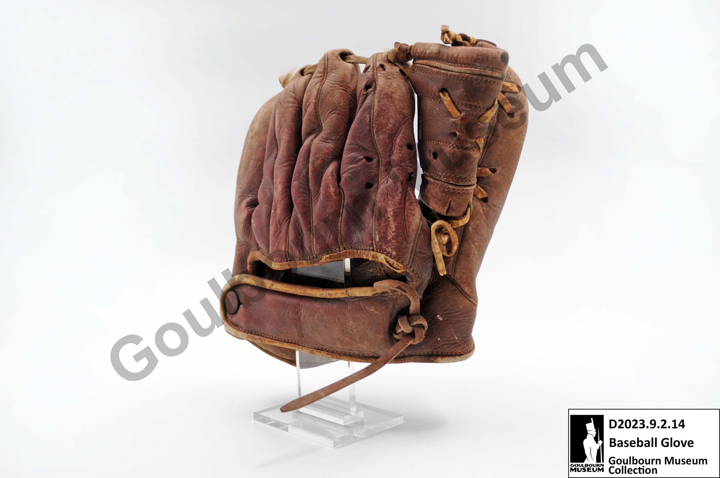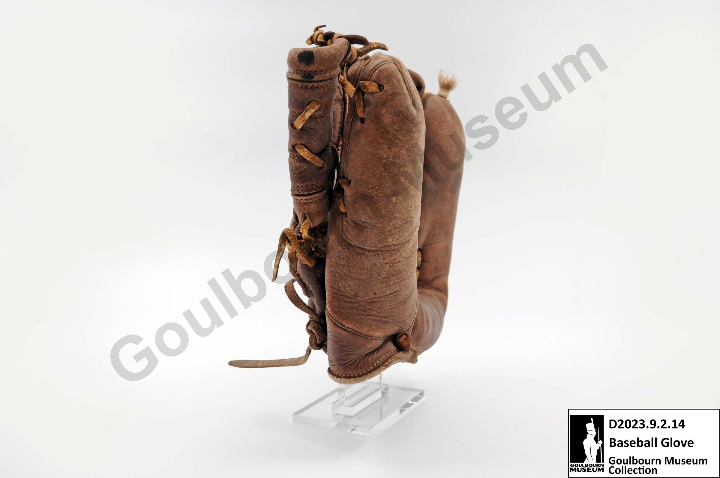 One vintage baseball glove. The glove appears worn, with visible creases and a rich brown color, indicating its age and use over time. It is a classic design typical of early baseball gloves, with individual finger slots but lacking the modern webbing that is seen in contemporary models.Context