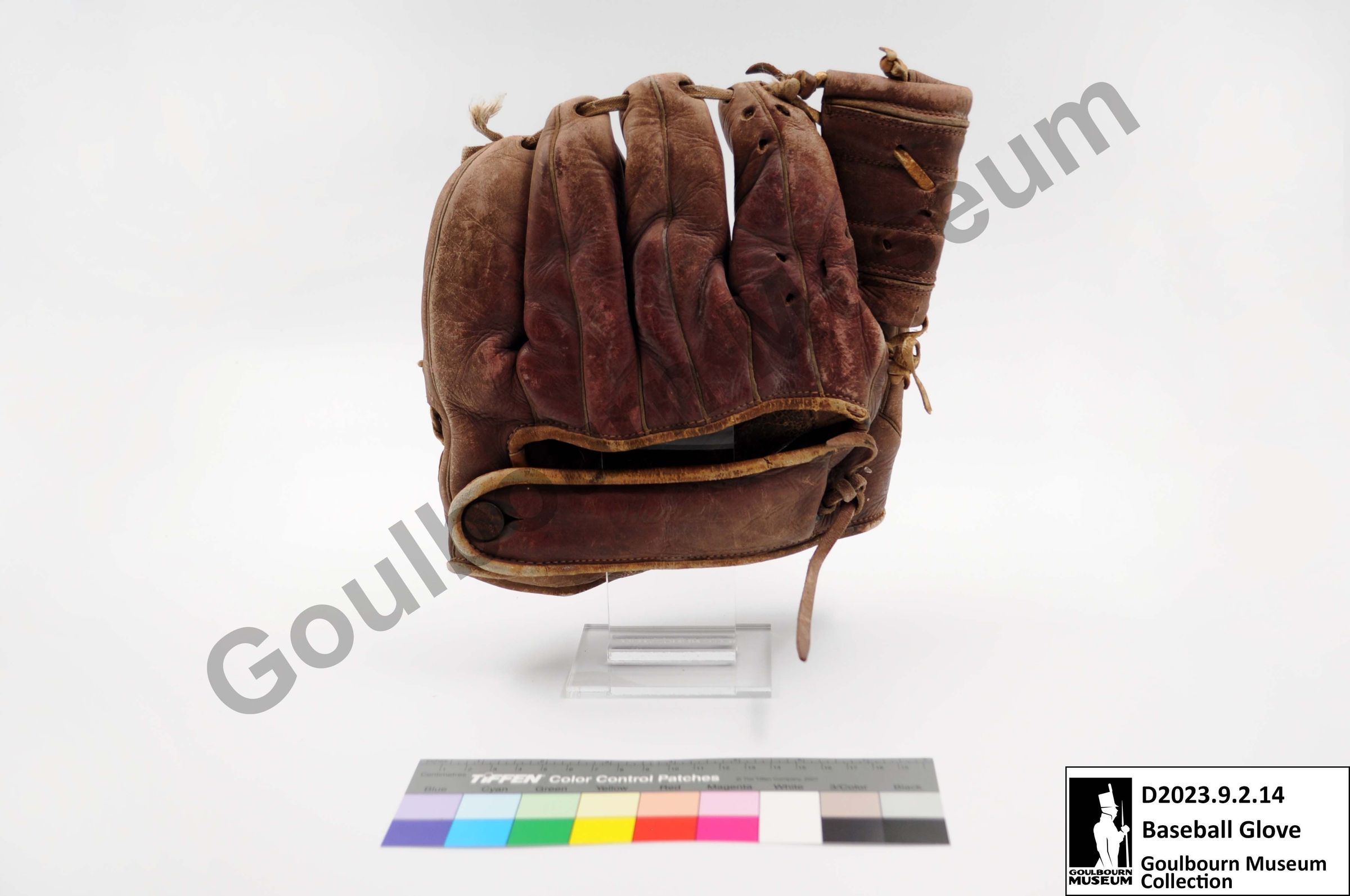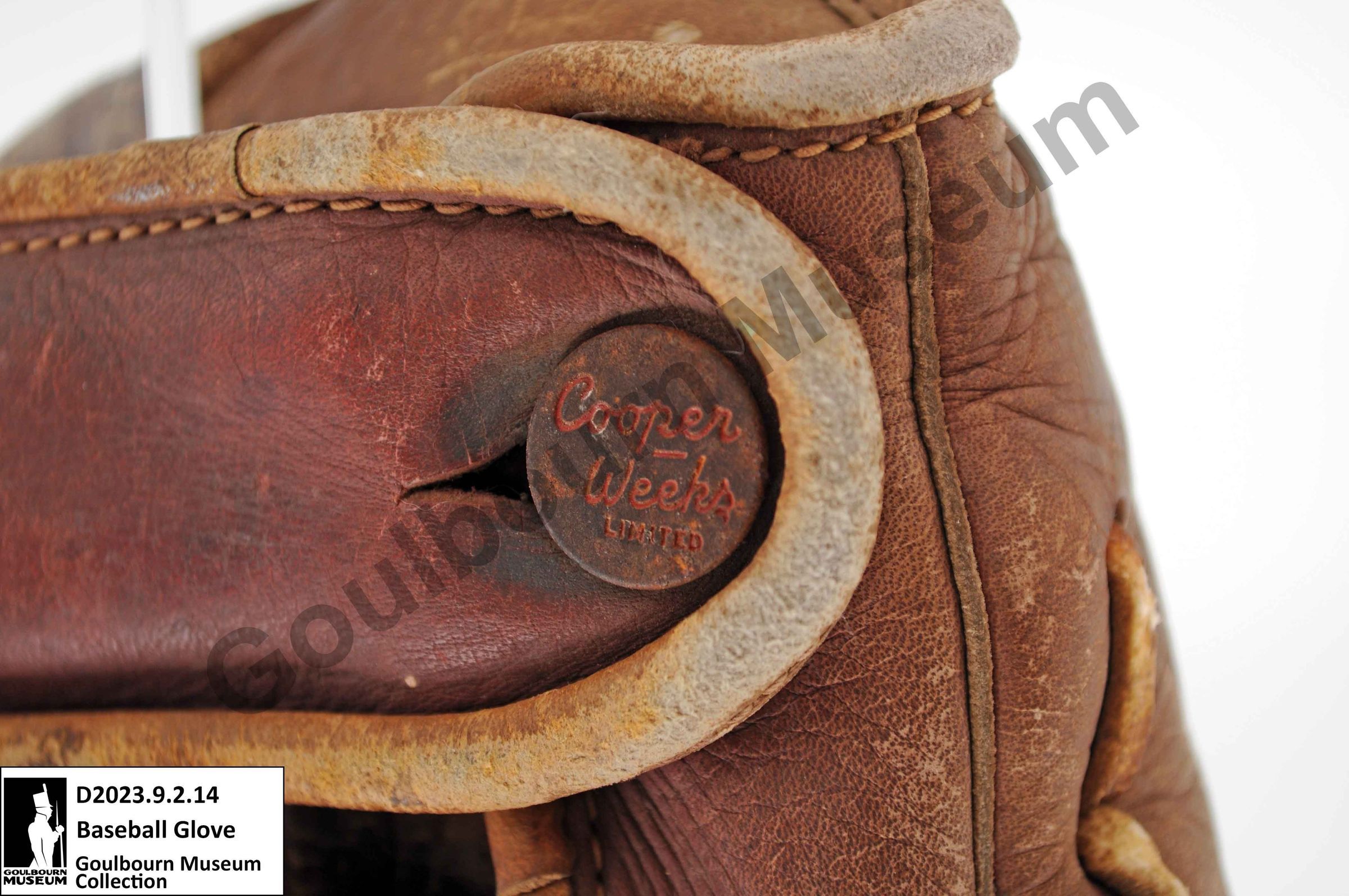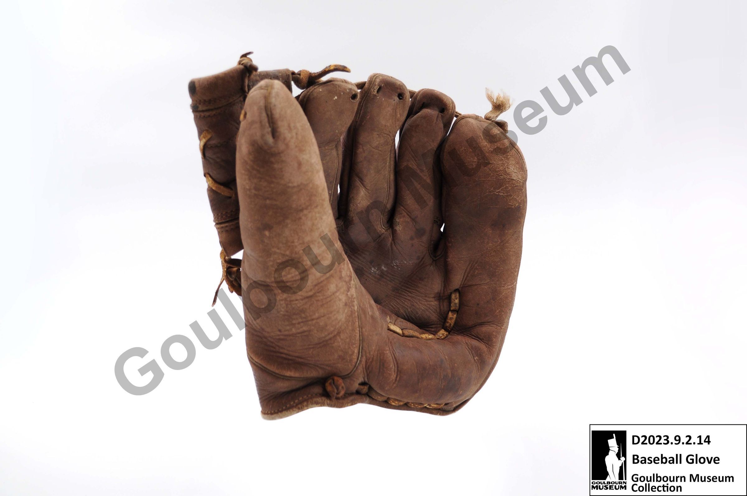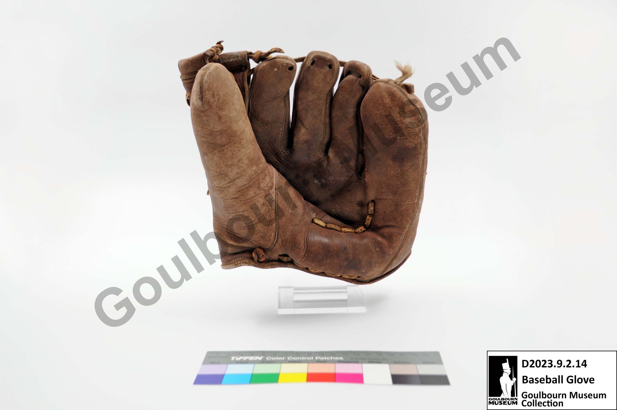 One vintage baseball glove. The glove appears worn, with visible creases and a rich brown color, indicating its age and use over time. It is a classic design typical of early baseball gloves, with individual finger slots but lacking the modern webbing that is seen in contemporary models.Context