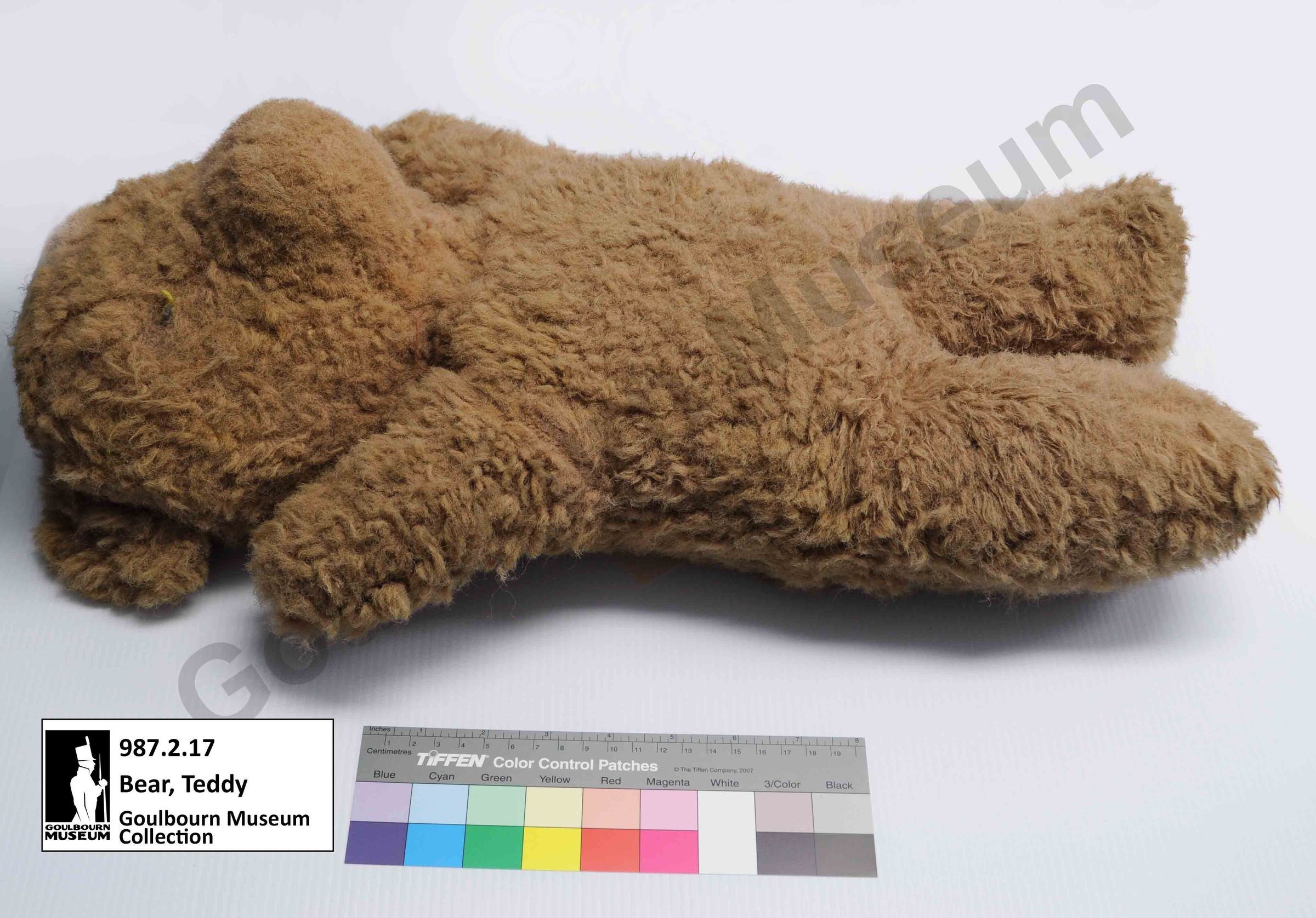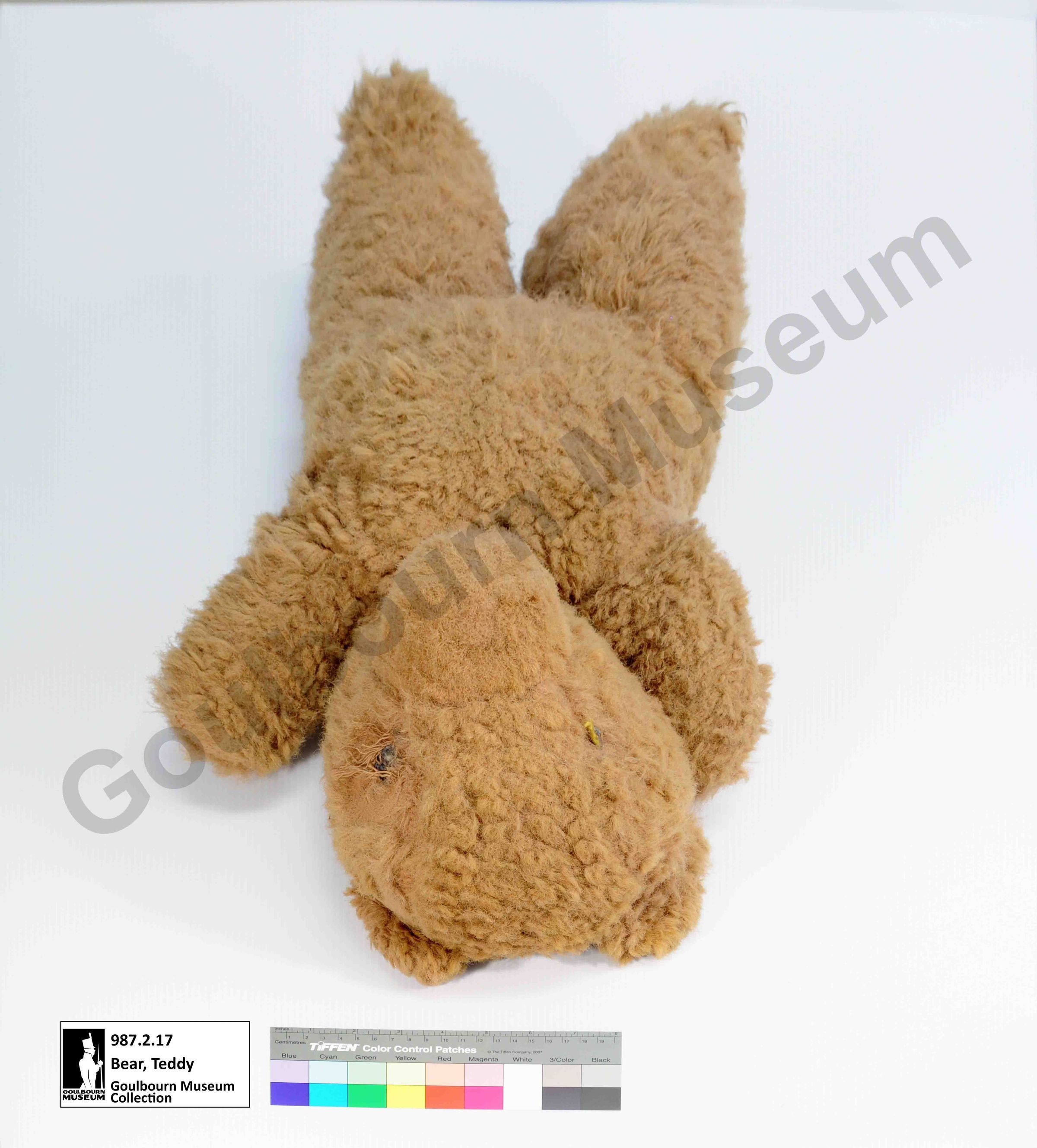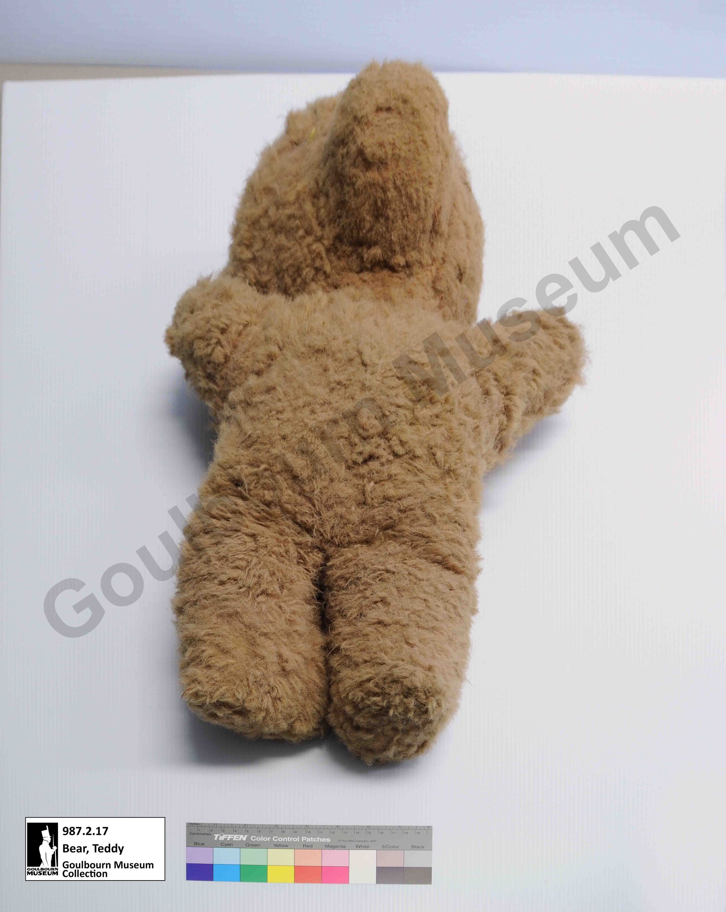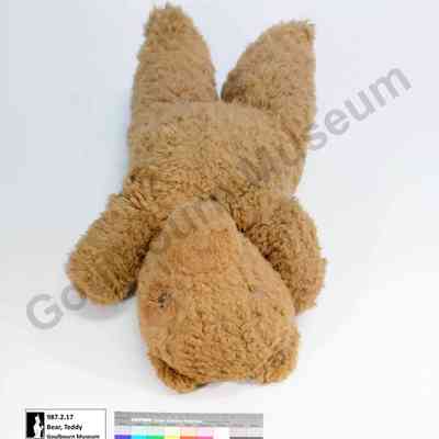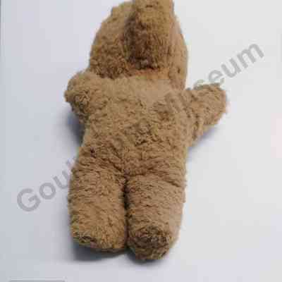 Teddy bear with light brown, woolly fur. The bear has no eyes.