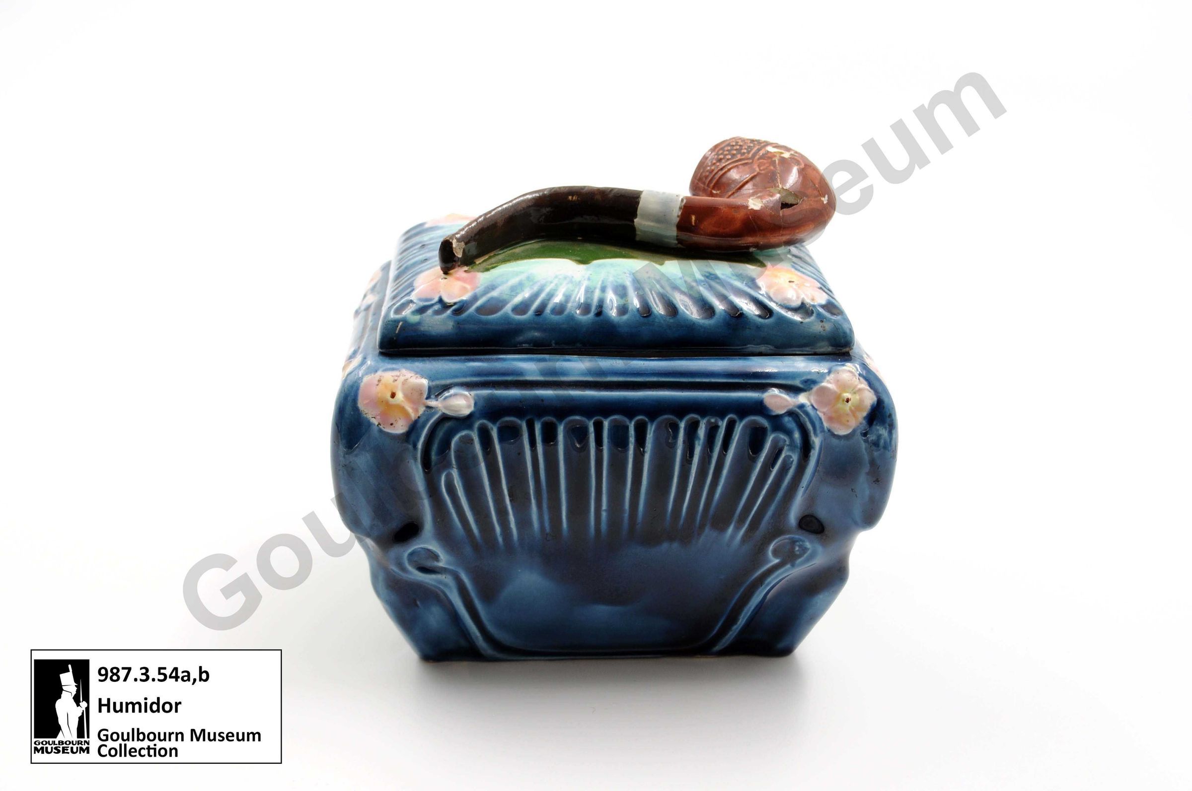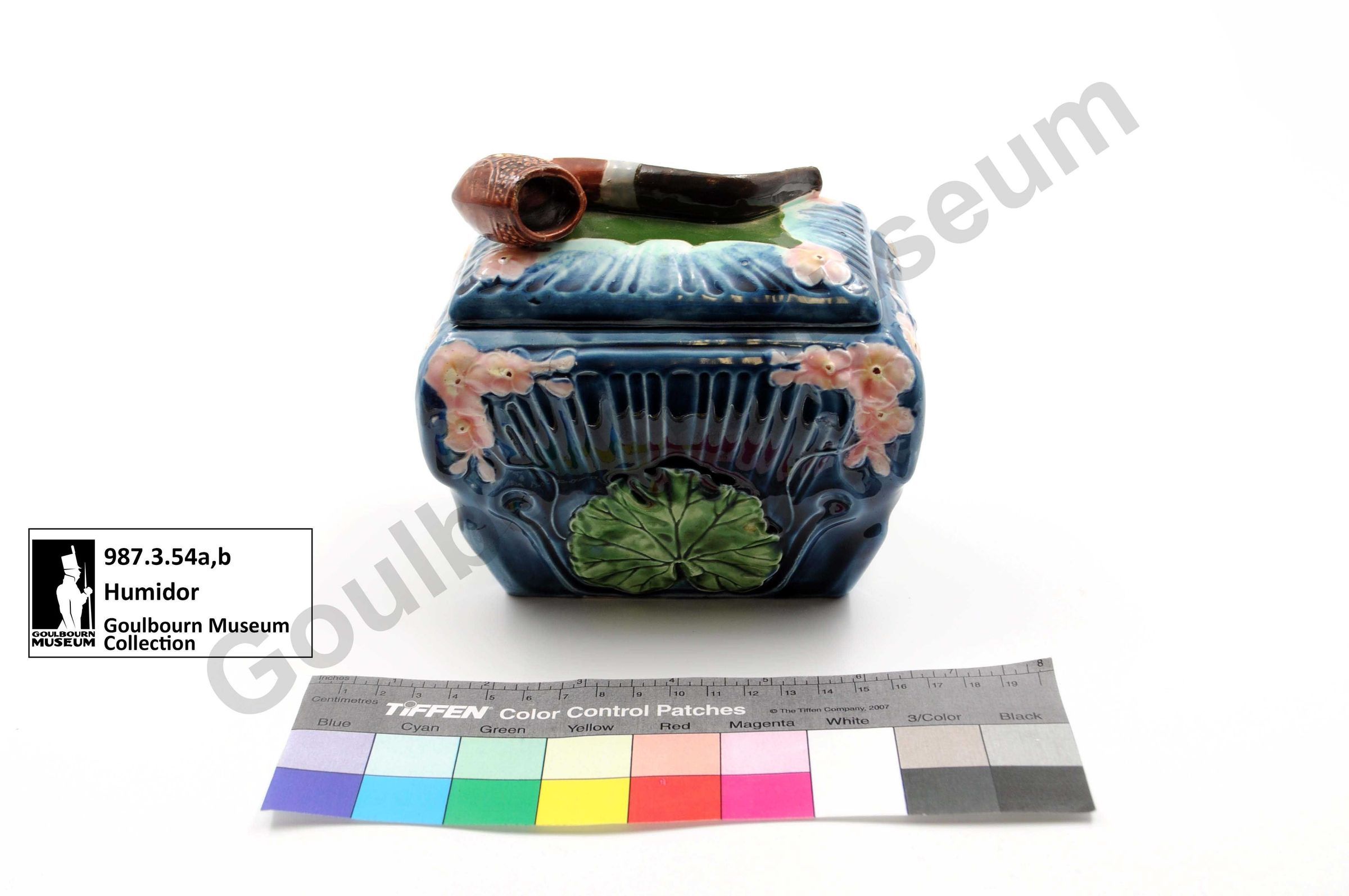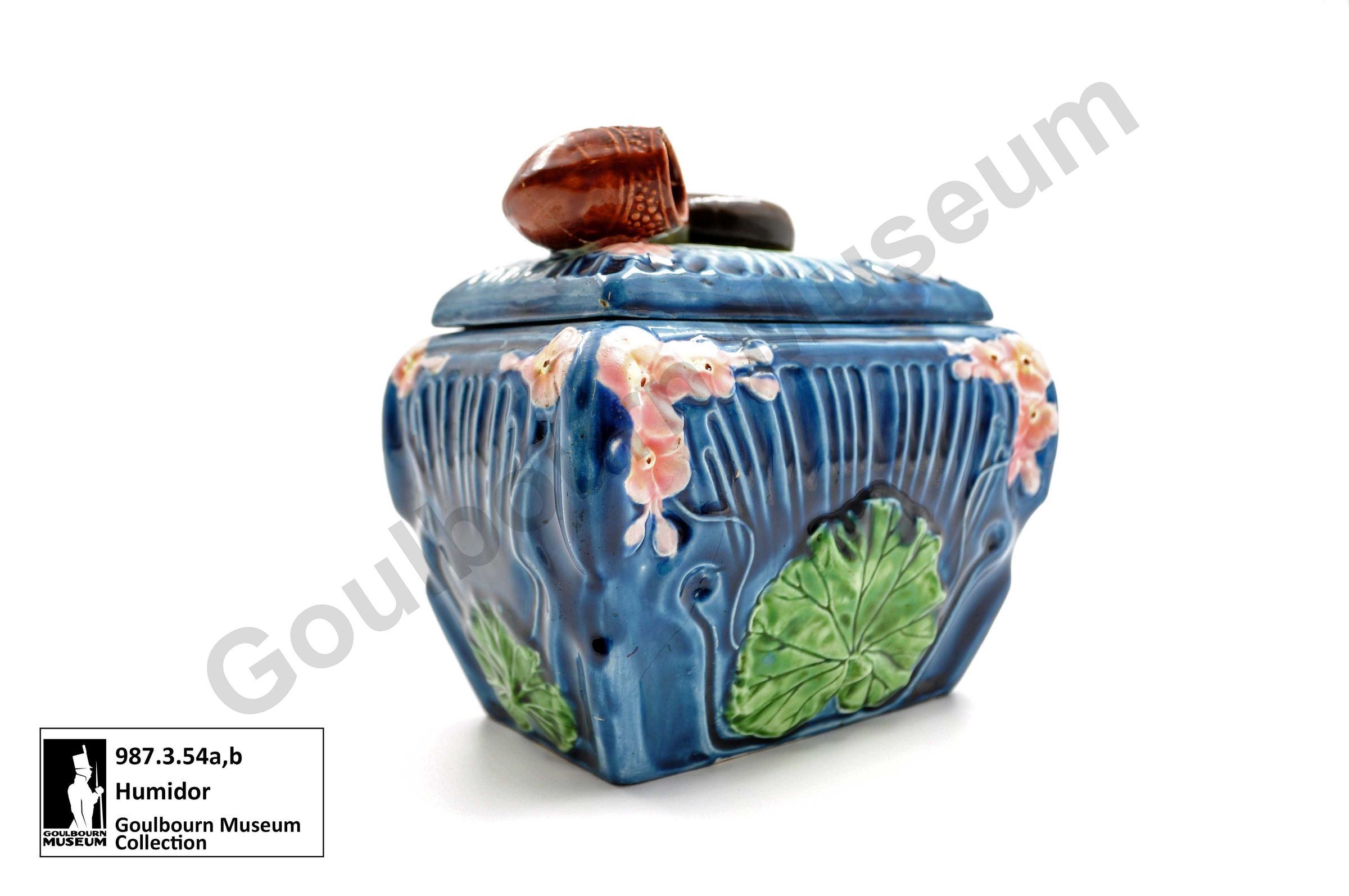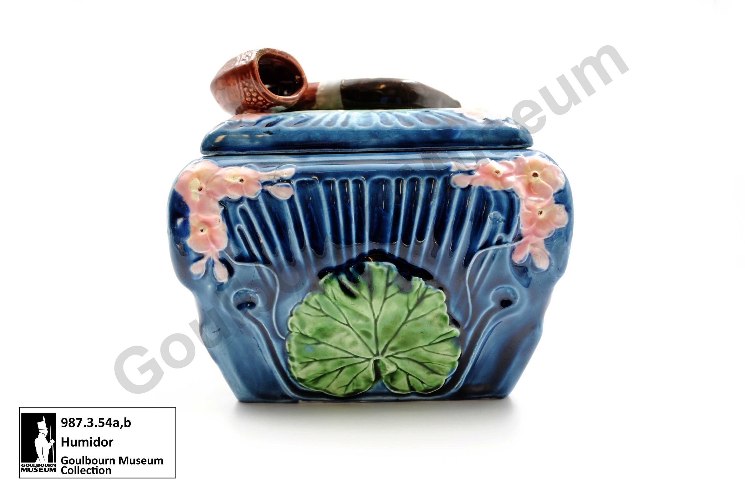 Two piece ceramic tobacco humidor made in the popular "Majolica" style first introduced at the 1851 London Exhibition of All Nations. The humidor is decorated with a navy blue glaze over the body and lid, the body includes floral motifs including large green leaves and pink flowers, the top of the humidor lid includes a three dimensional tobacco pipe glazed in brown, grey and black. Ceramics producers from around the world decorated household items with scenes from the Classics, animals, people, and specimens of natural history to capture Victorian curiosity. Objects like these catered to the newly emerging middle-class of society, who had some disposable income with which to purchase non-essential items like a decorated humidor, but could not afford high-end luxury goods like one made of precious metals, woods like sandalwood, and animal products like ivory. This artefact was also functional and tasked with keeping commercial pipe tobacco fresh and pleasant to smoke. Without moisture the tobacco would go dry and become flavourless crumbs.Context