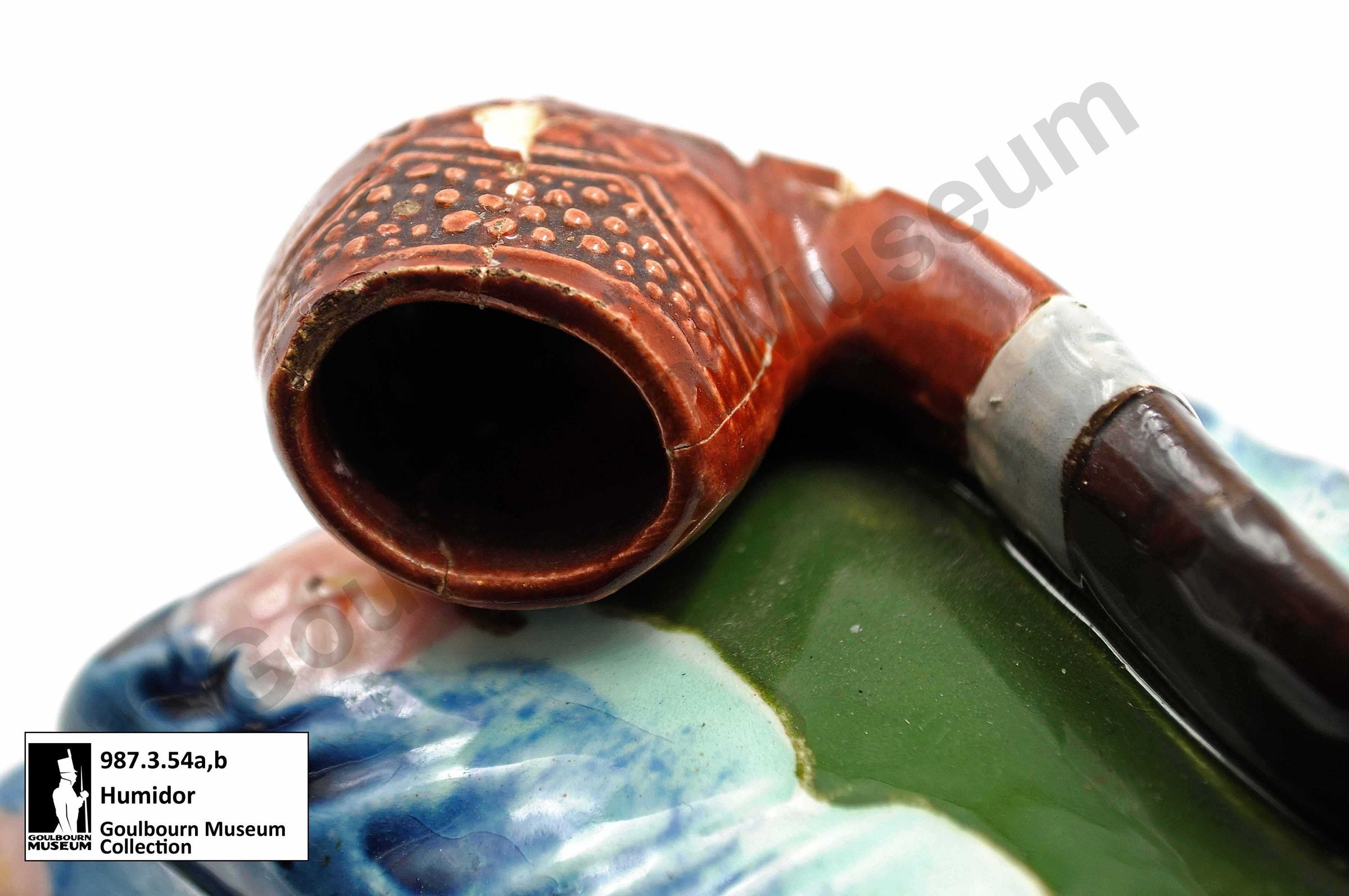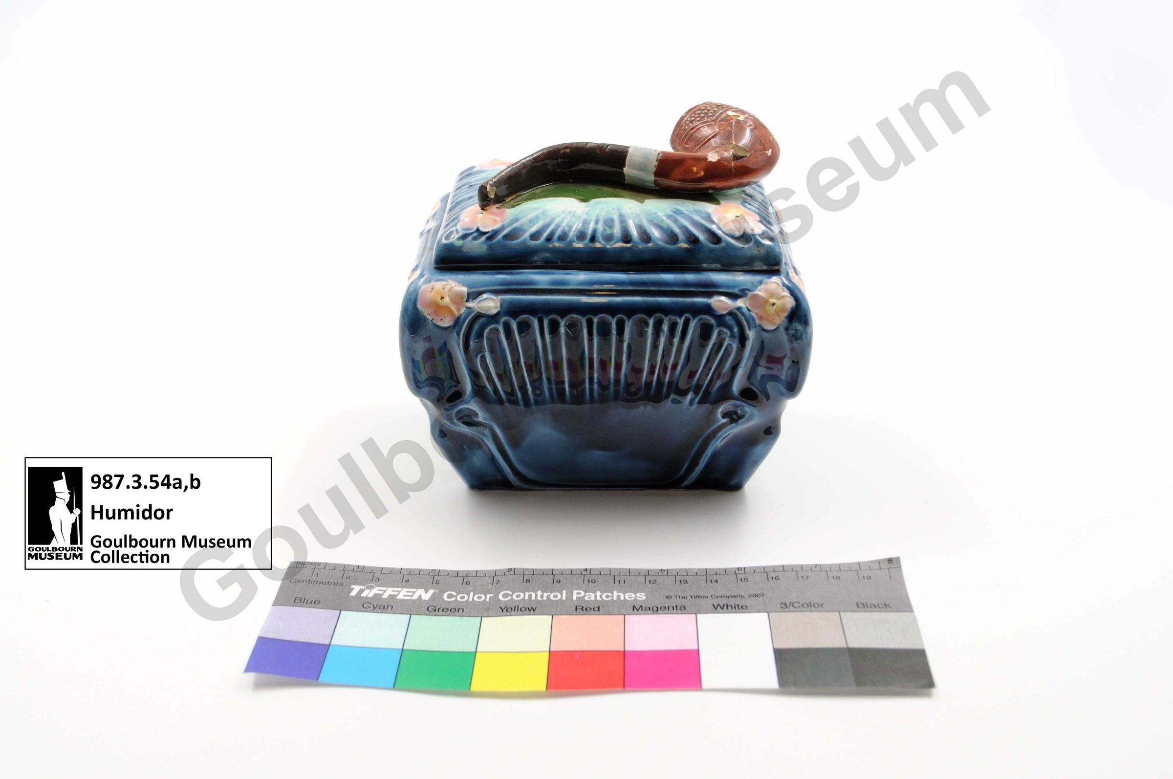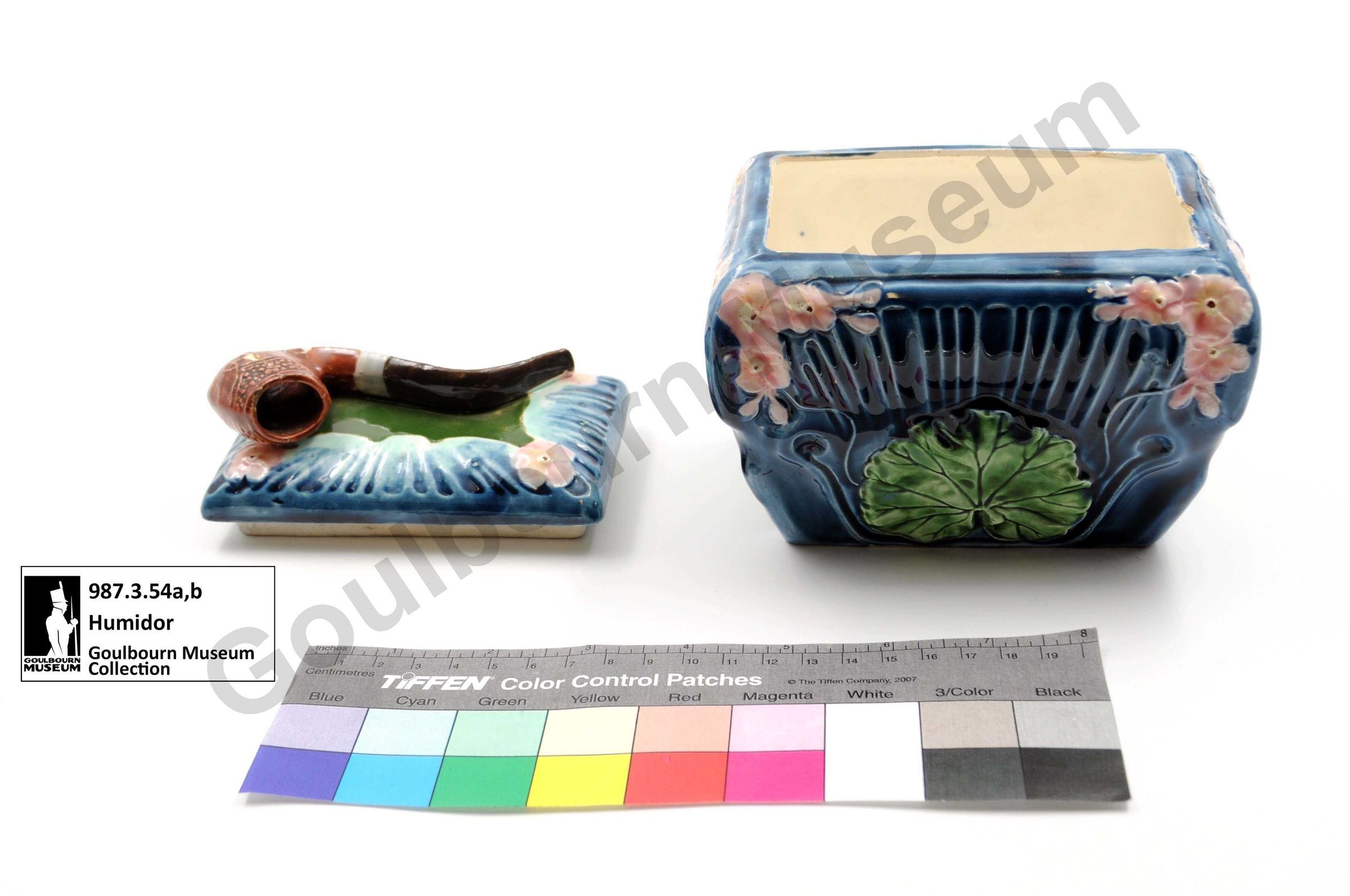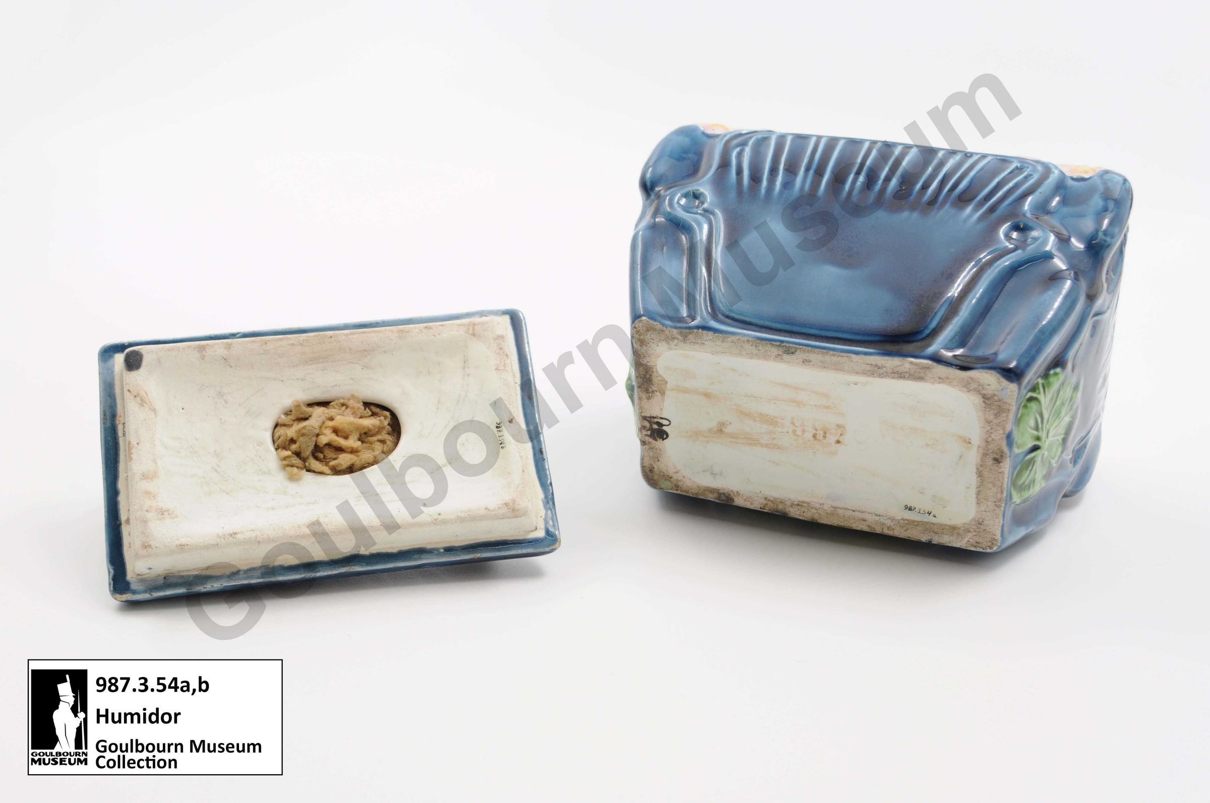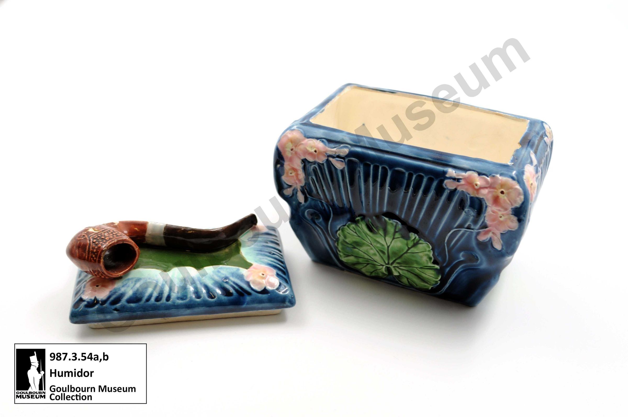 Two piece ceramic tobacco humidor made in the popular "Majolica" style first introduced at the 1851 London Exhibition of All Nations. The humidor is decorated with a navy blue glaze over the body and lid, the body includes floral motifs including large green leaves and pink flowers, the top of the humidor lid includes a three dimensional tobacco pipe glazed in brown, grey and black. Ceramics producers from around the world decorated household items with scenes from the Classics, animals, people, and specimens of natural history to capture Victorian curiosity. Objects like these catered to the newly emerging middle-class of society, who had some disposable income with which to purchase non-essential items like a decorated humidor, but could not afford high-end luxury goods like one made of precious metals, woods like sandalwood, and animal products like ivory. This artefact was also functional and tasked with keeping commercial pipe tobacco fresh and pleasant to smoke. Without moisture the tobacco would go dry and become flavourless crumbs.Context