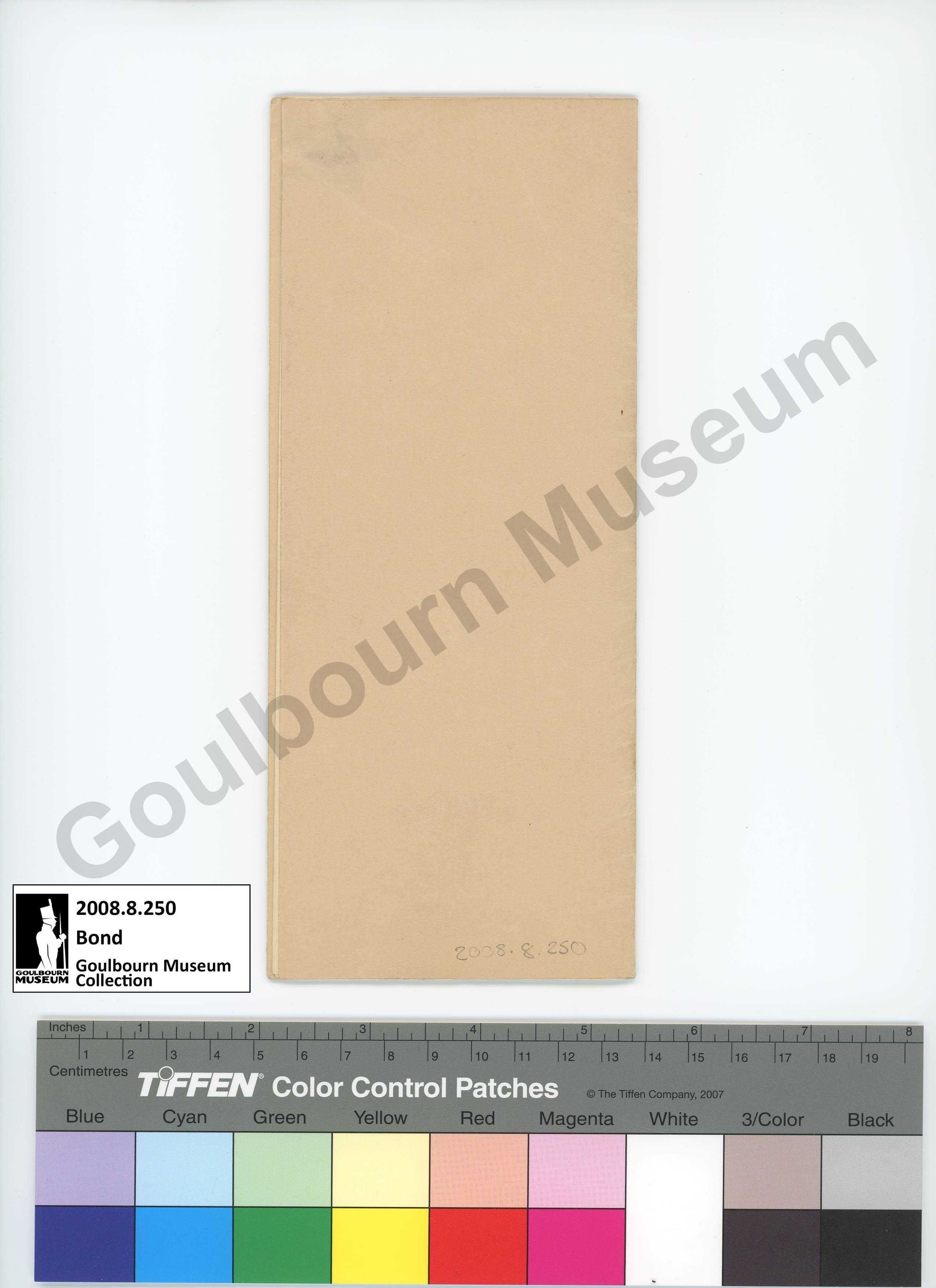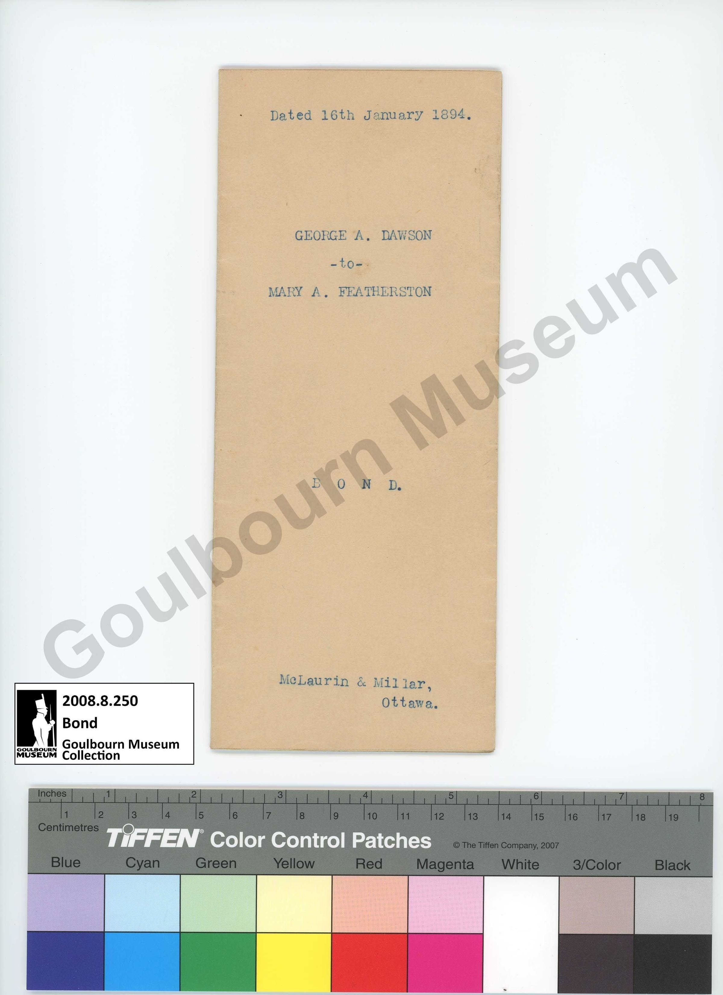 The artefact is a folded paper copy of a bond between George A. Dawson and Mary A .Featherston. The front page reads, "Dated 16th January 1894. George A. Dawson to Mary A. Featherston. Bond. McLaurin and Miller, Ottawa." The reverse remains blank.Collection