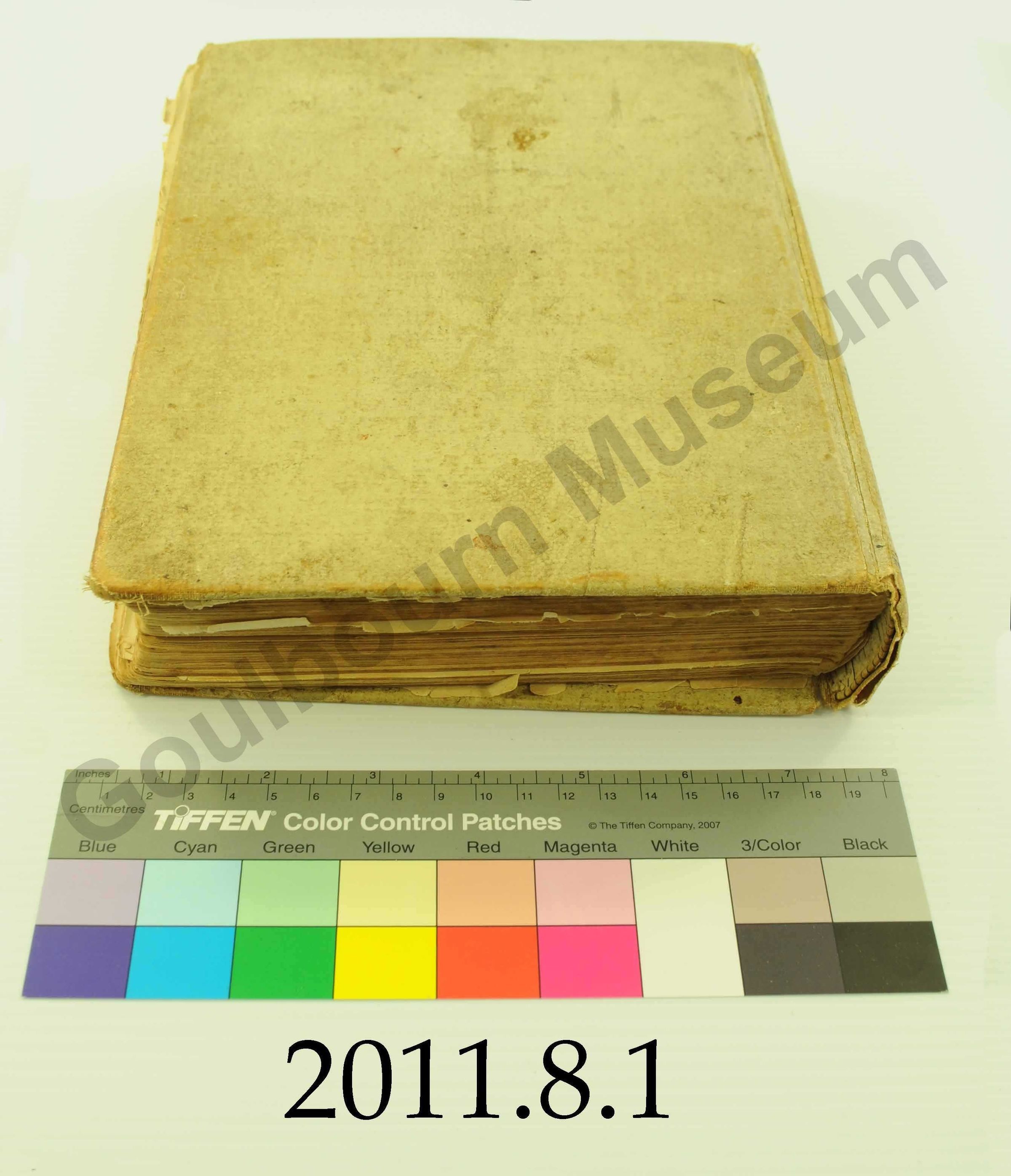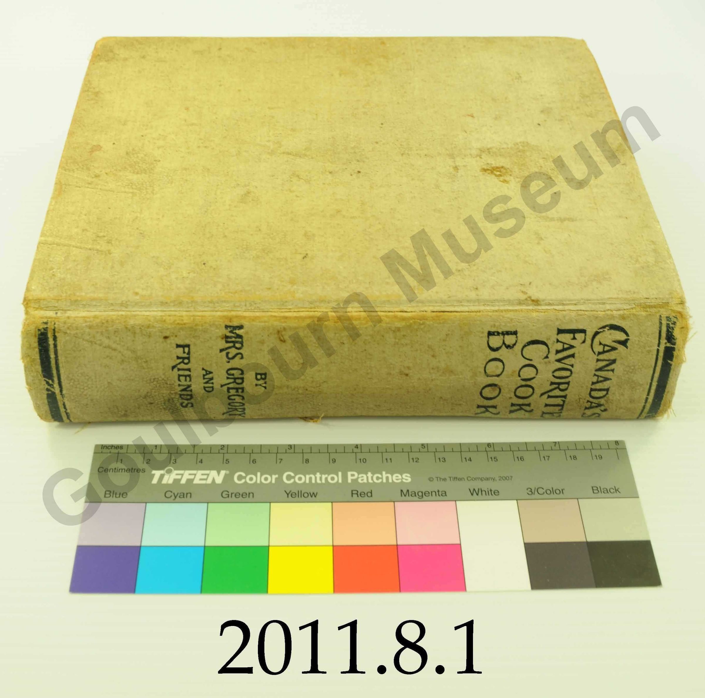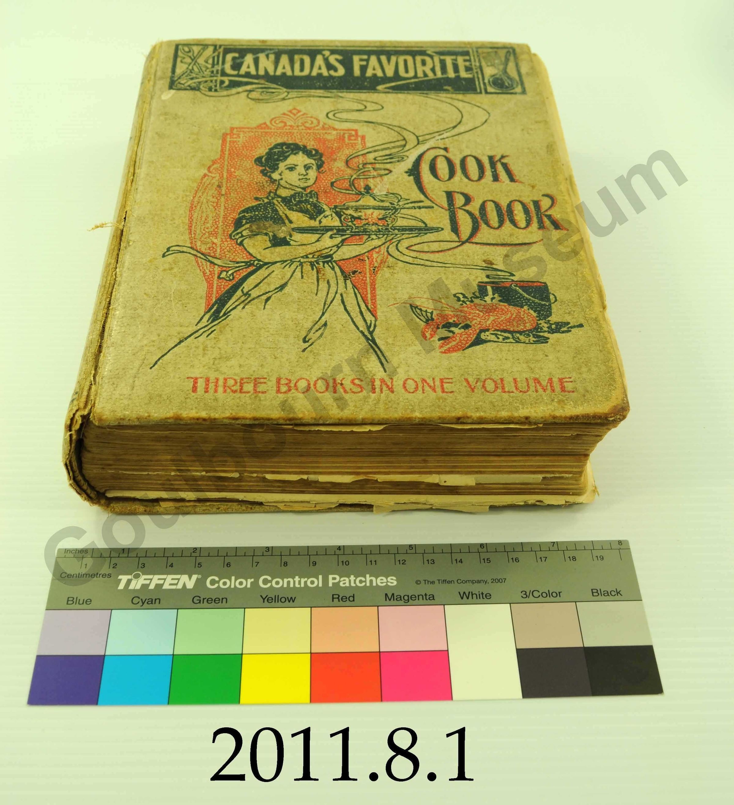 The object is a bound book with a beige cover and offset lithographic pictorial images and text with a matte surface sheen. The cover title states: Canada's Favorite Cook Book - Three Books in Volume. The pictorial images include a figure of a woman wearing an apron and holding a serving platter with a steaming pot that is being heated by a flame. Adjacent to the women are images of a fish, lobster and steaming cauldron. The inside of the book states: By Mrs. Gregory and friends. Published by The Bradley-Garretson Co. Ltd. There is an inscription in pencil on the front flyleaf that state: Mrs. N Byce / Foresters Falls / Ap qute (?) / 1902.