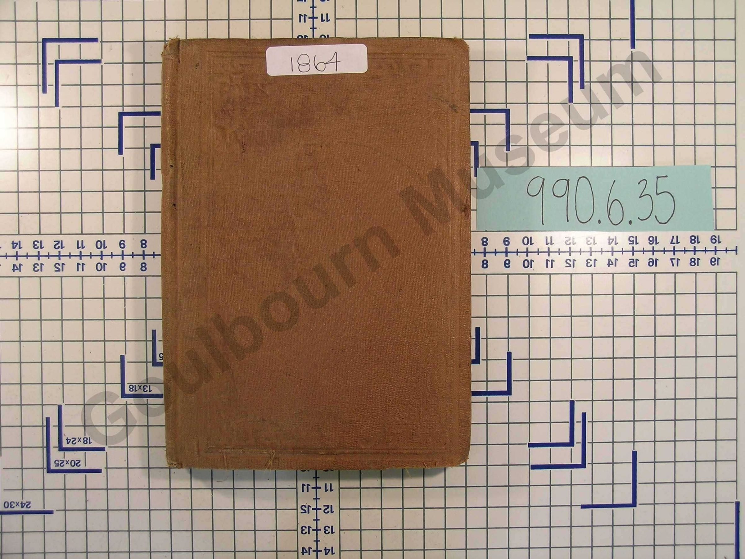 Light brown fabric cover, front and back covers are blank and have an embossed and decorated border. Abbreviated title "History of the Rebellion of Wexford - 1798" is on spine in gold text, but is faded, worn, and difficult to read.Lexicon
