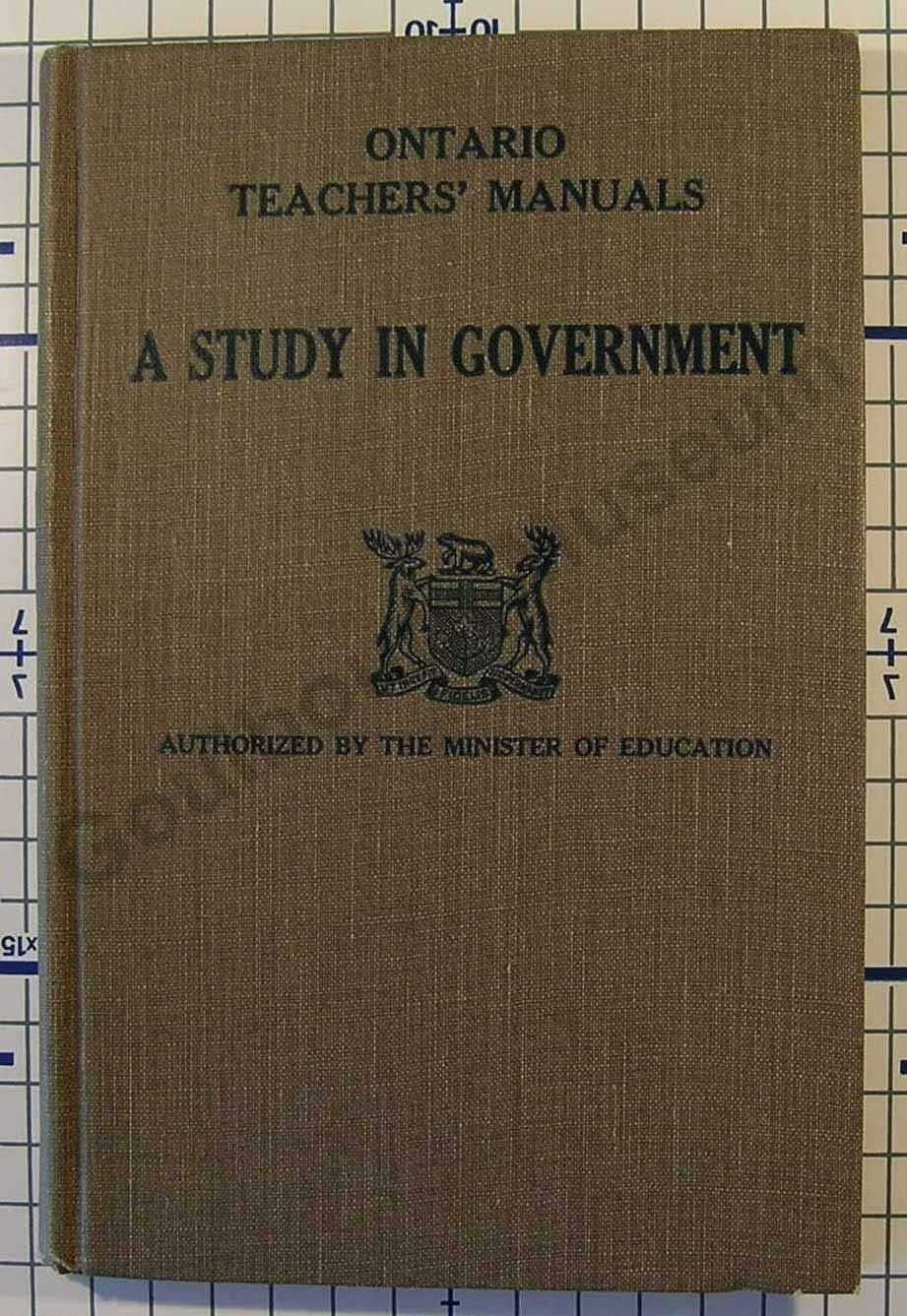 Brown textbook with the Ontario Education Board's coat of arms with black text reading "Ontario Teachers' Manual A Study in Government. Authorized by the Minister of Education".