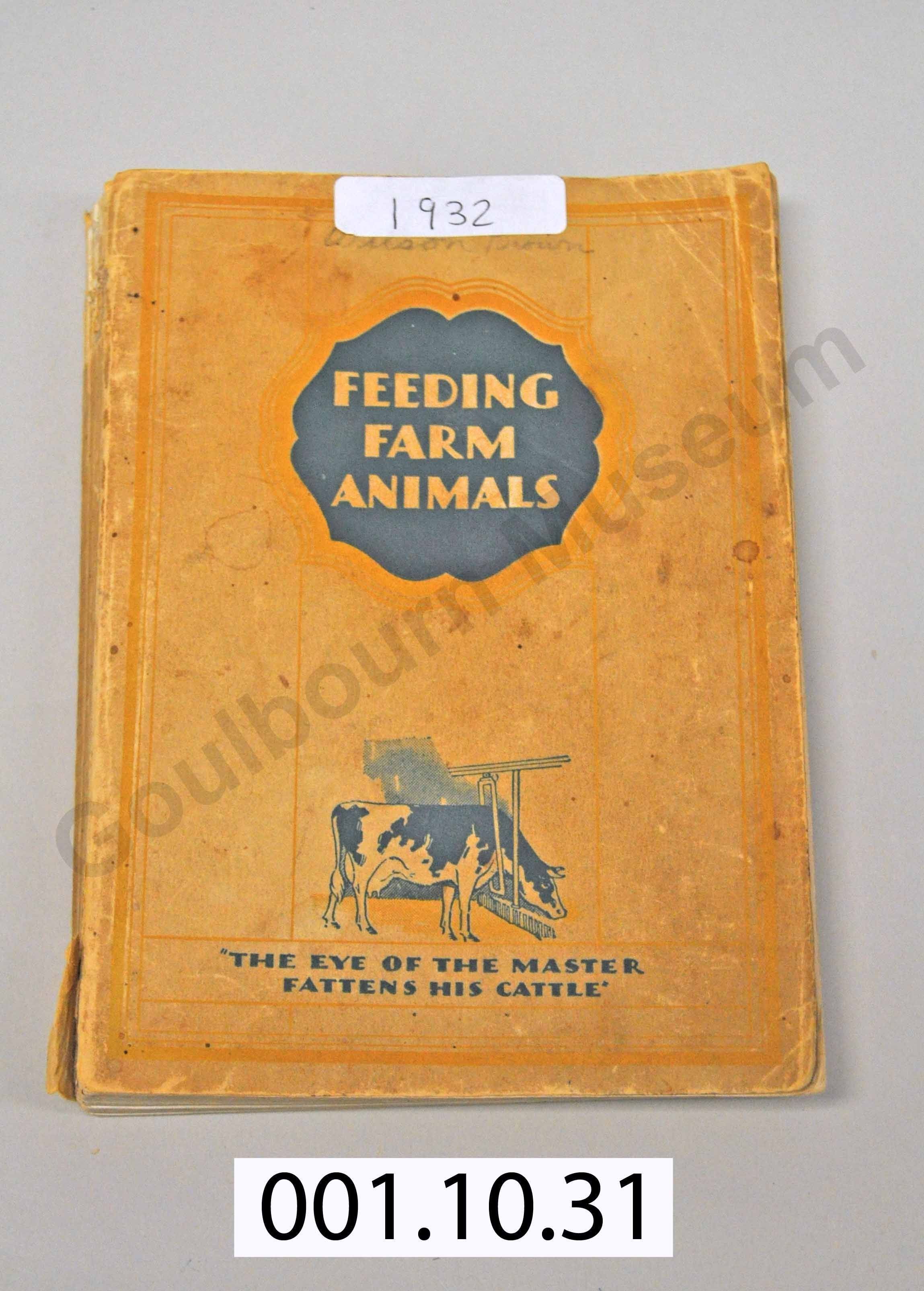 Book with a yellow-brown cover stock. An adhesive sticker with the date "1932" has been adhered to the top centre of the cover. The design of the book cover includes a central green coloured shape with the title, "Feeding Farm Animals" inside the shape. There is an illustration of a dairy cow under the title. At the bottom of the cover is printed, "The Eye of the Master Fattens his Cattle."Collection