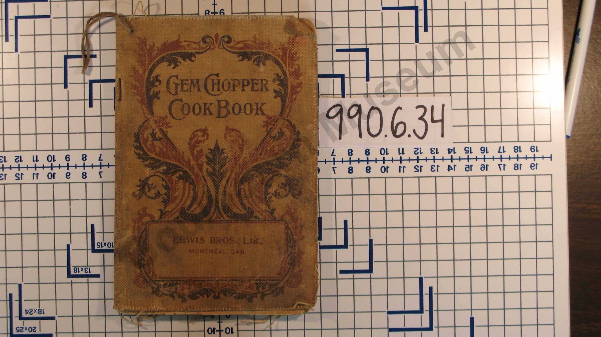 Copyright 1902 by Sargent & Co. Cover is fabric and booklet is assembled with one staple and a tied string near the top edge of the spine. Decorated with a red and brown leaf border around title and text box: Lewis Bros. Ltd., Montreal, Can. Back cover has same style border in the same colours but it is filled in with the design (no space for text). Has several pages dedicated to "My Own Recipes" with hand written recipes in both pencil and pen. No. 128 has a loose paper with a recipe for Rhubarb Marmalade written in dipped ink. Inside cover has inscription: Emma Switzer, Stittsville written in pencil.Collection