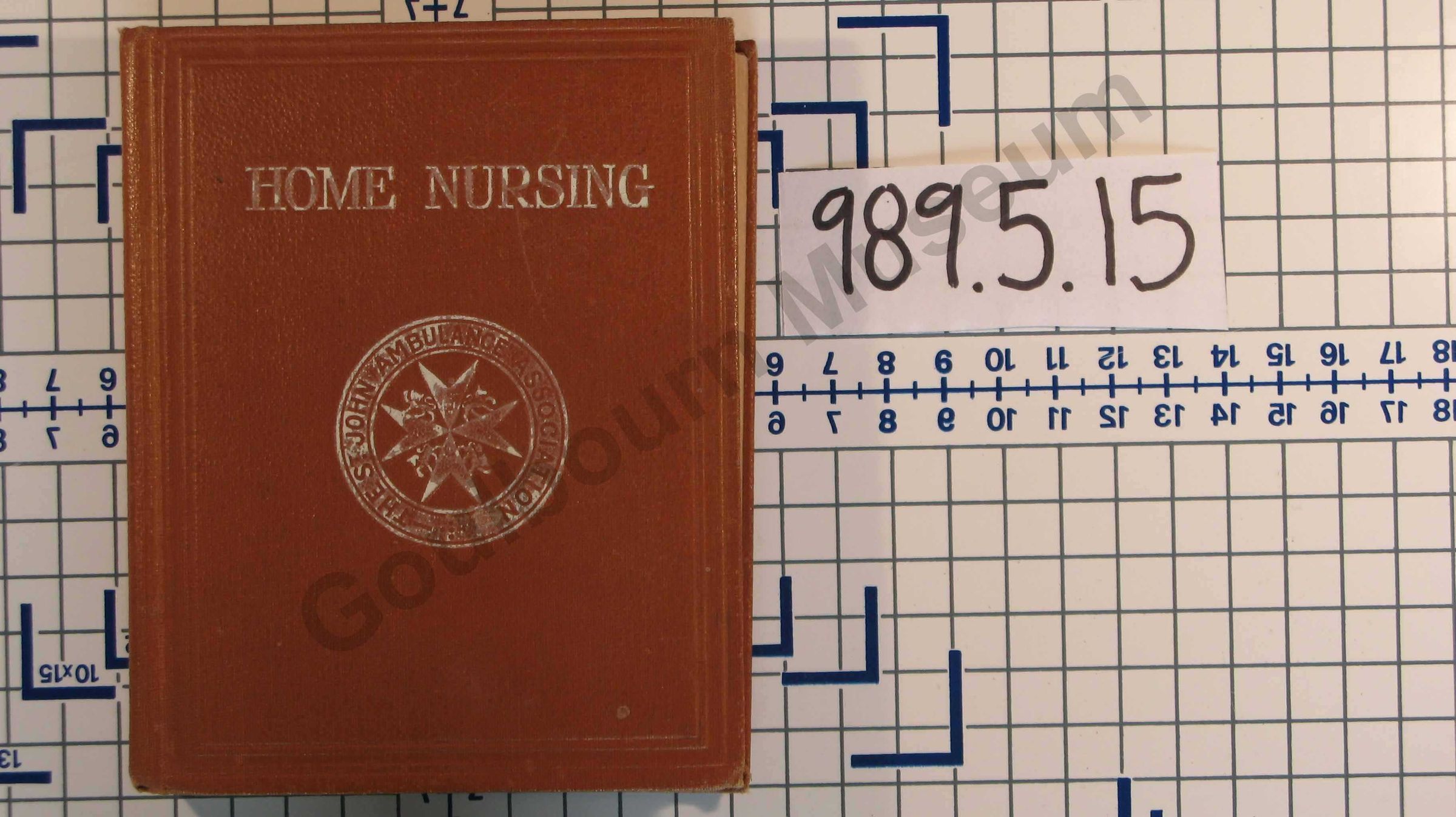 Hardcover book with orange/brown cover. The title, "Home Nursing" is embossed on the front cover in white capital letters. The logo for St. John's Ambulance appears below; the logo and text are surrounded by an embossed border consisting of four thin lines. The title and year are written on the spine in white lettering. The back cover contains a matching embossed border, but is otherwise blank. Written by Mildred Heather-Bigg. Text written on the title page reads: "Home Nursing: Arranged According to the Revised Syllabus of the St. John Ambulance Association; Compiled by a Committee Principally from the Original Manuscript. Written at the Request of the Association by Mildred Heather-Bigg, R.R.C., Matron of the Charing Cross Hospital, and Lady of Grace of the Order of St. John of Jerusalem in England. Price 1s. 6d. Net (y Post 1s. 81/2d). London: St. John"s Gate, Clerkenwell, E.C.1. W.H. & L.C.1.25, 000.6.1918."Lexicon