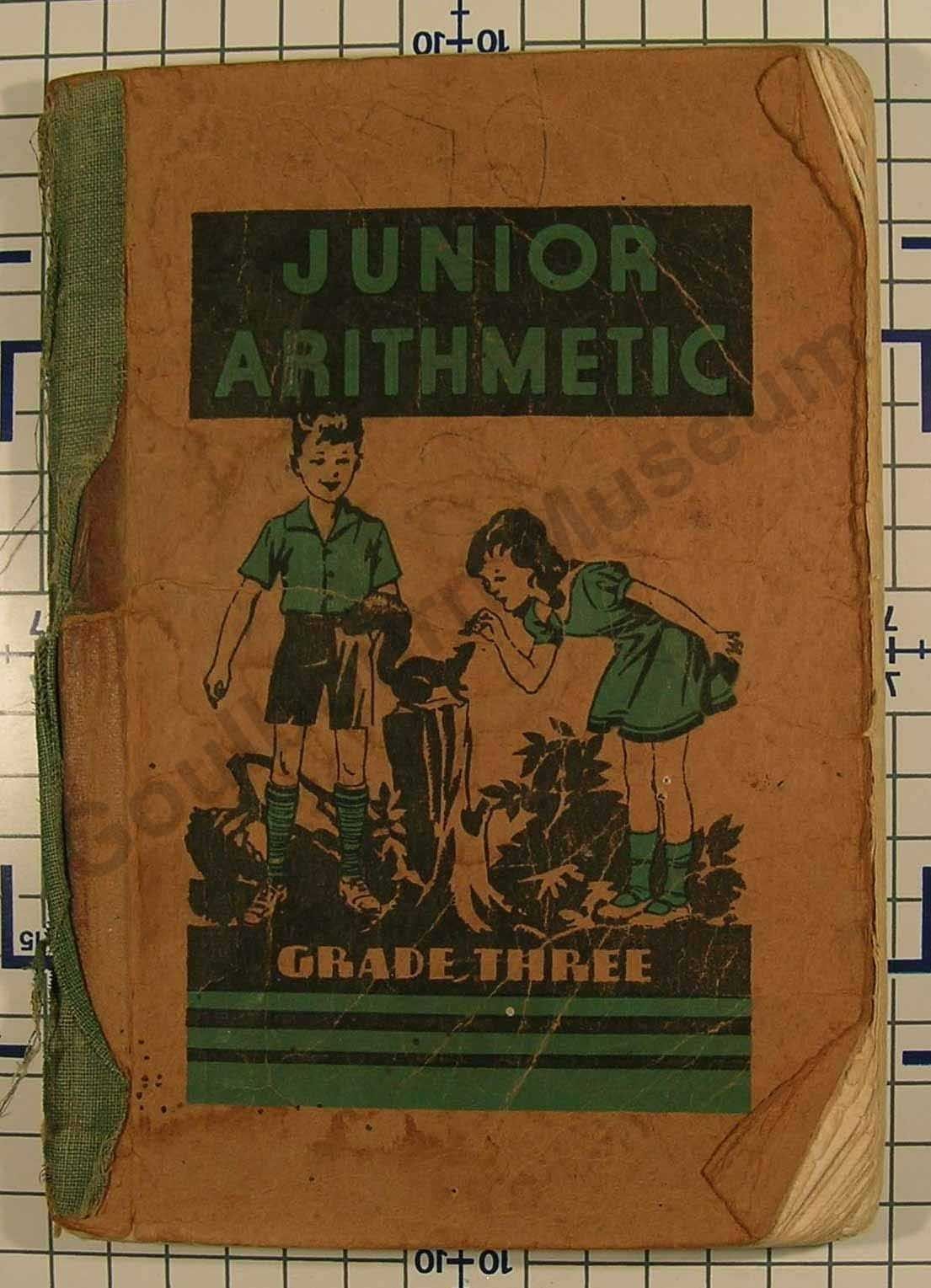 Light brown paper with black and green lettering, reading "Junior Arthimetic Grade Three" and depicting a young boy and girl interacting with a squirrel on a tree stump.