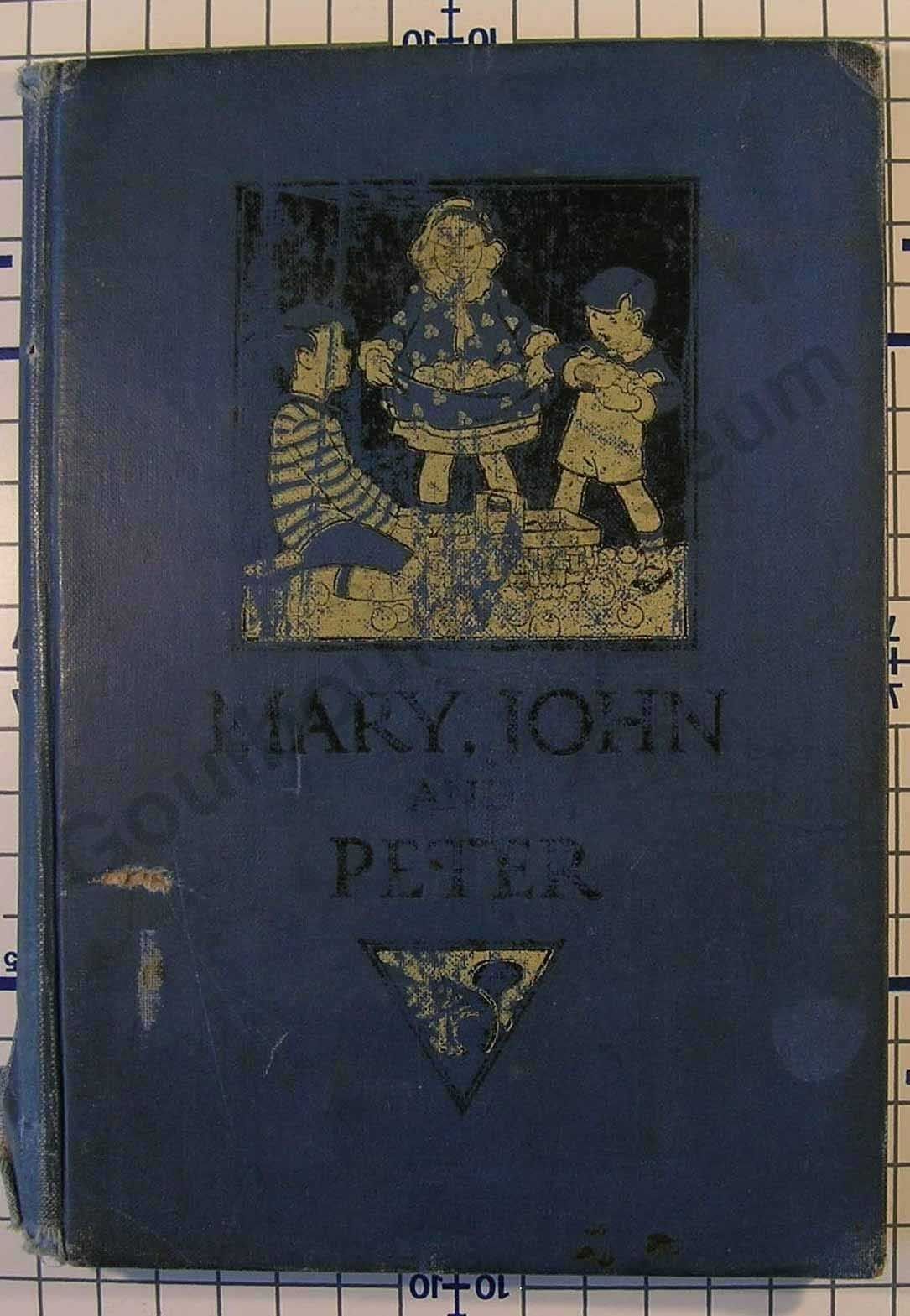 "Mary, John and Peter" One thin hard cover book. The cover is medium blue and has a yellow image of three children playing with toys in the top third of the front cover. Under, in caps, you can read "Mary, John, and Peter" stamped in black ink. There is a triangular motif that appears to be a paisley pattern. There is a lot of wear on the corners and the spine. It is 112 pages long, containing short reading lessons, poems, and memorization exercises. there are many coloured photographs inside. the inside covers are filled with a pictorial glossary of the key terms in the reading lessons.Collection