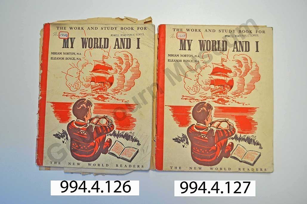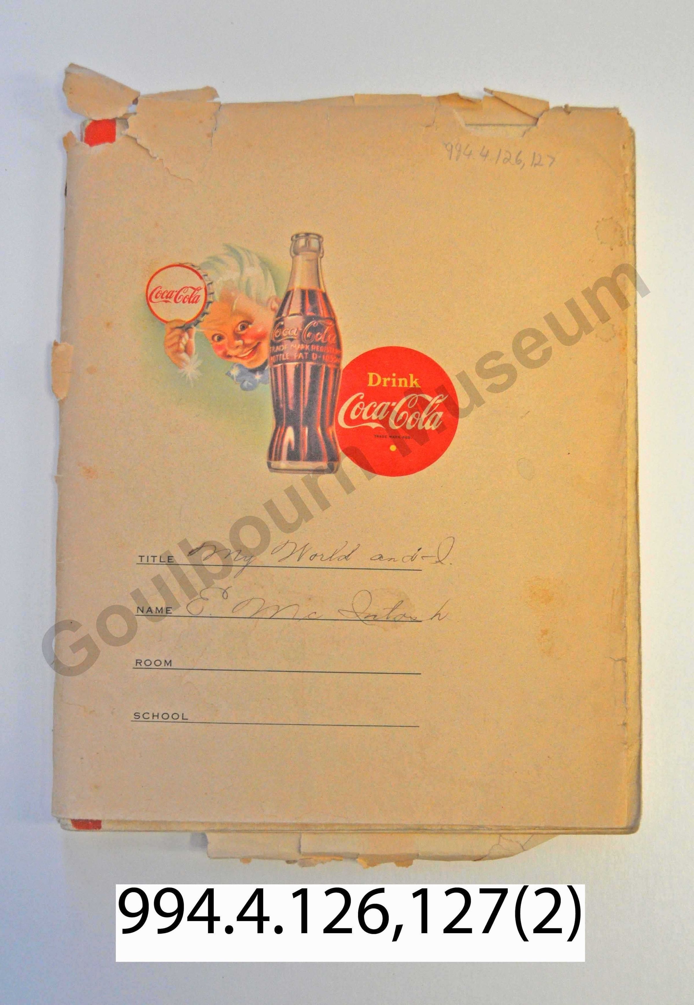 One white, red and black cover with black lettering. The cover shows a young boy sitting on a grassy hill over looking a body of water with an open book next to him. A tall ship riding a wave in the back ground surrounded by clouds. At the top is the title "The Work and Study Book for My World and I" for #1646Miriam Norton M.A. Eleanor Boyce, M.A. At the bottom of the cover is the text "The New World Readers". Book is in white Coca Cola Jacket with an image of a white haired smiling man, a full Coca Cola bottle and a red circle with white text reading `Drink Coca Cola". Below the image is a title "My World and I" and E. McIntosh".Collection