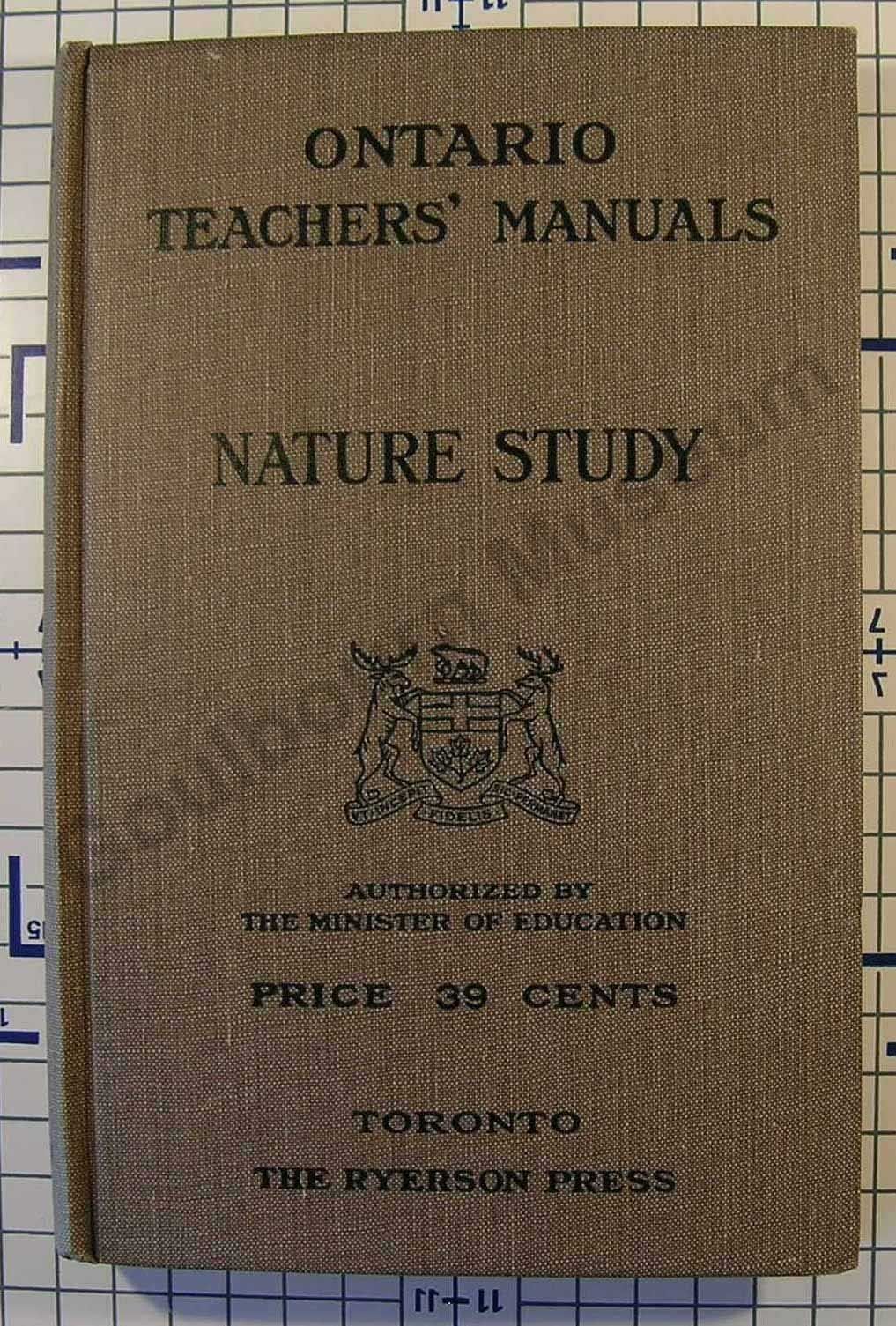 Brown book with black text depicting the coat of arms of Ontario, reading as "Ontario Teachers' Manuals. Nature Study, Authorized by the Minister of Education".