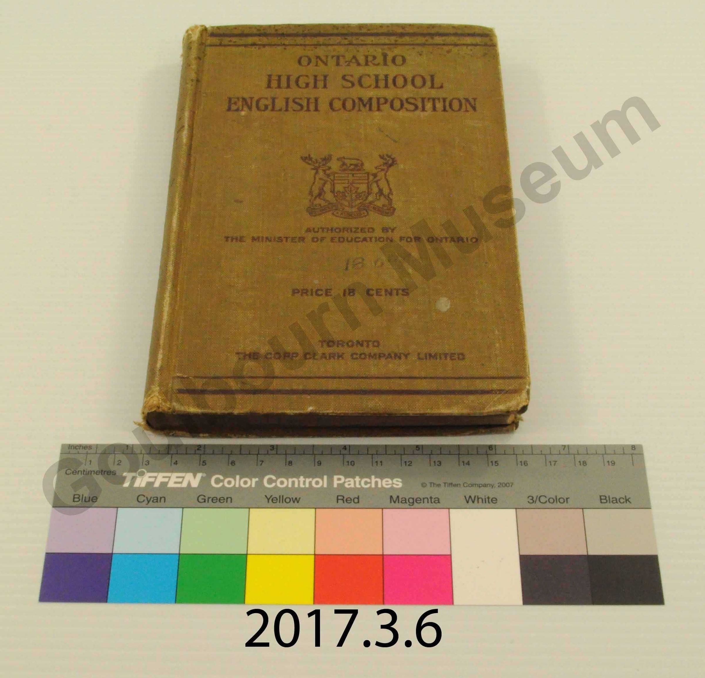 The book is a dark brown colour with areas of white due to wear. The writing on the book is in black ink, although it has faded considerably to almost a dark brown colour. The book has two lines travelling horizontally at the bottom and the top of the front cover. One line is thicker than the other. At the top of the front cover the book reads "Ontario HIGH SCHOOL ENGLISH COMPOSITION" followed by the Ontario crest in the centre, and the words "Authourized by the Minister of Education for Ontario" and then written in pencil below it "18,000". Near the bottom of the book it reads "Price 18 Cents, Toronto The Copp Clark Company Limited." The spine of the book reads "Ontario High School Composition" The reverse of the book or back cover is simply dark brown with no words or designs.Context