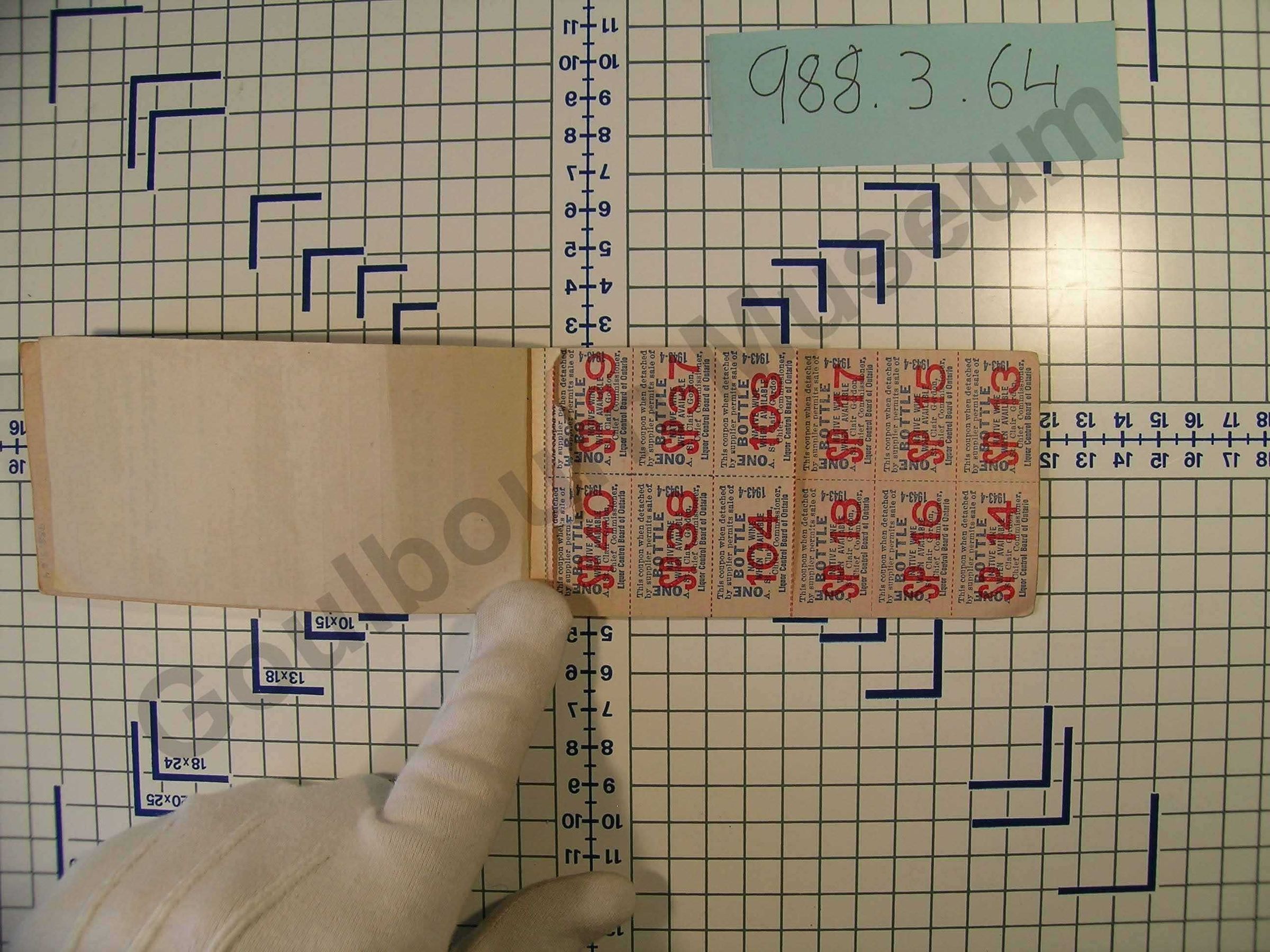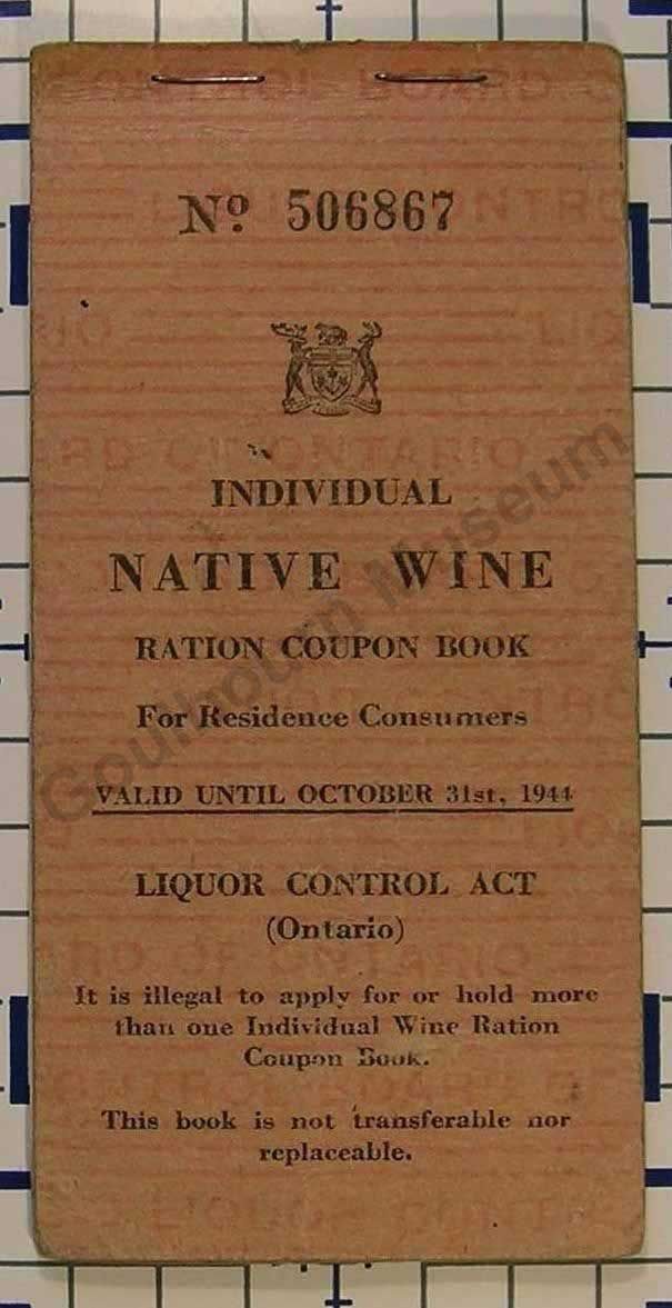 A rectangular Ration Coupon book for native Wine in 1944. The cover has red lines and font "Control Board" and "Card of Ontario". There are two metal staples on the top edge of the book. The black font on the front "No.506867, Individual native Wine Ration Coupon Book For Residence Consumers. Valid Until October 31 st, 1944. Liquor Control Act (Ontario). It is illegal to apply for or hold more than one Individual Wine Ration Coupon Book. This book is not transferable or replaceable.