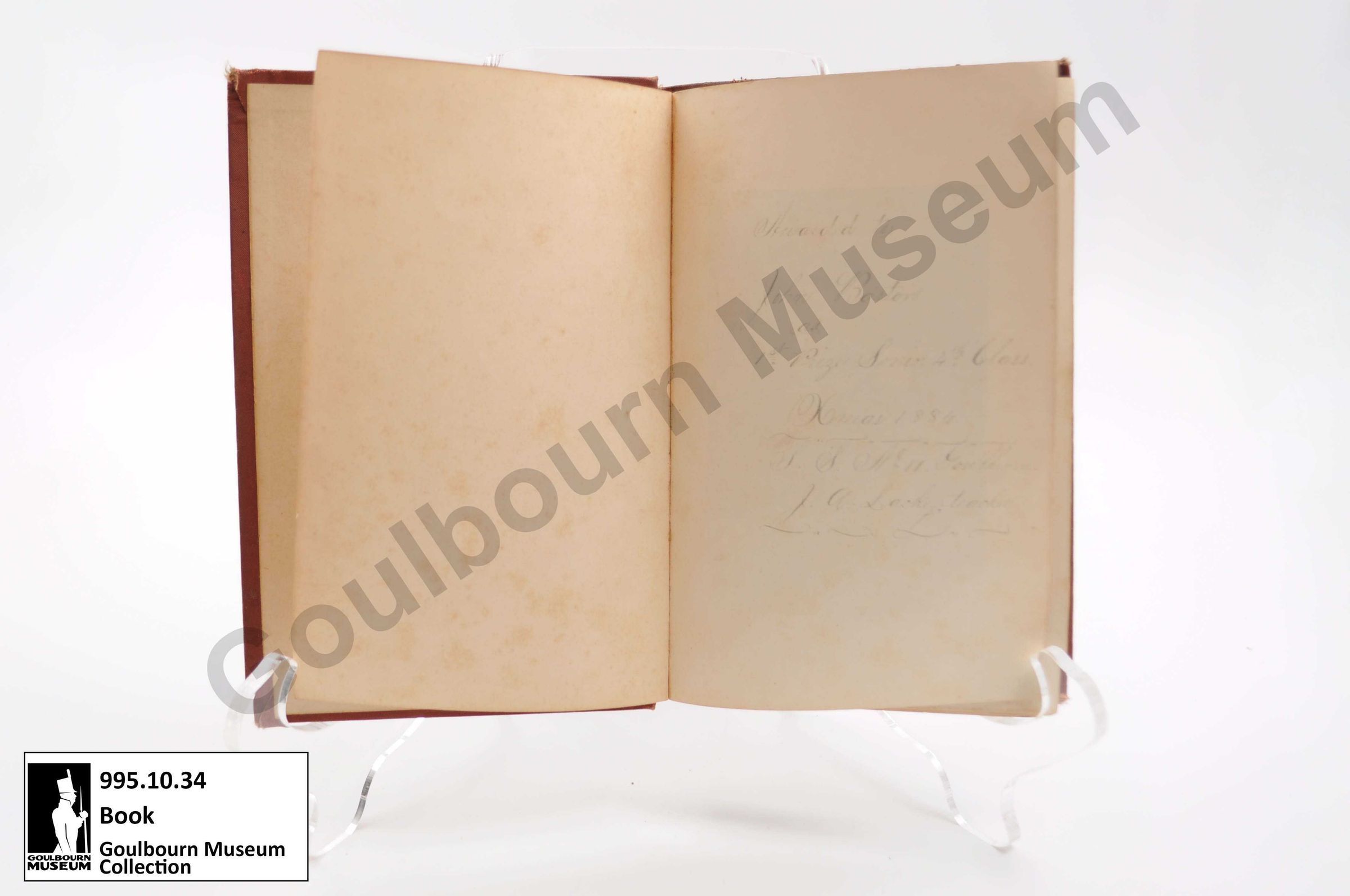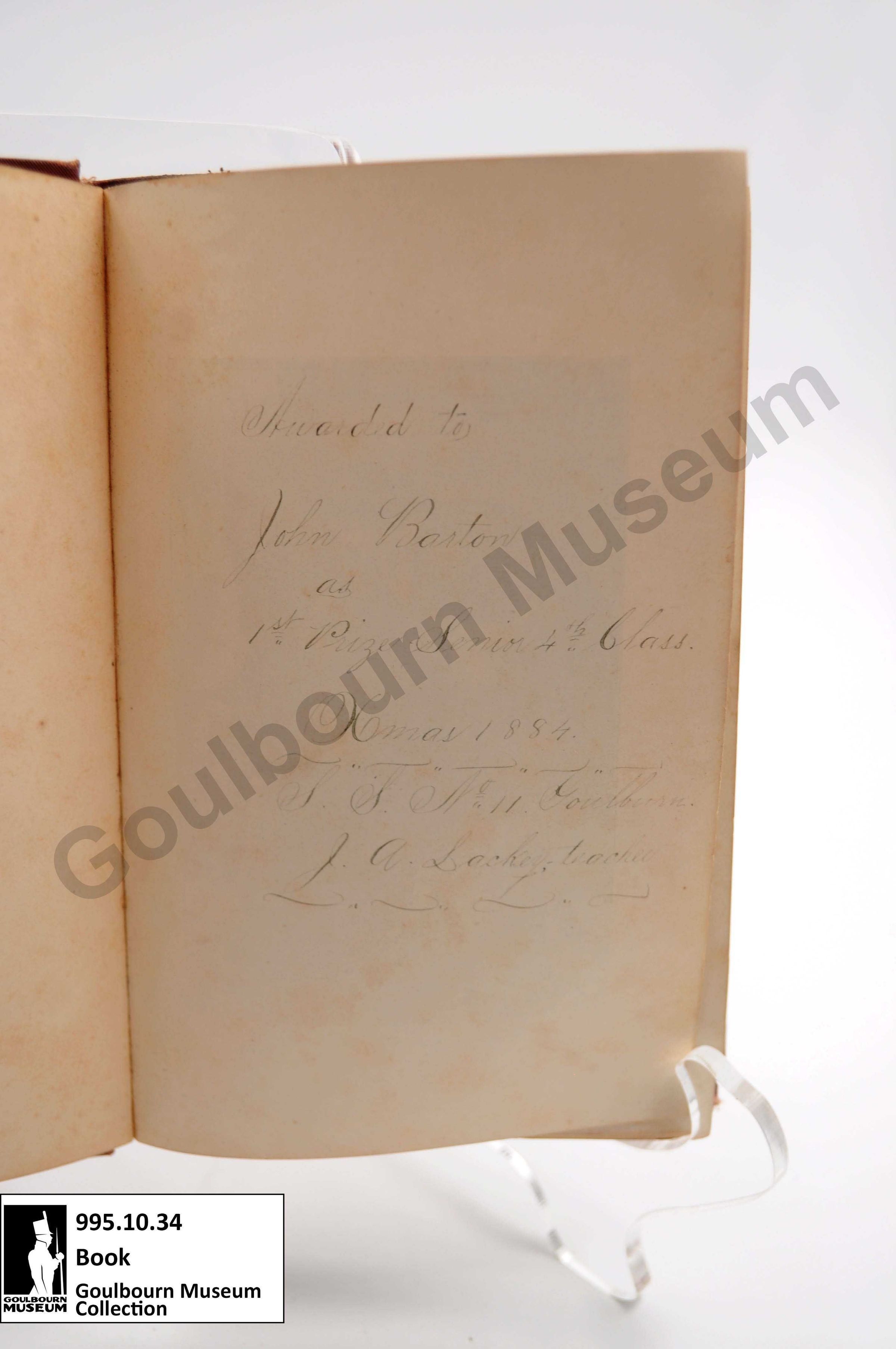 Inscription, Awarded to John Barton as 1st prize senior 4th class Xmas 1884 S.S. No 11 Goulbourn JA Lackey teacher