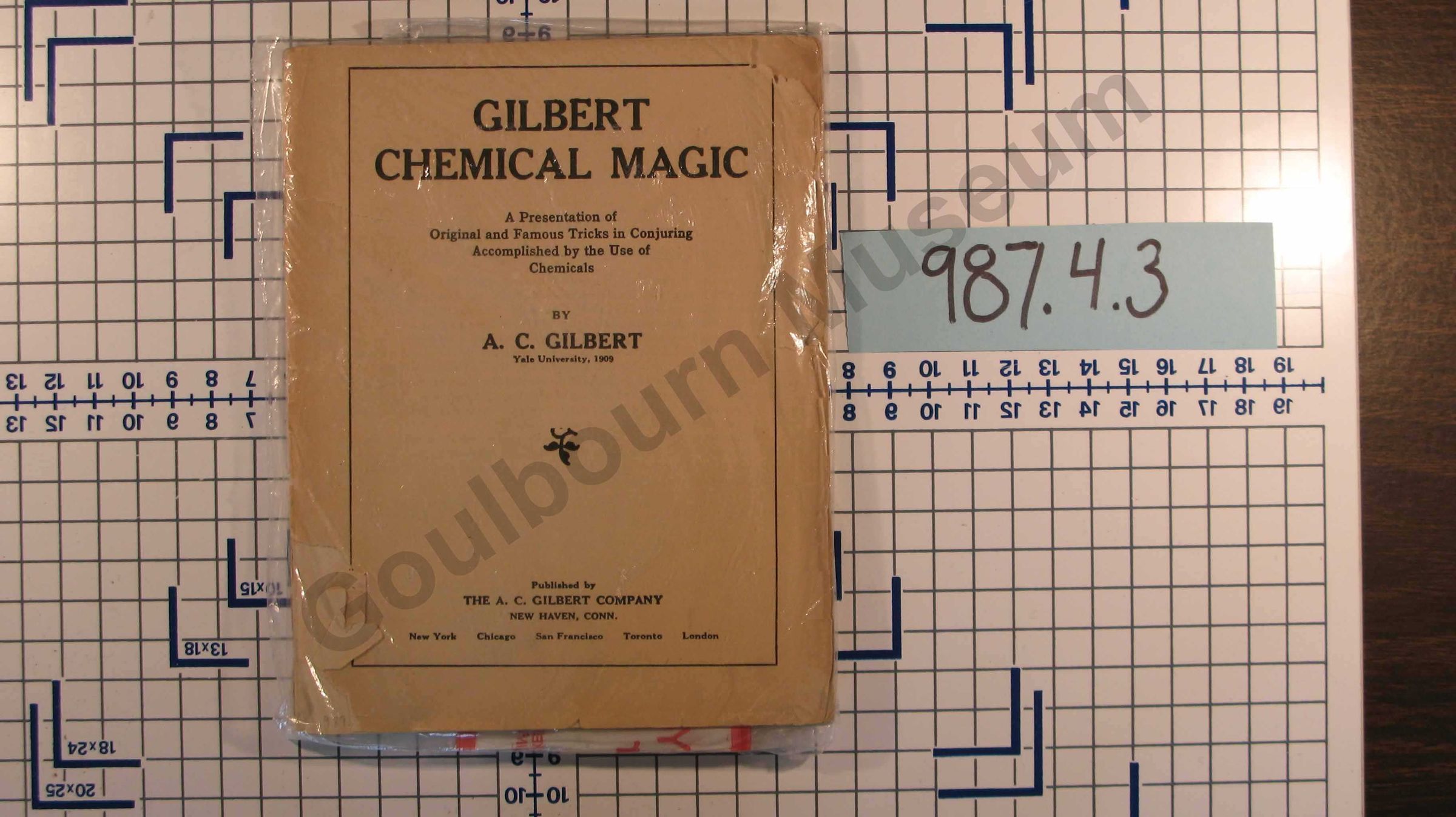 Book with beige paper cover. Text on the front cover, written in black font, reads "Gilbert Chemical Magic. A Presentation of Original and Famous Tricks in Conjuring Accomplished by the Use of Chemicals. By A.C. Gilbert, Yale University, 1909." Published by The A.C. Gilbert Company, New Haven, Conn.Made/Created