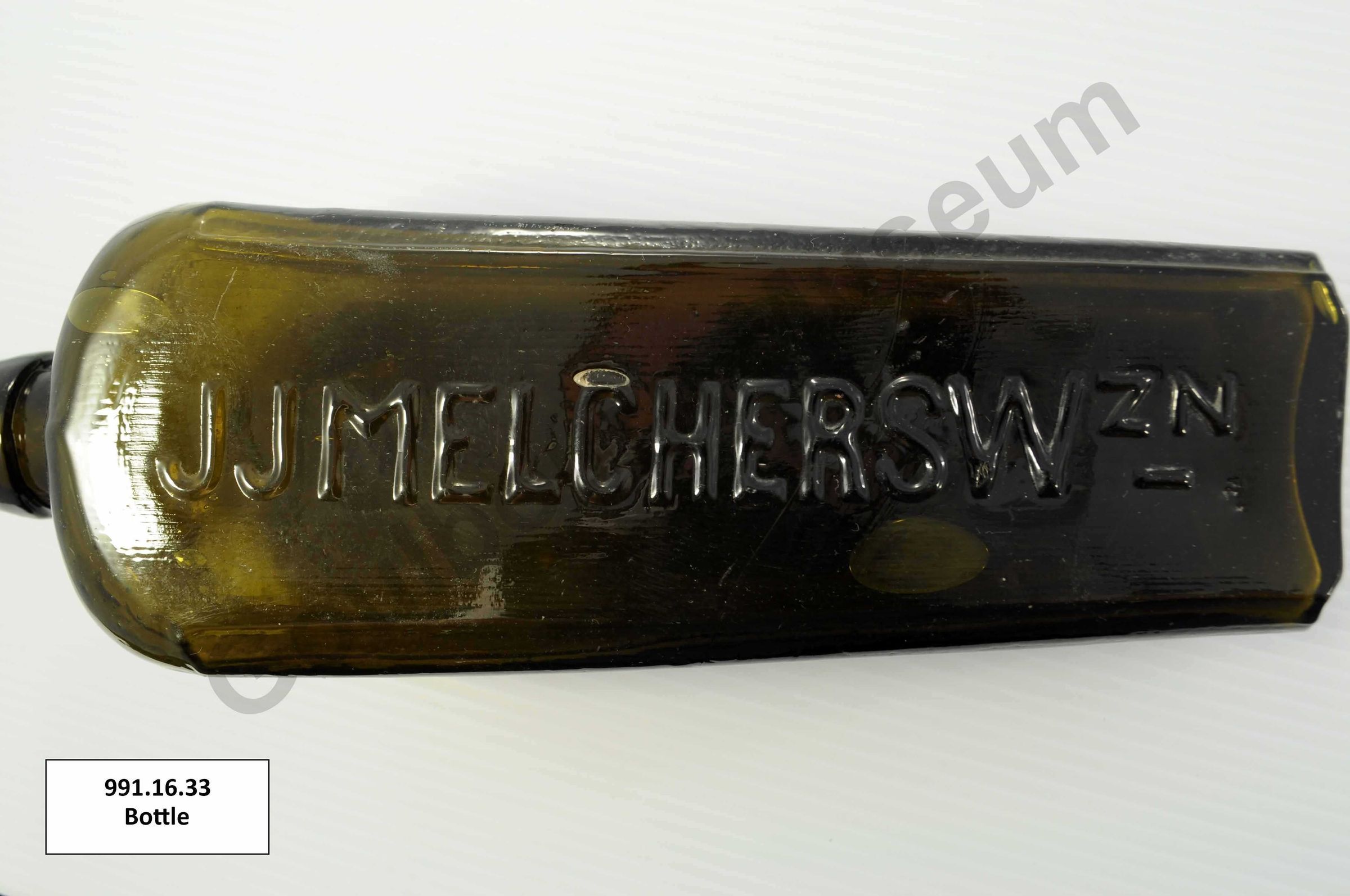 Tapered dark green glass bottle with raised lettering that reads "JJ MELCHERSW ZN", bubble inclusions.