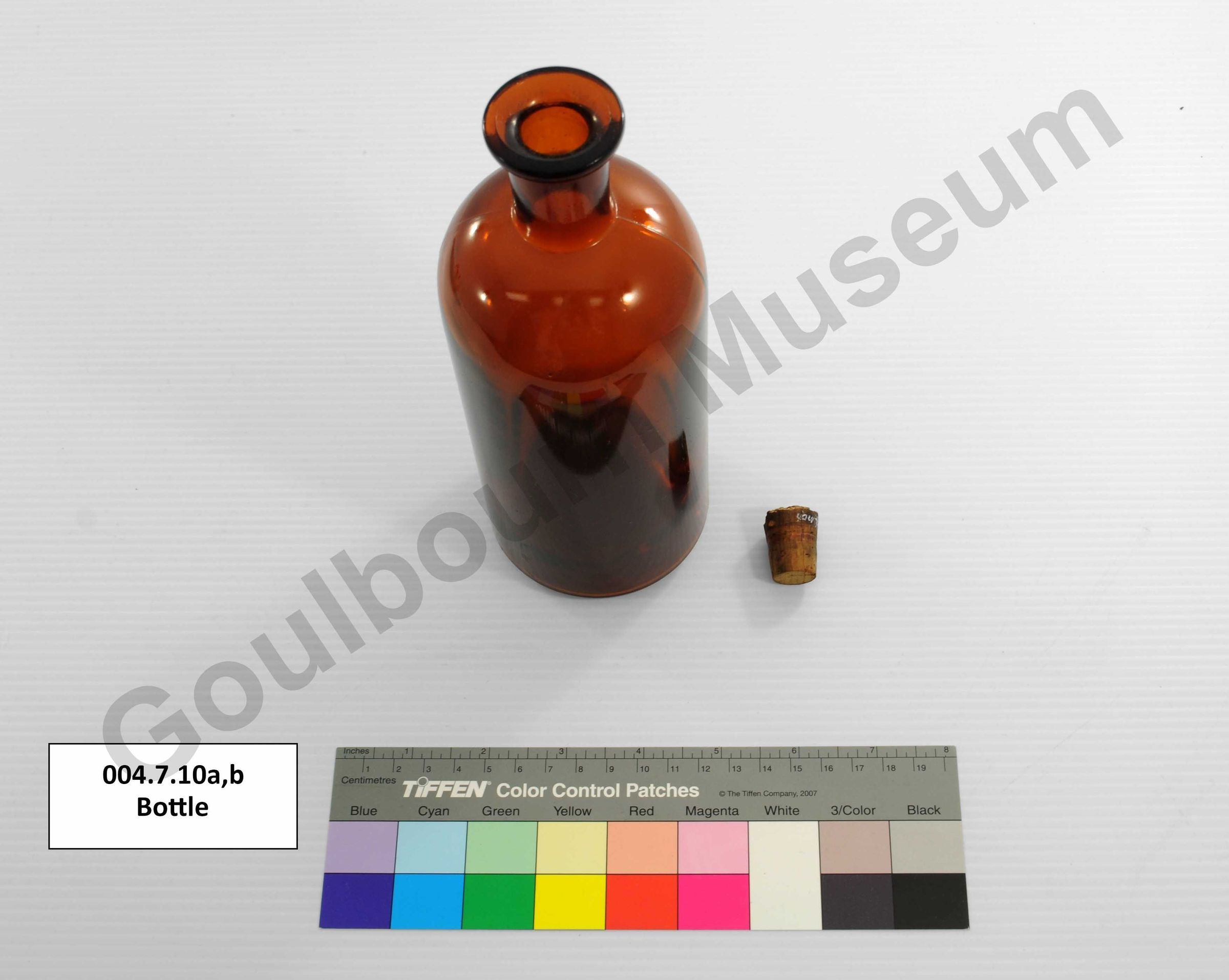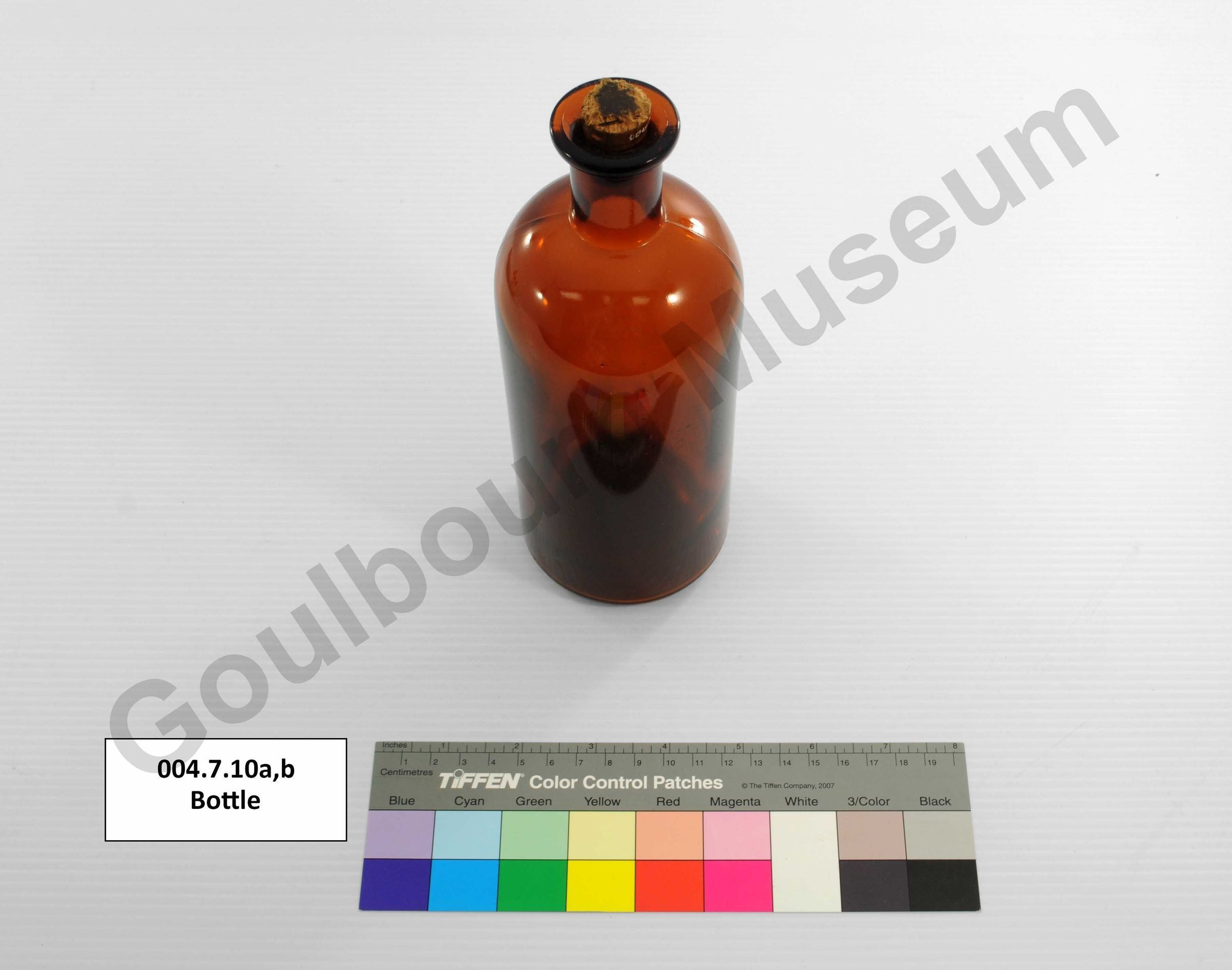 Dark brown glass bottle with a cork stopper. The 4 cm long neck has a large rim. There are no identifying marks or label.