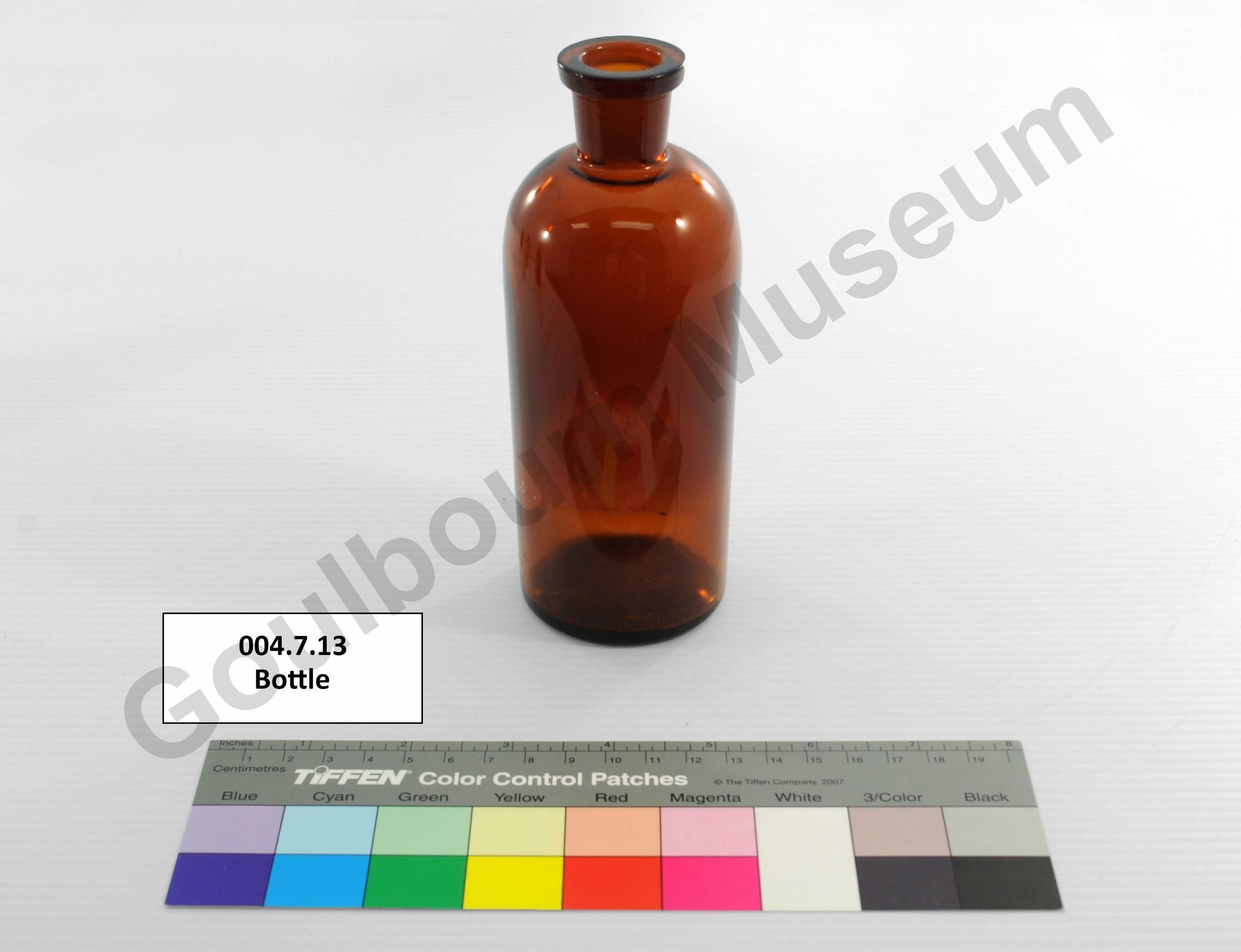 Dark brown glass bottle with a neck for a stopper (stopper missing). The neck has a broad rim. The bottom has "TC W-CO U.S.A. 5-M-221" embossed.