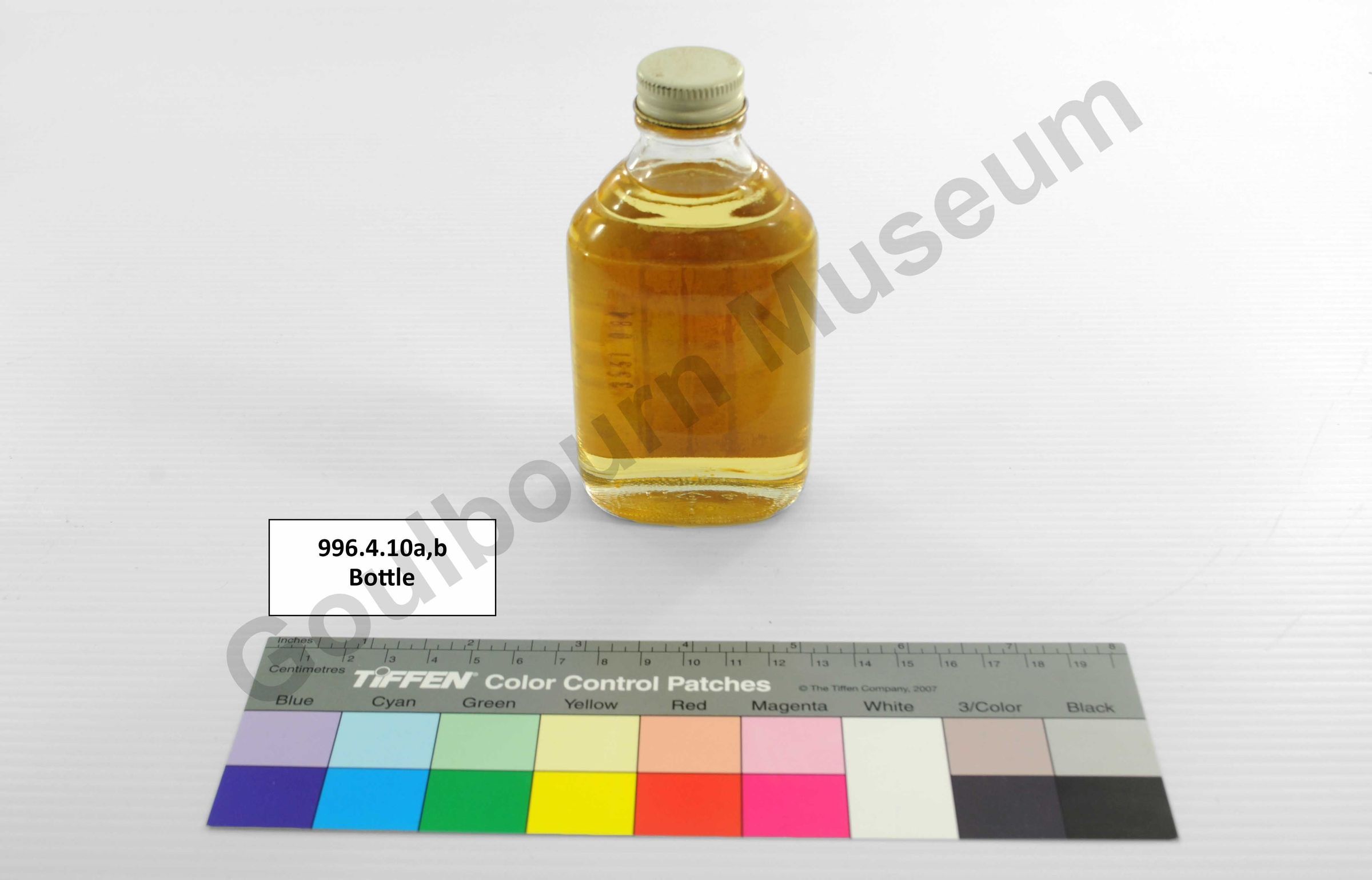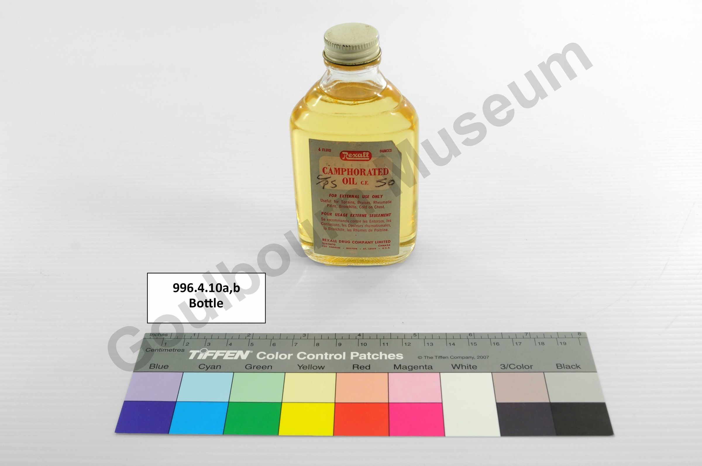 One clear glass bottle filled with a yellow liquid. On the bottle is a light blue rectangle label that says Camphorated Oil in red lettering. On the top of the bottle is a white metal cap screwed on.