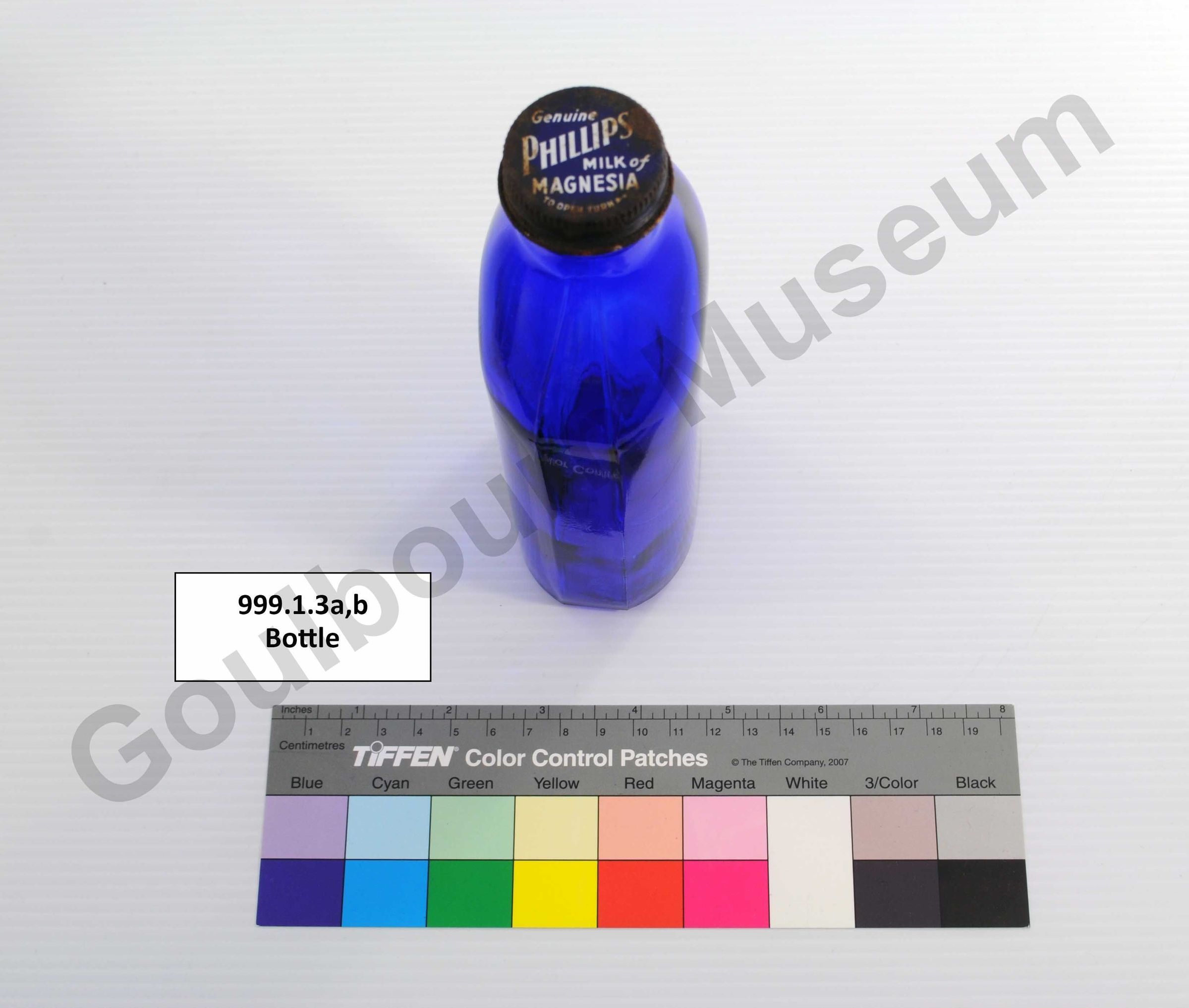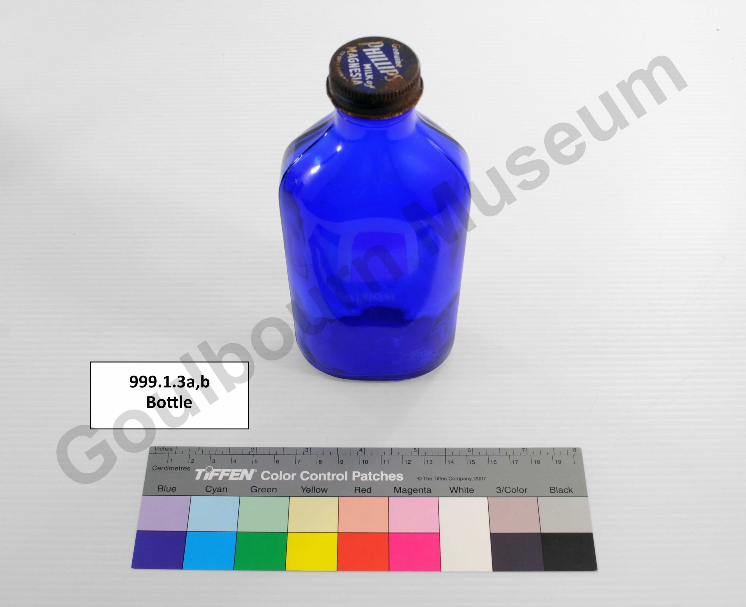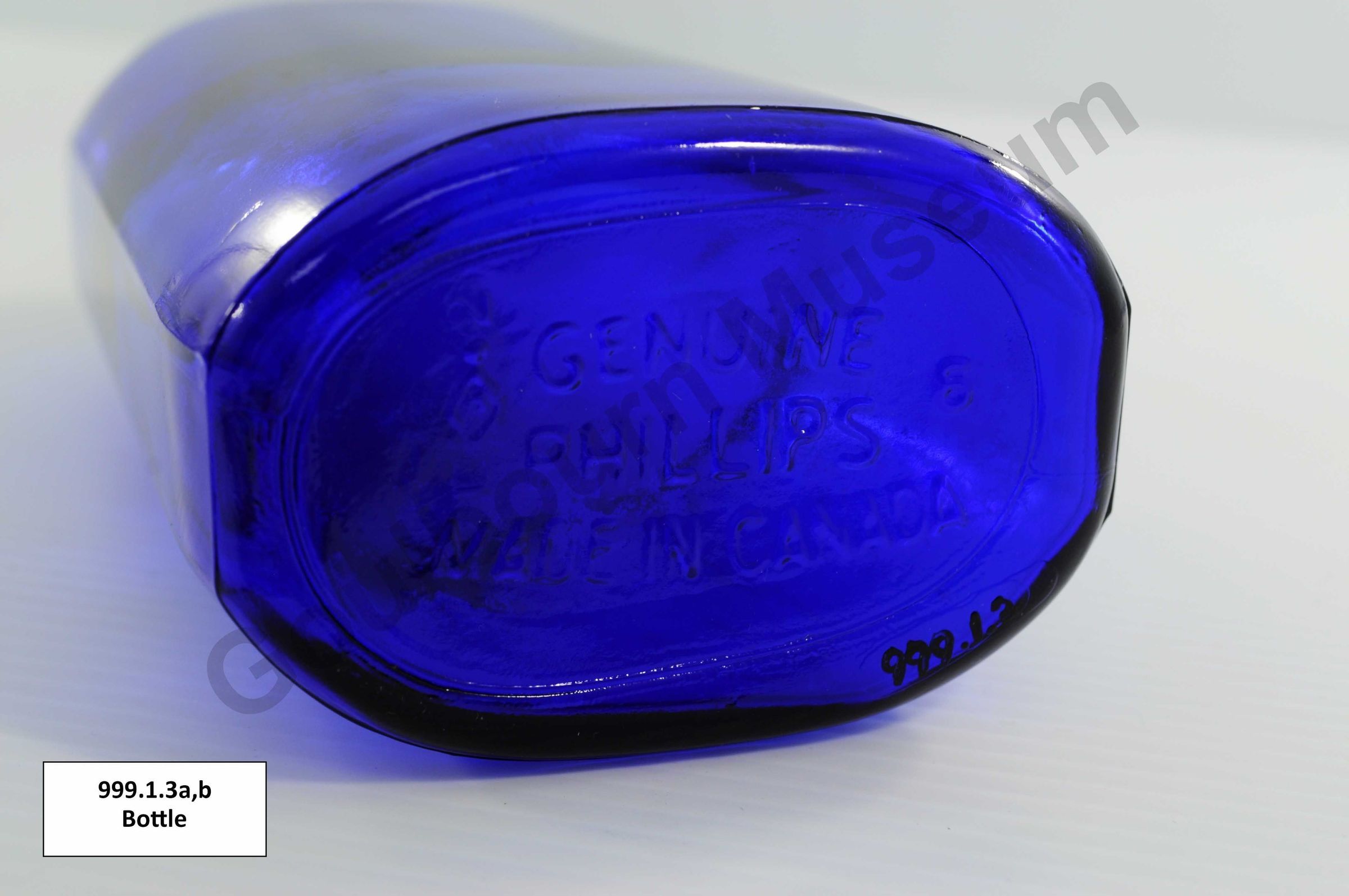 Blue glass bottle with raised lettering on base "Genuine Phillips Made in Canada". Metal screw-on lid blue with white lettering "Genuine Phillips Milk of Magnesia, to open turn".