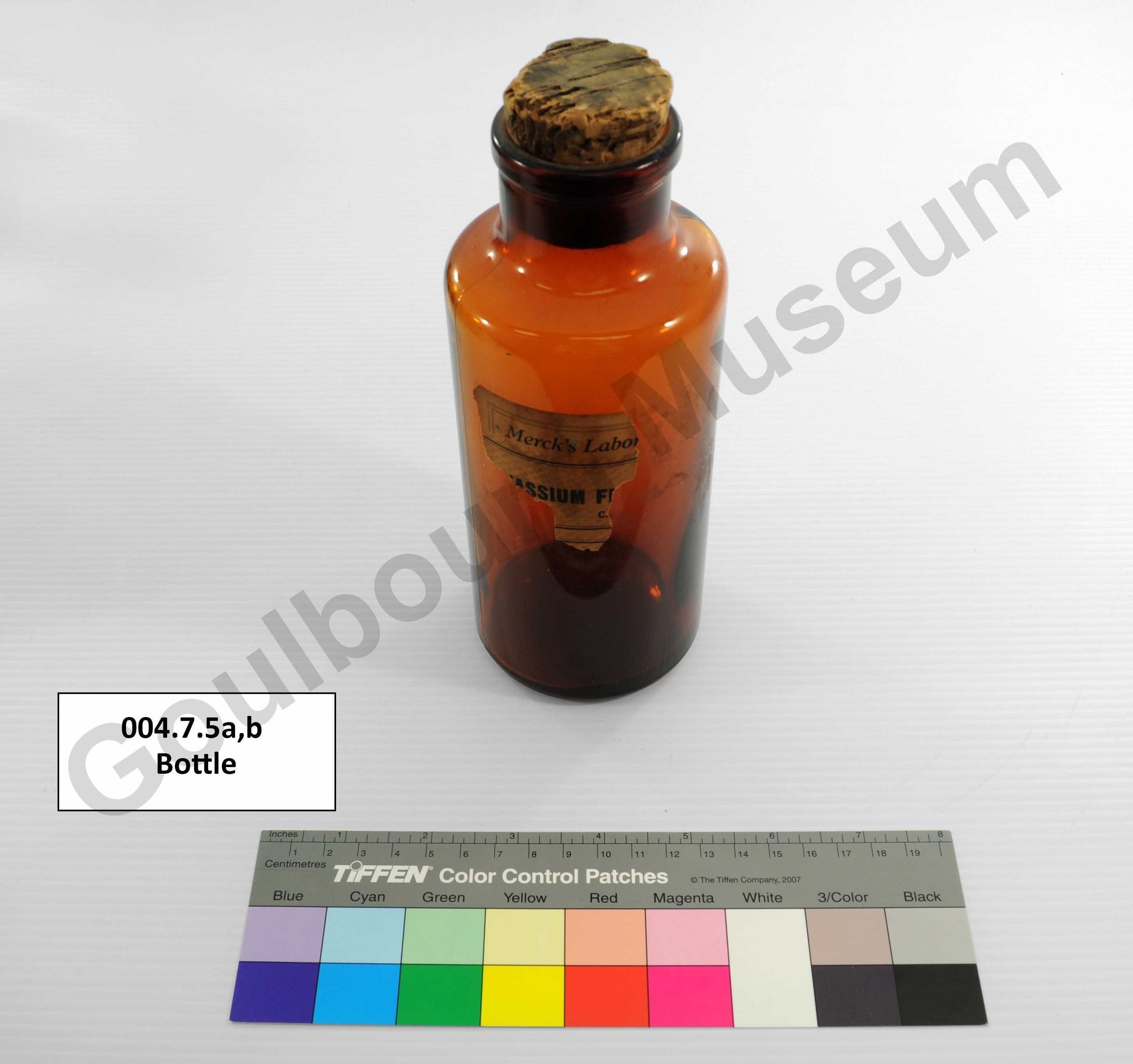Brown cylindrical glass jar bottle, straight sided with a cork-stoppered neck. The numbers 5 & 16 are emobssed on the bottom, along with a symbol of a diamond shape across an oval. The remains of a label read "Merck's Labo...tassium f."Context