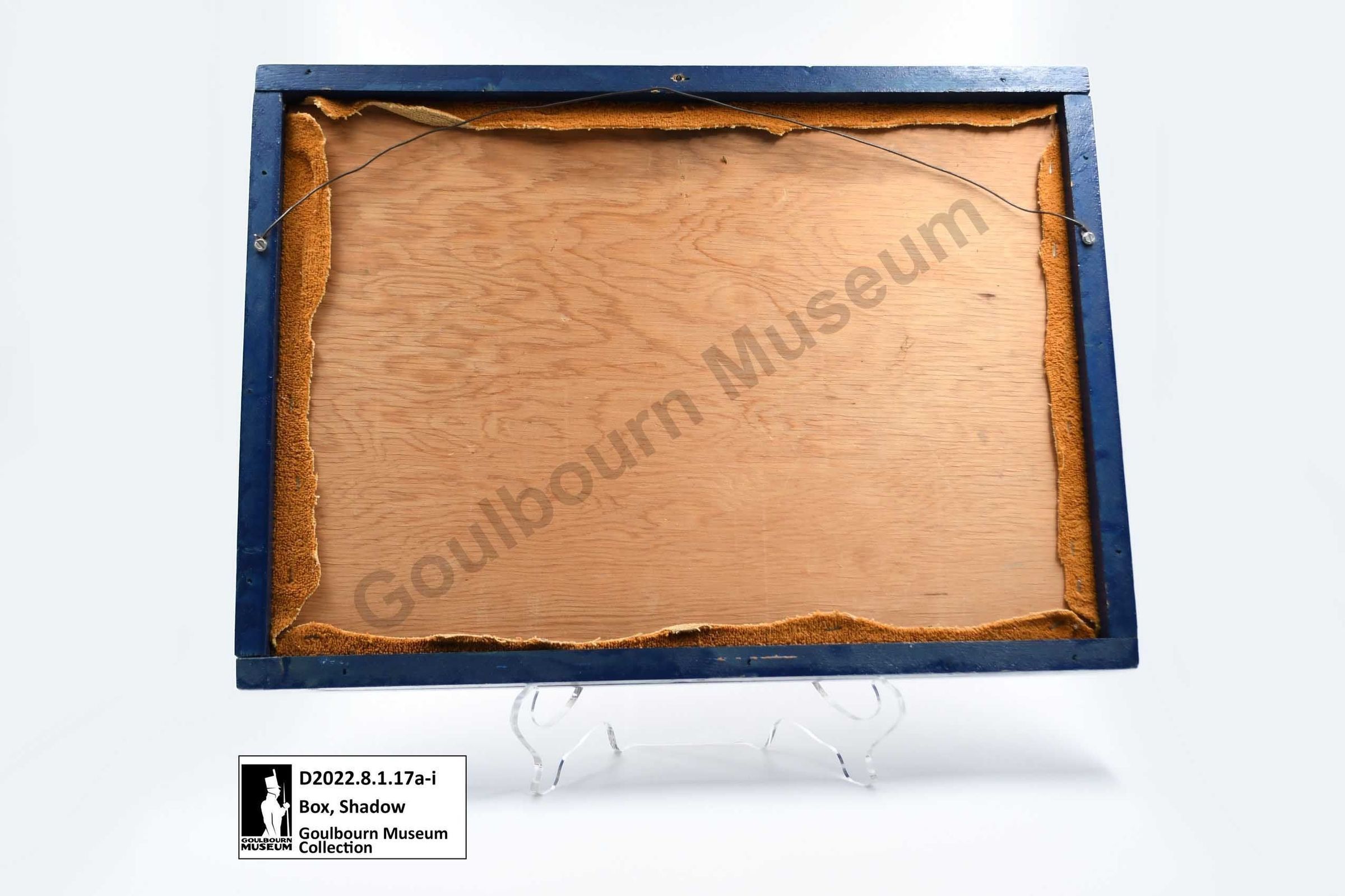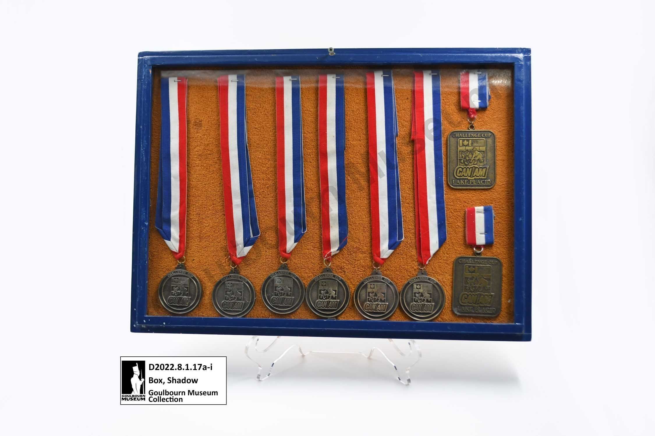 Handmade shadow box made of wood and painted in a high gloss navy blue paint. The shadow box has a glass front and orange coloured fabric backing board inside the box. There are eight CAN/AM hockey tournament medals mounted horizontally across the width of the box. The left six medals are circular pendants attached to a blue, red and white ribbon which has been folded in half and attached to the backing board at the top of the ribbon. The medal has a blank back, on its face it reads, "Challenge Cup" "CAN/AM" with an image of two individuals playing hockey in the foreground with a Canada and United States of America flag in the background. The two medals on the right most side are mounted vertically, one above the other. They are rectangular in shape with rounded corners, have a blank back and on the front they read, "Challenge Cup" "CAN/AM" "Lake Placid". The image on the face of the two medals consists of two individuals playing hockey in the foreground with a Canada and United States of America flag in the background.Context