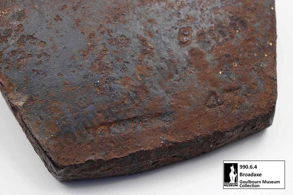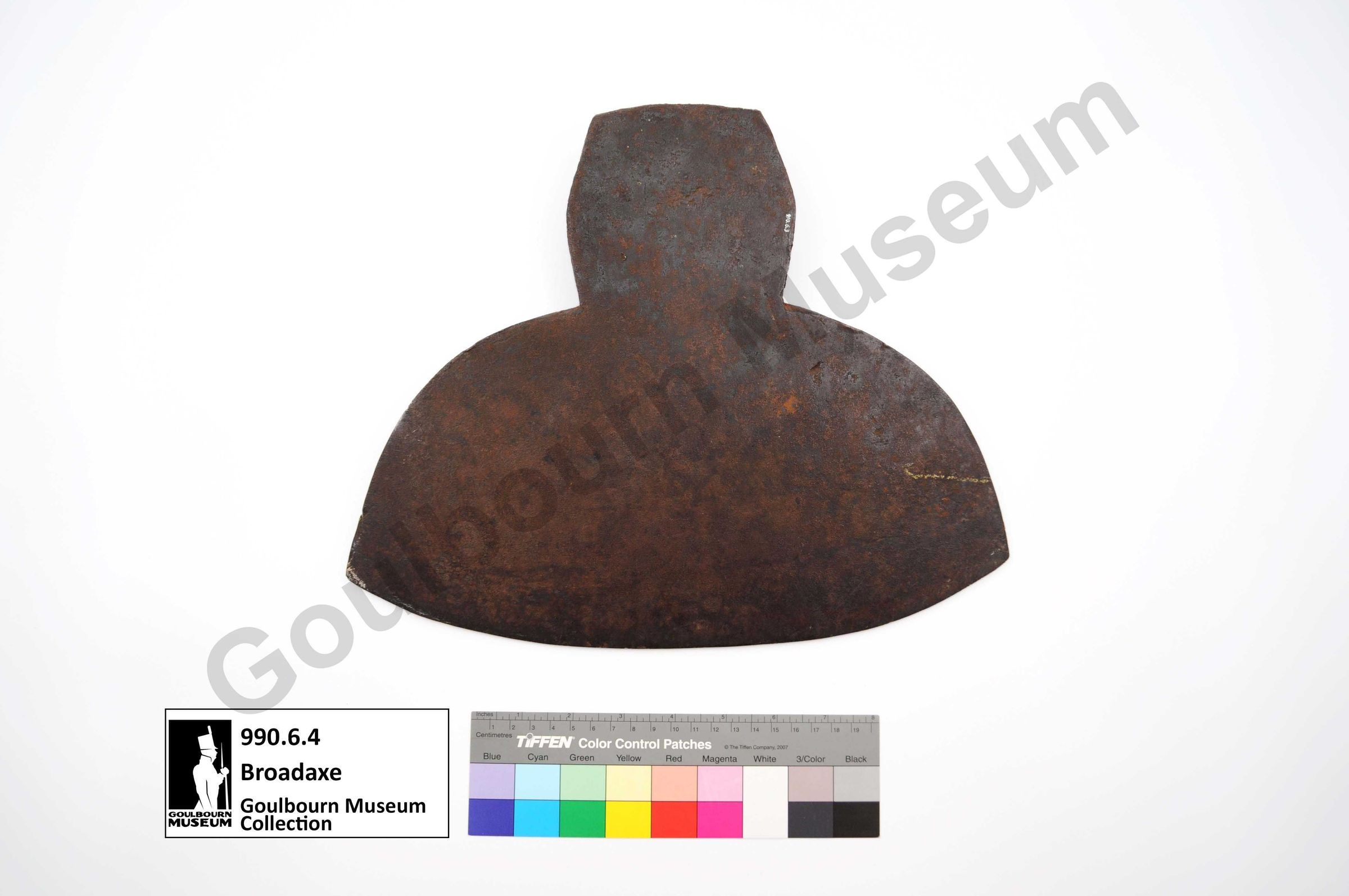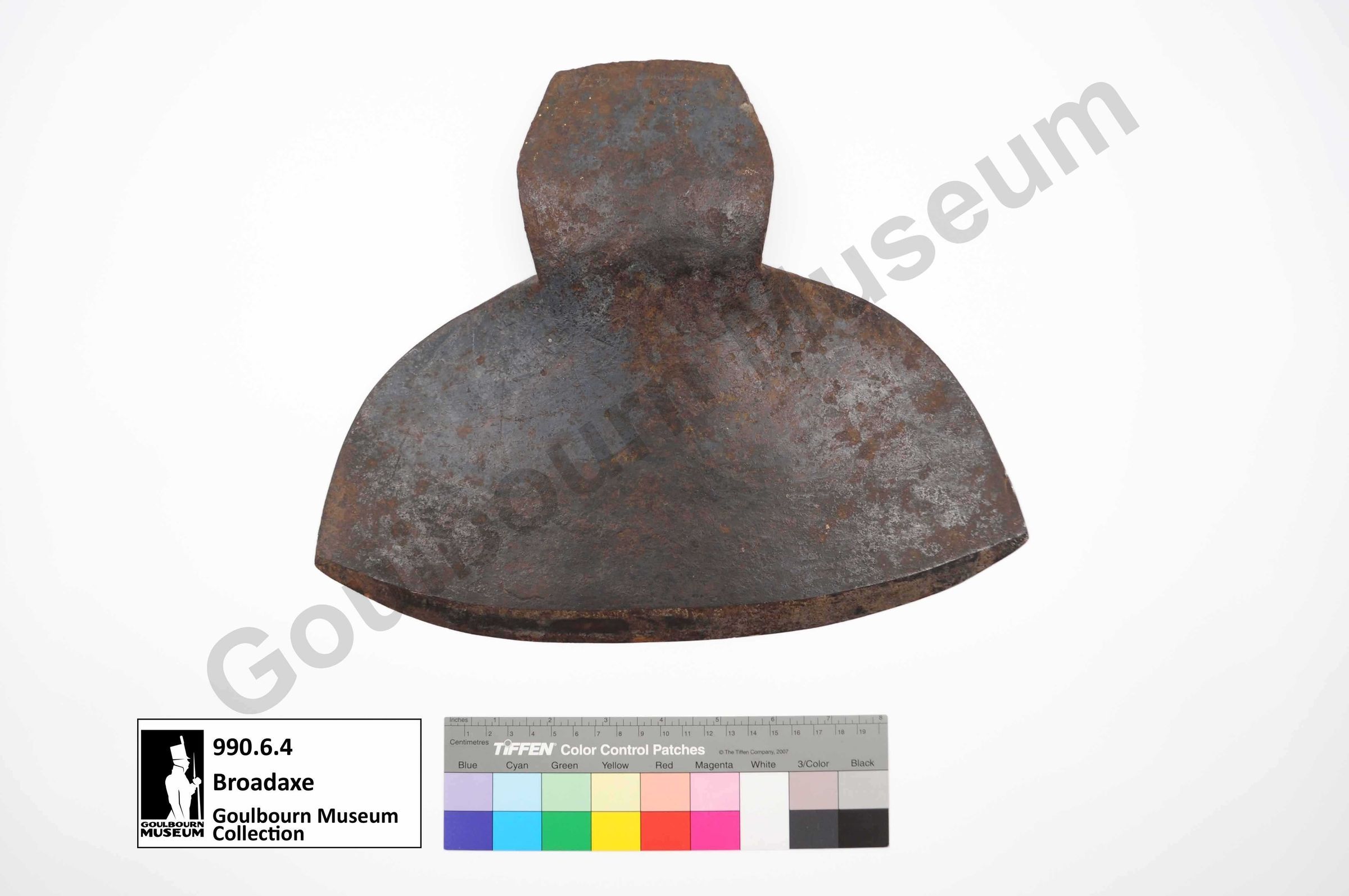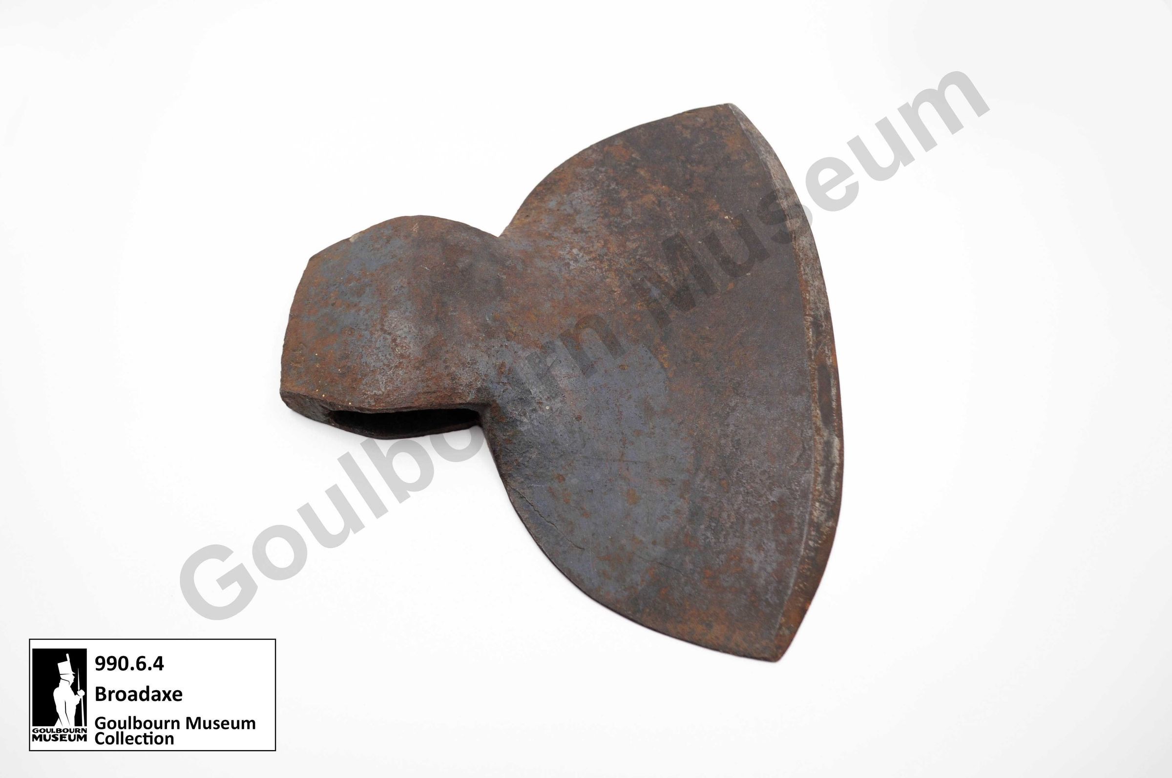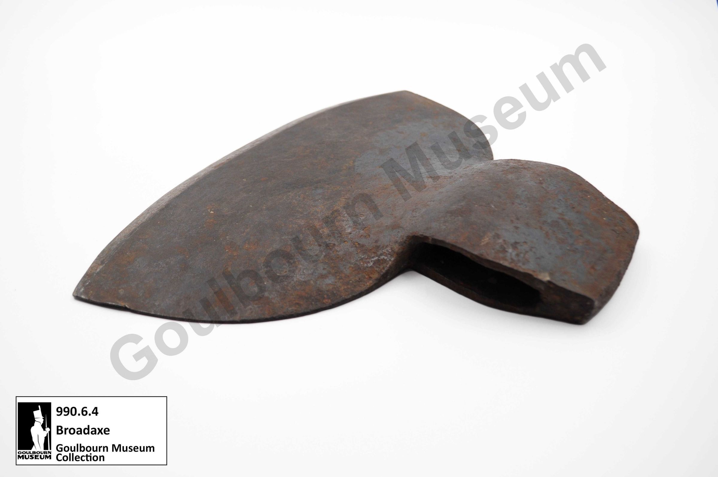 One iron broadaxe head without original handle. The broadaxe is characterized by a wide head, this example extends a total of 33.3cm in length. The broadaxe head is slightly oblong shaped with one sharpened cutting edge along the length. The eye of the broadaxe where the handle was once inserted is opposite the cutting edge. The reverse of the head is flat whereas the face has raised detail.