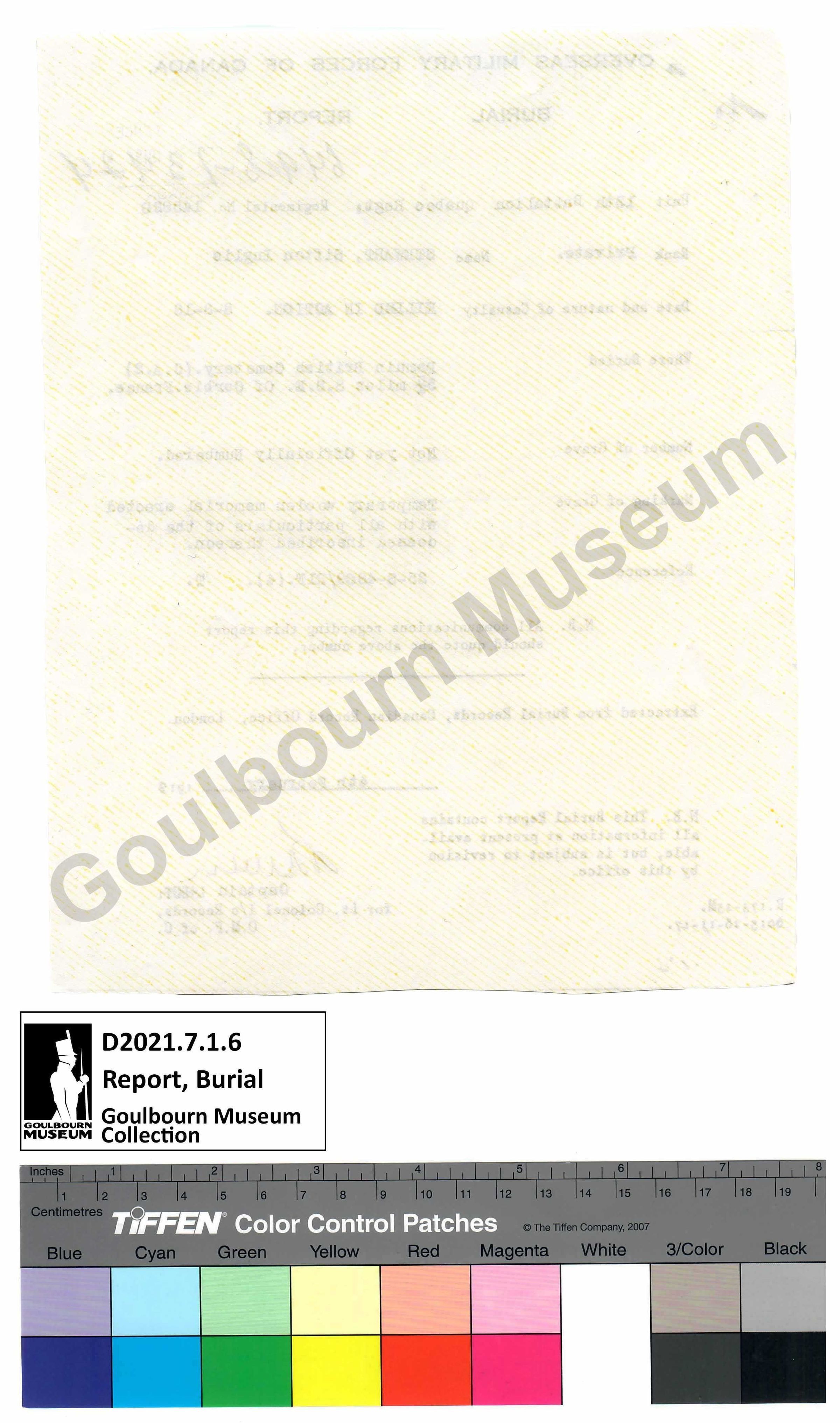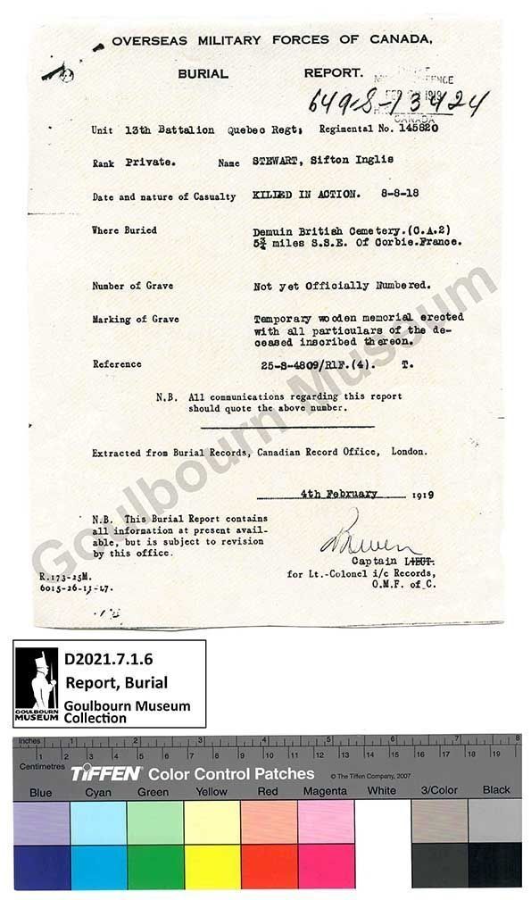 Digital Artifact: One typed document, 1 page. Overseas military Forces of Canada Burial Report - Private Stewart, Sefton Inglis.Context
