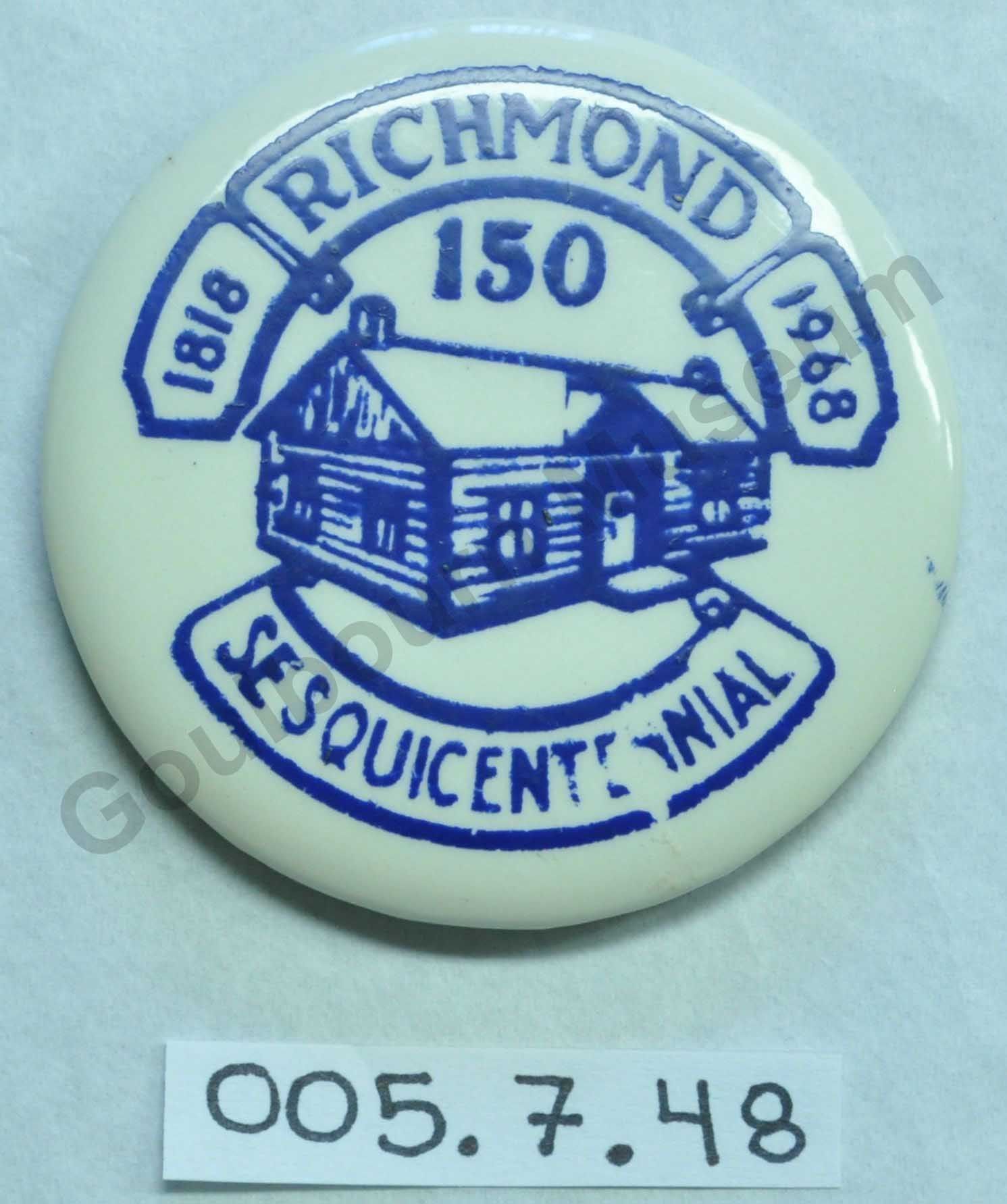Round white pin with metal clasp on reverse. Text around the circumference reads: "Richmond Sesquicentennial, 1818-1968." An image of a log structure appears in the centre.