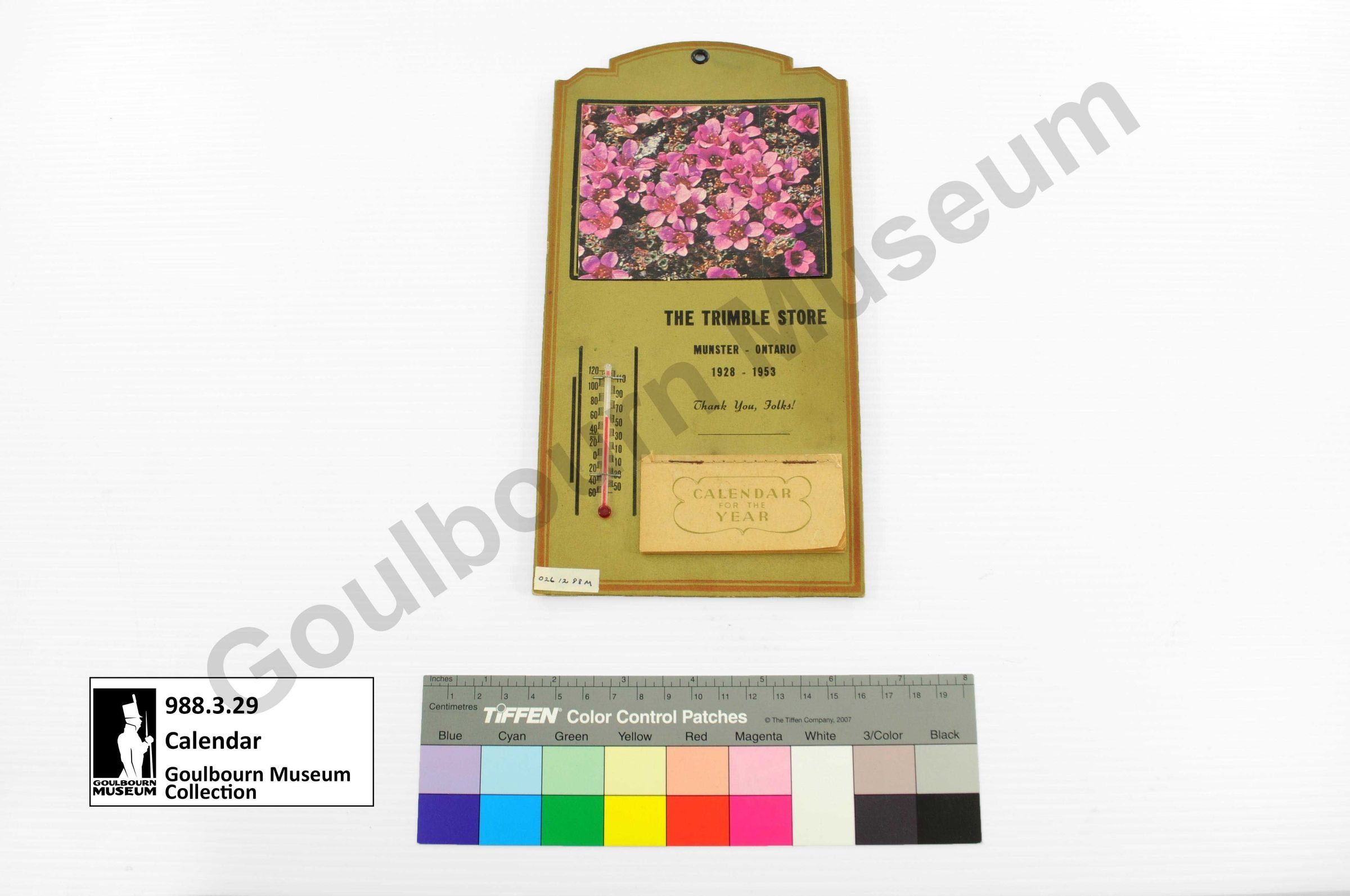 Cardboard calendar for The Trimble Store; text reads: "The Trimble Store, Munster, Ontario, 1928-1953, Thank You, Folks!" A photograph of purple flowers is glued to the space above the text; a calendar for 1953 appears below and a thermometer appears at the left. The metal hole at the top suggests that the board was intended to be hung.Collection