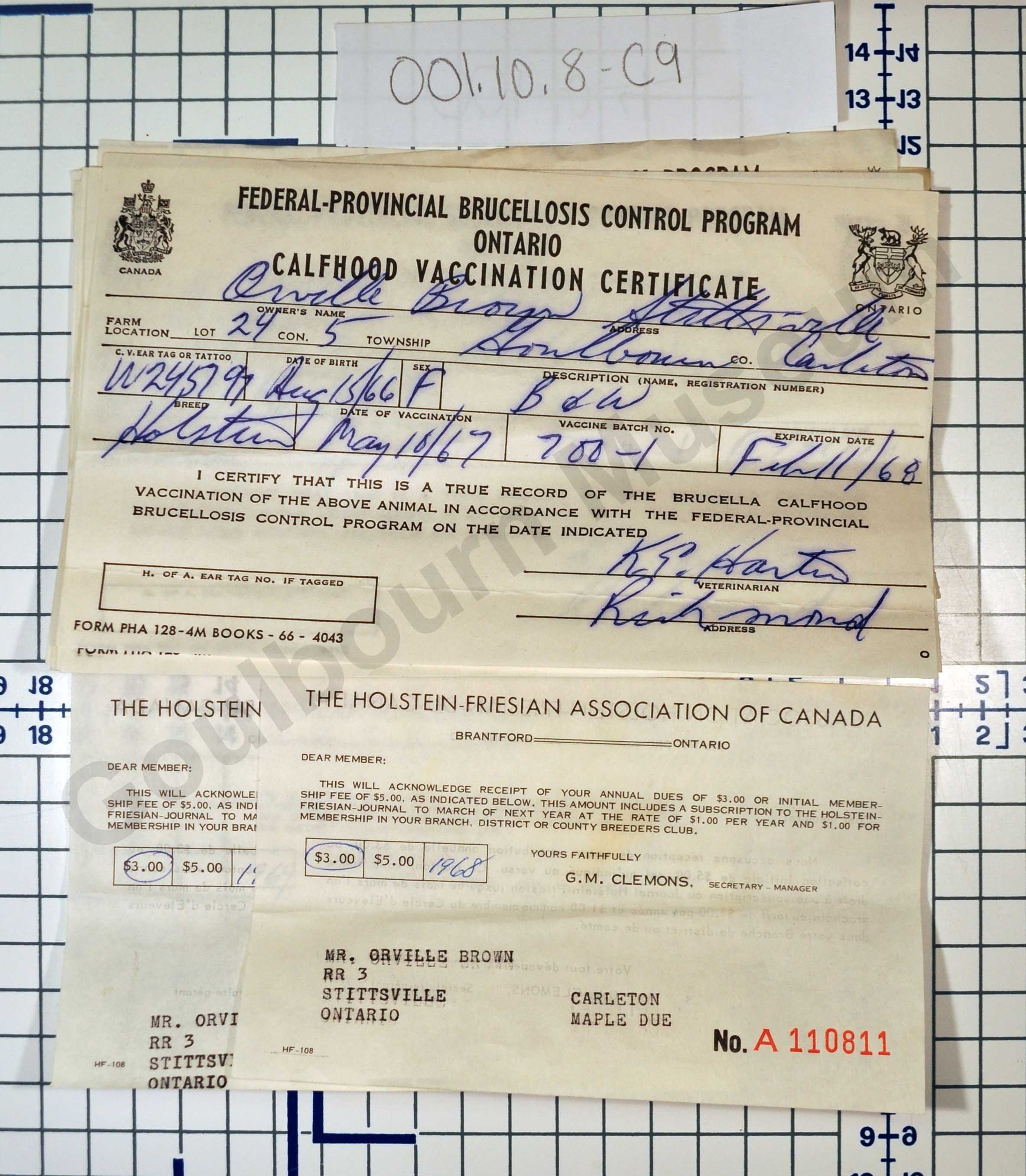 Certificate, Form, Document, Vaccination, Calfhood Vaccination Certificate, Cattle, Agriculture, Farming, Goulbourn, Carleton, Federal-Provincial Brucellosis Control Program, Brucella, Holstein