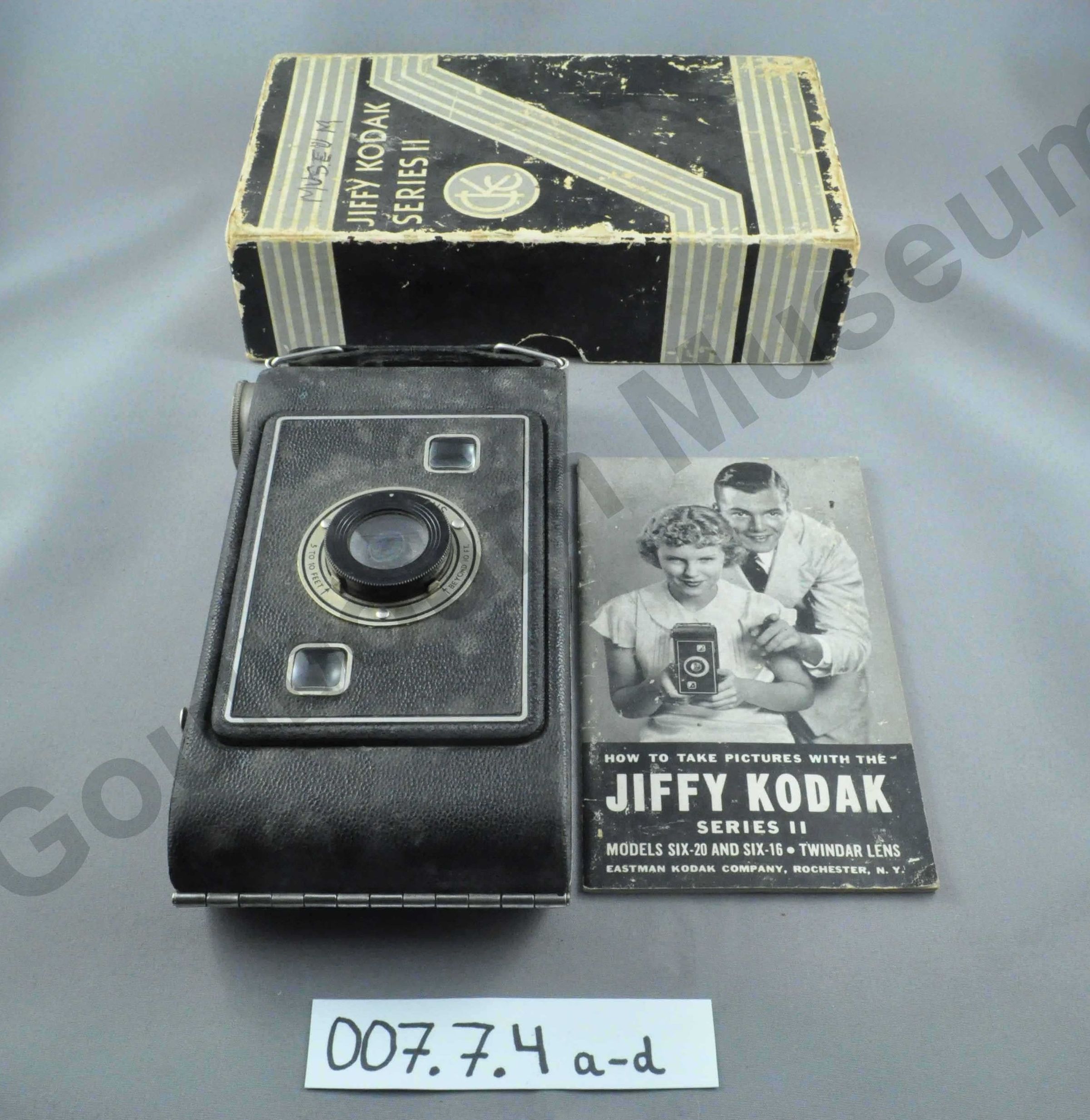b. Manuel for the camera. Written on magazine paper. Titled "How to Take Pictures with the Jiffy Kodak Series II" 23 pages long black and white. Length 13cm Width 8cm. Accession number is written on the inside of the cover. Length 17cm Width 9cm Height 4.5cm. The accession number is written on the inside of the box in pencil.